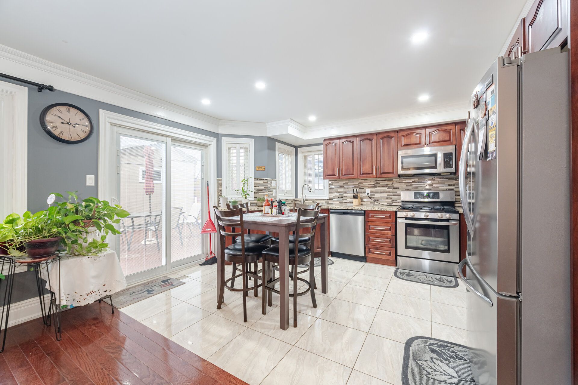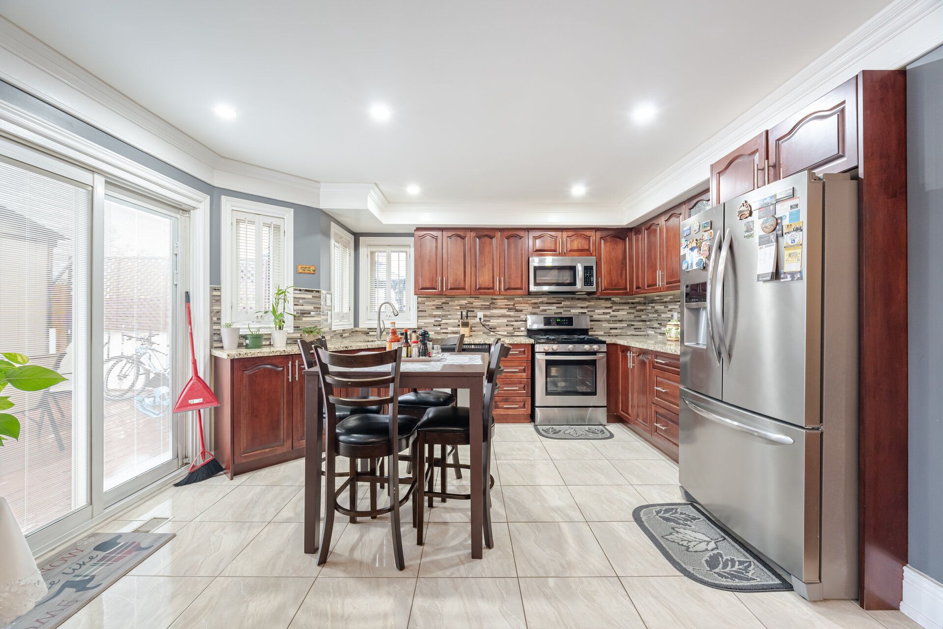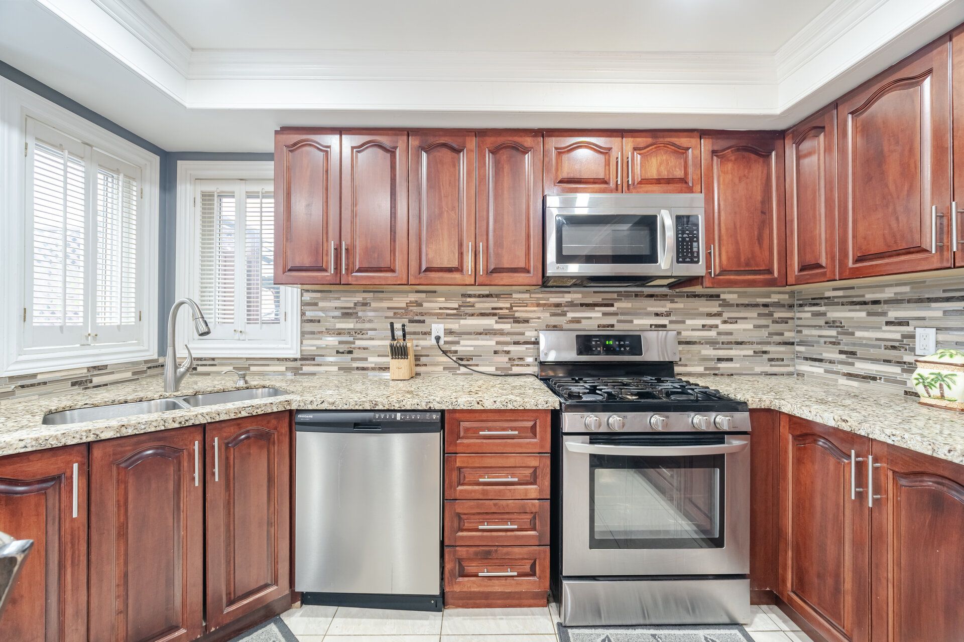 • Modern kitchen featuring granite countertops and stainless steel appliances.