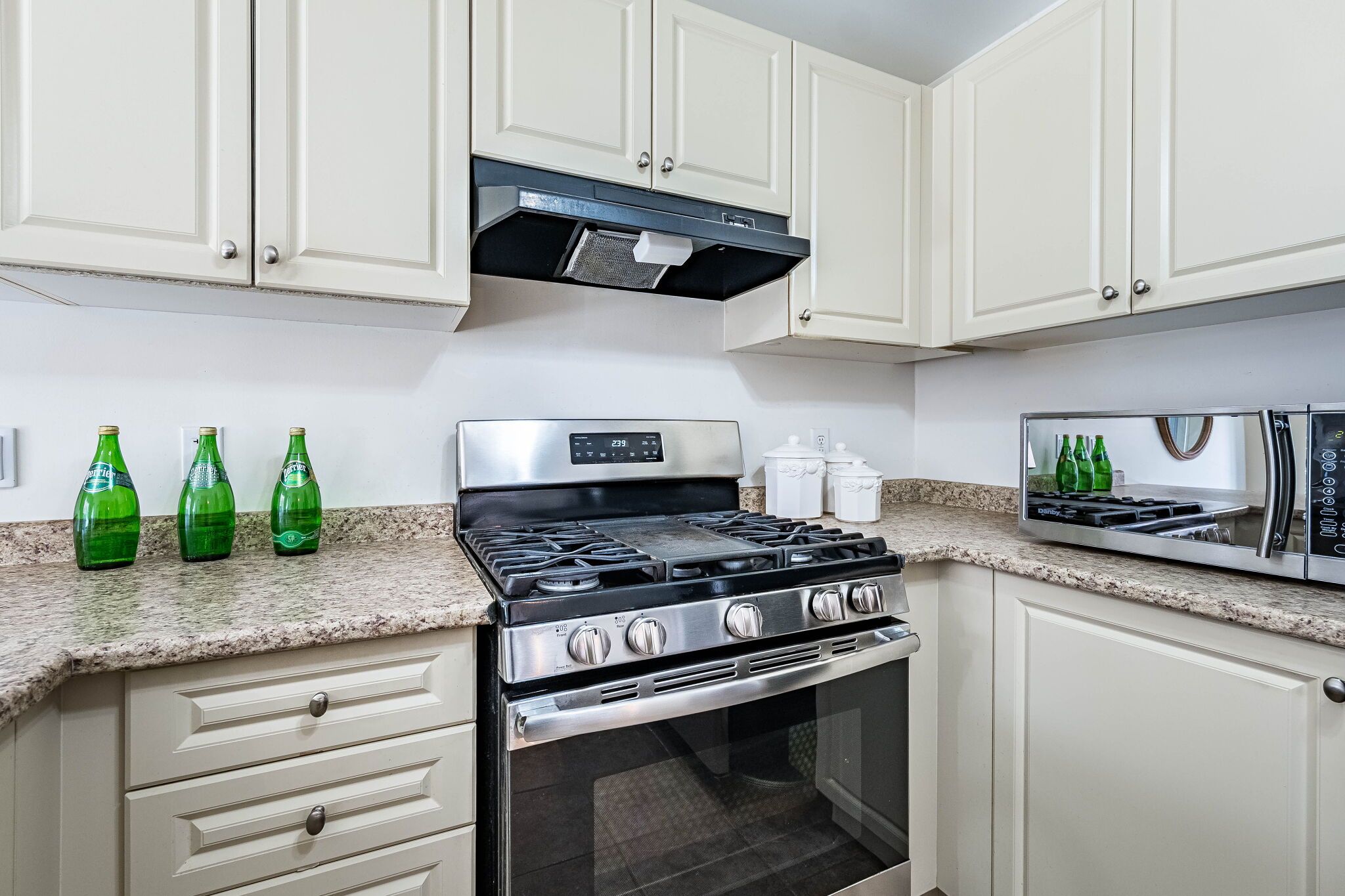 • Chef's kitchen with granite countertops and stainless steel appliances for cooking enthusiasts.
