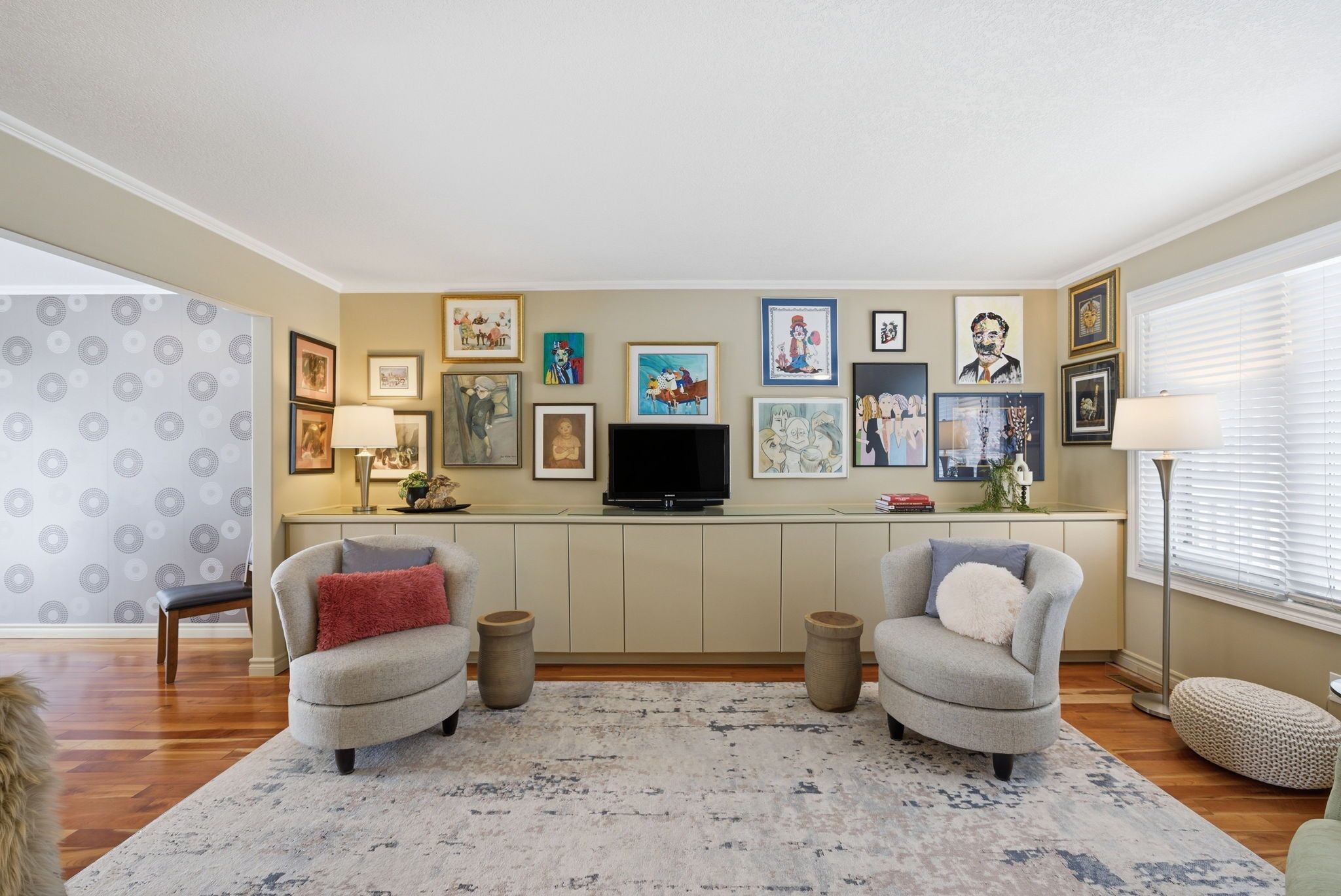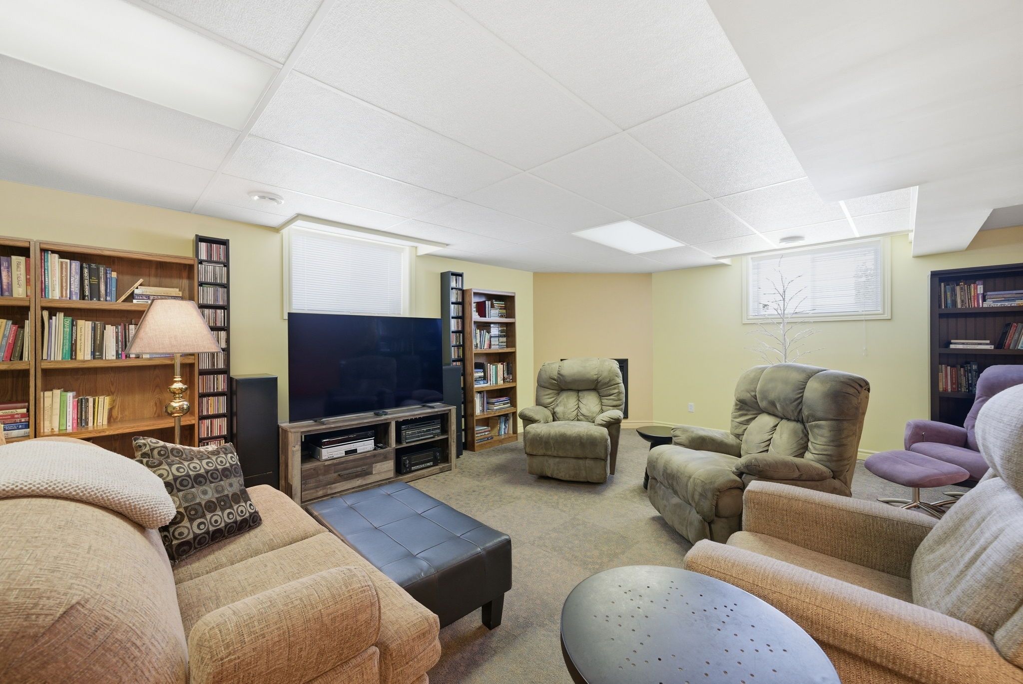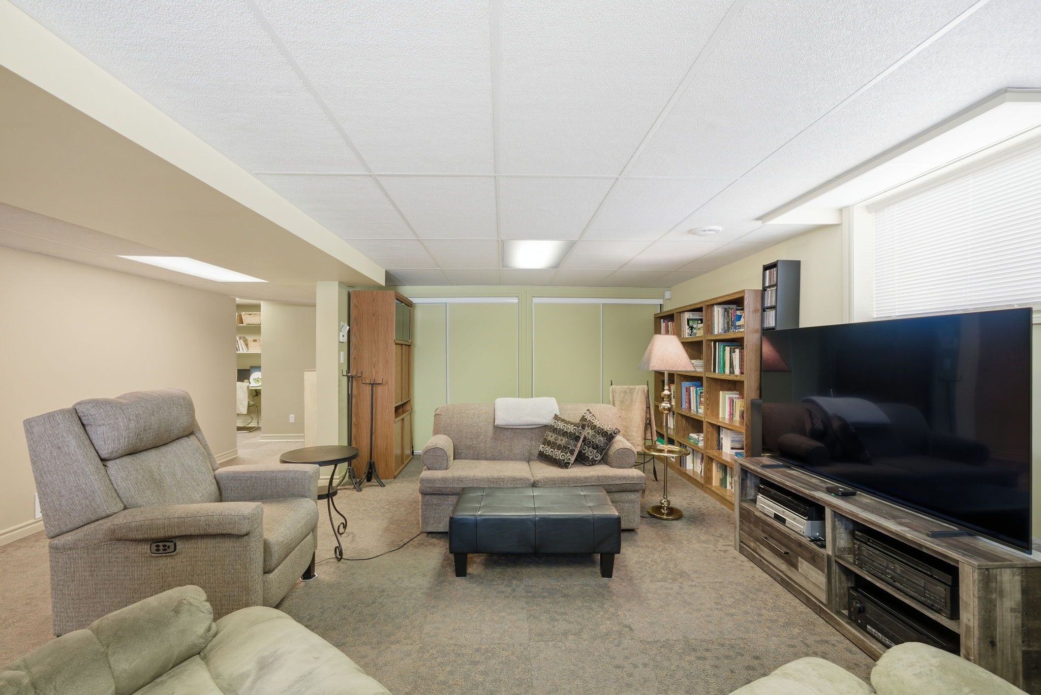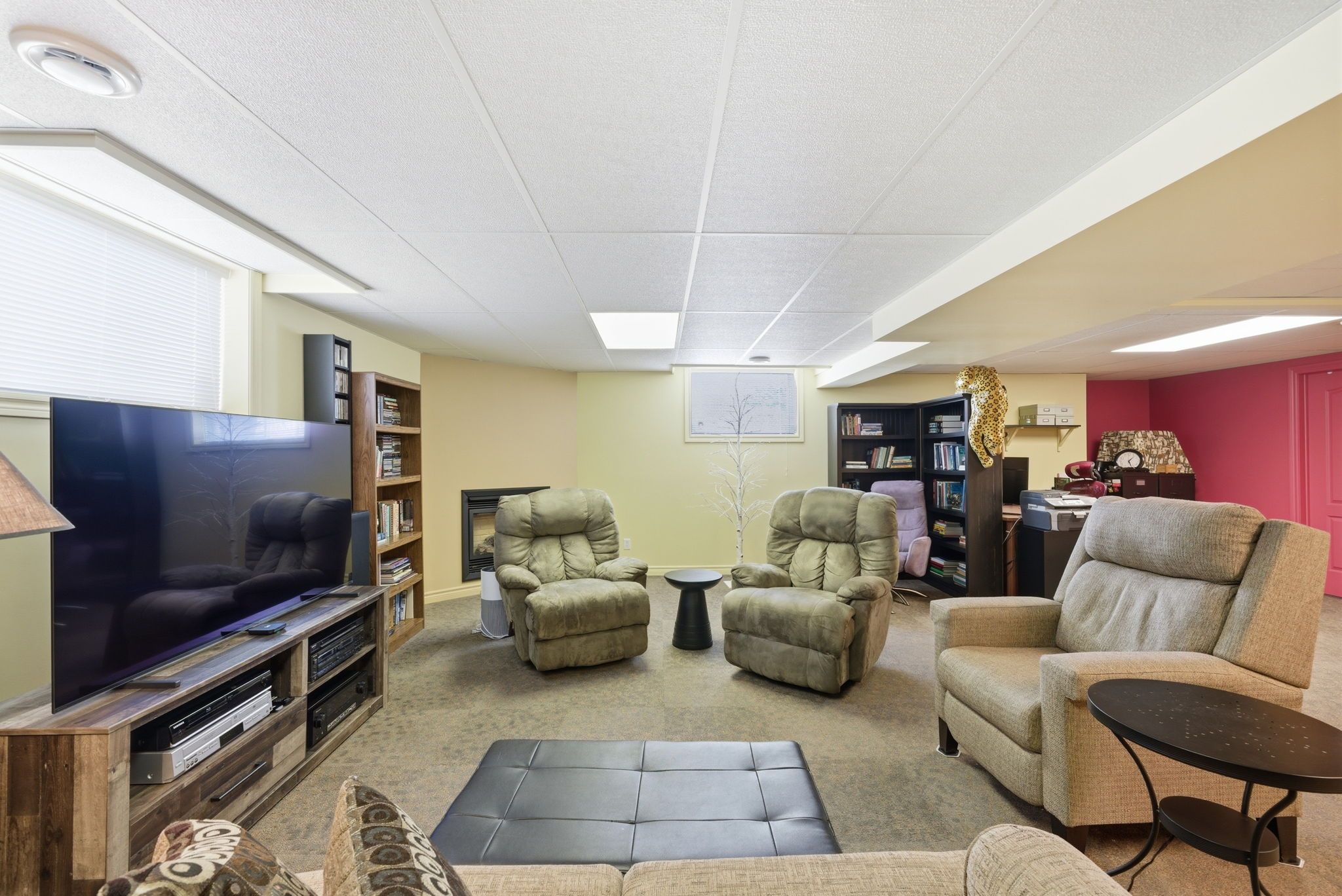 • Finished basement with multiple lounge areas and an office space.