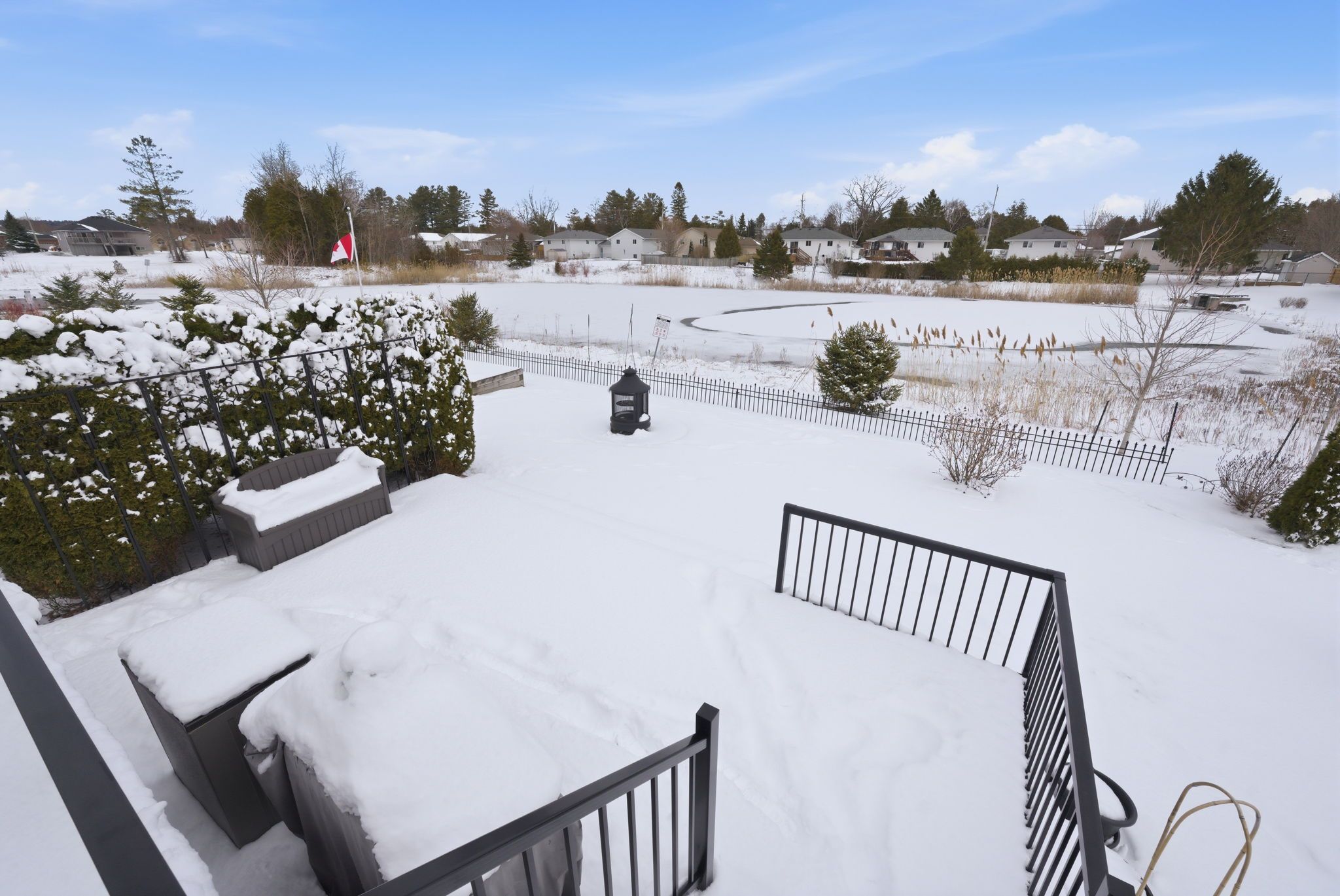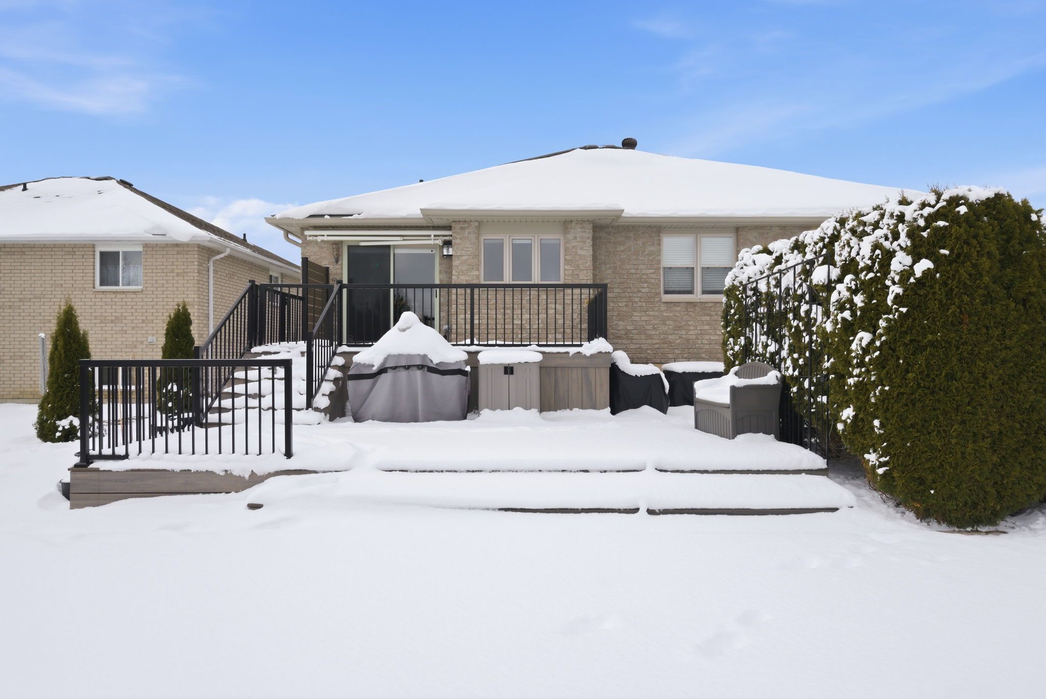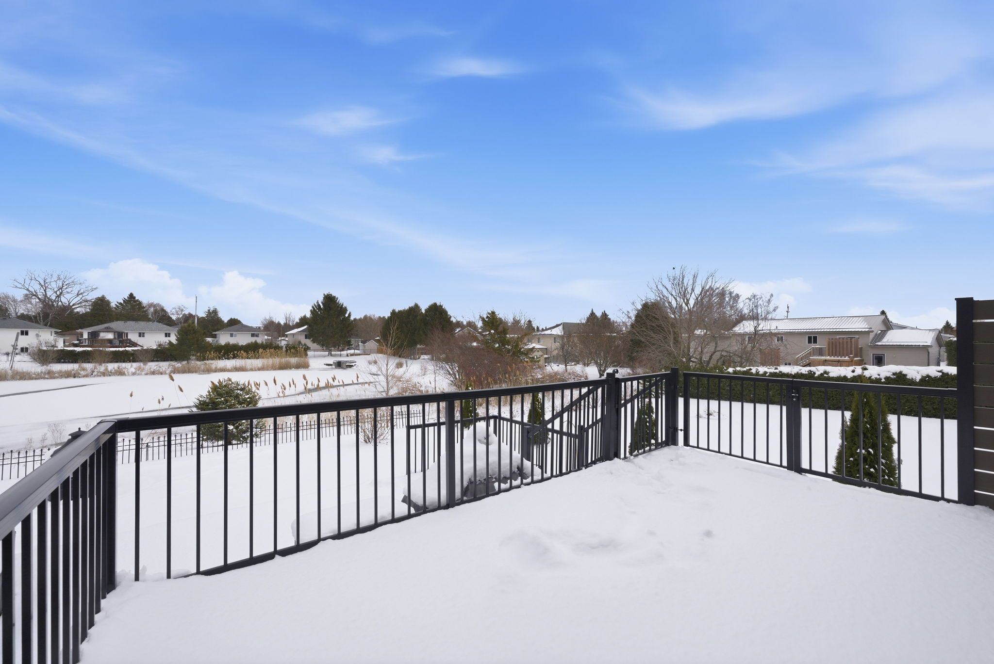 • Two-level composite deck ideal for outdoor gatherings and privacy.