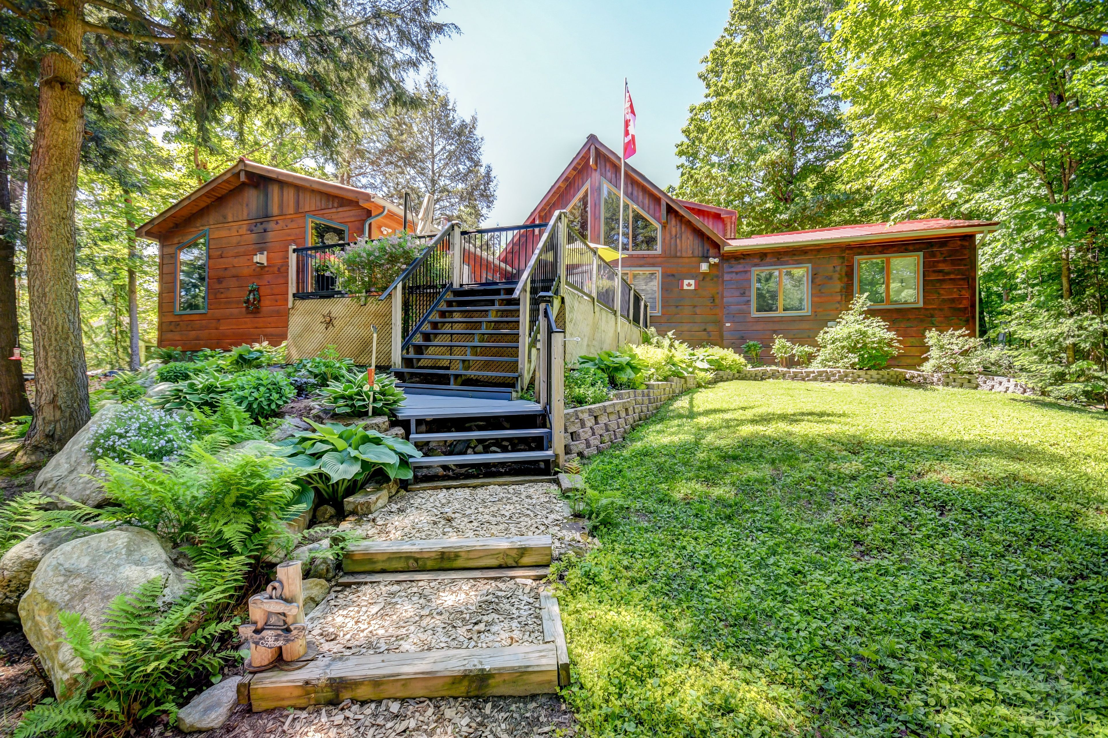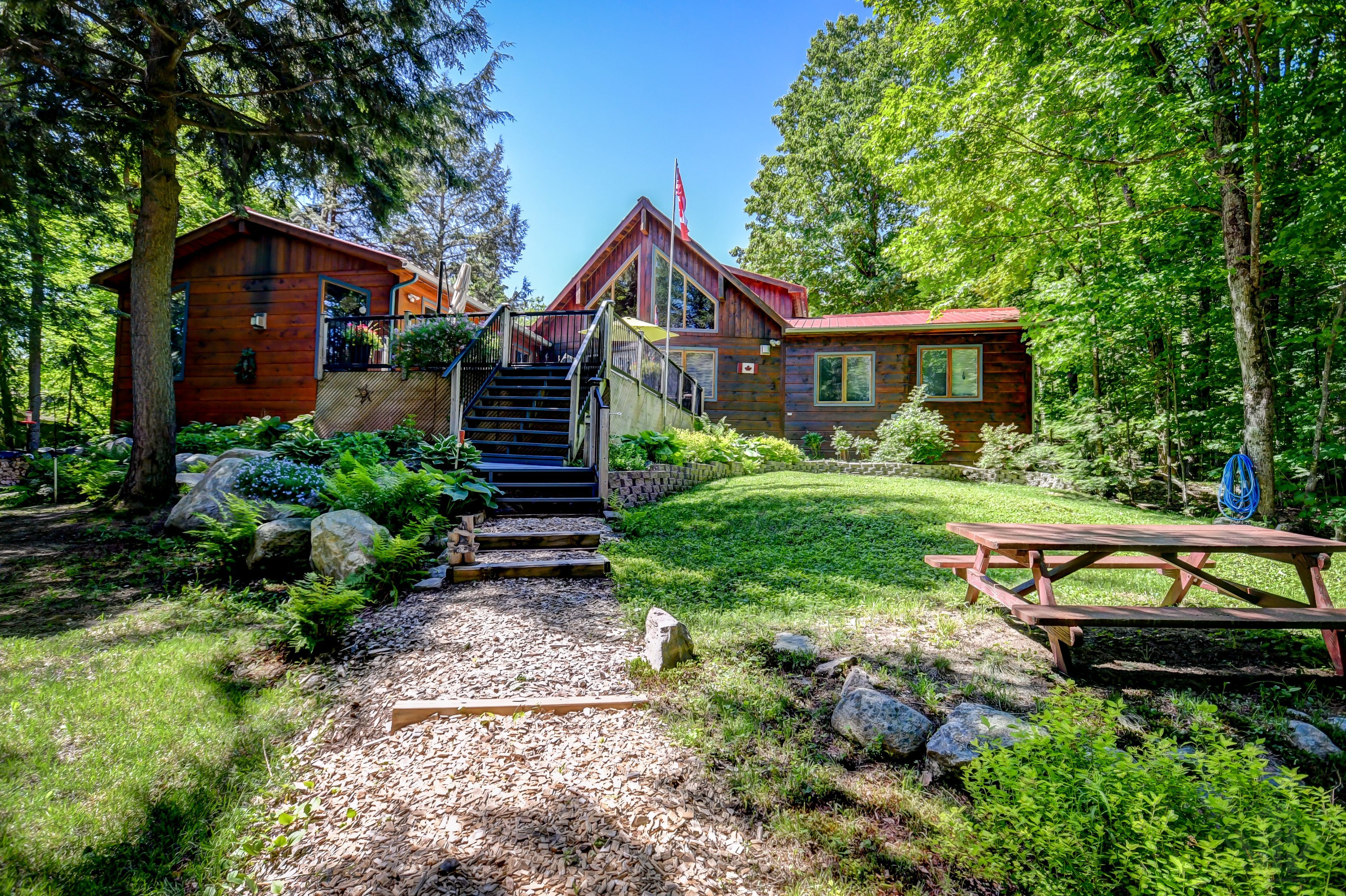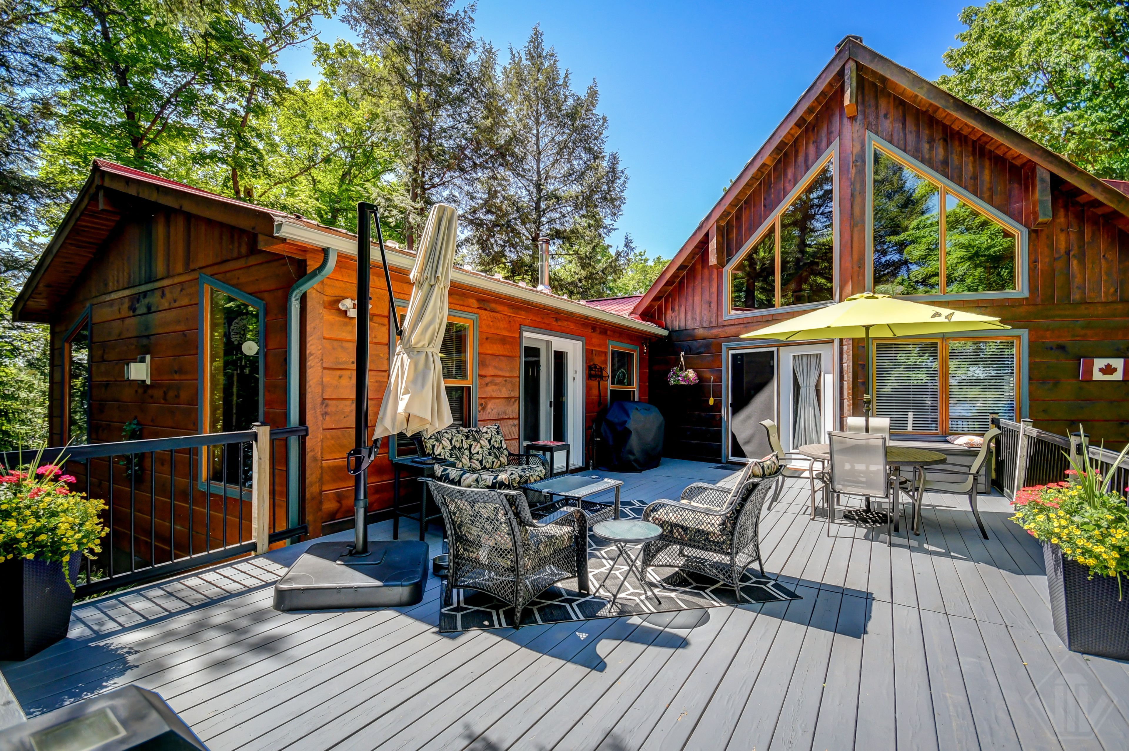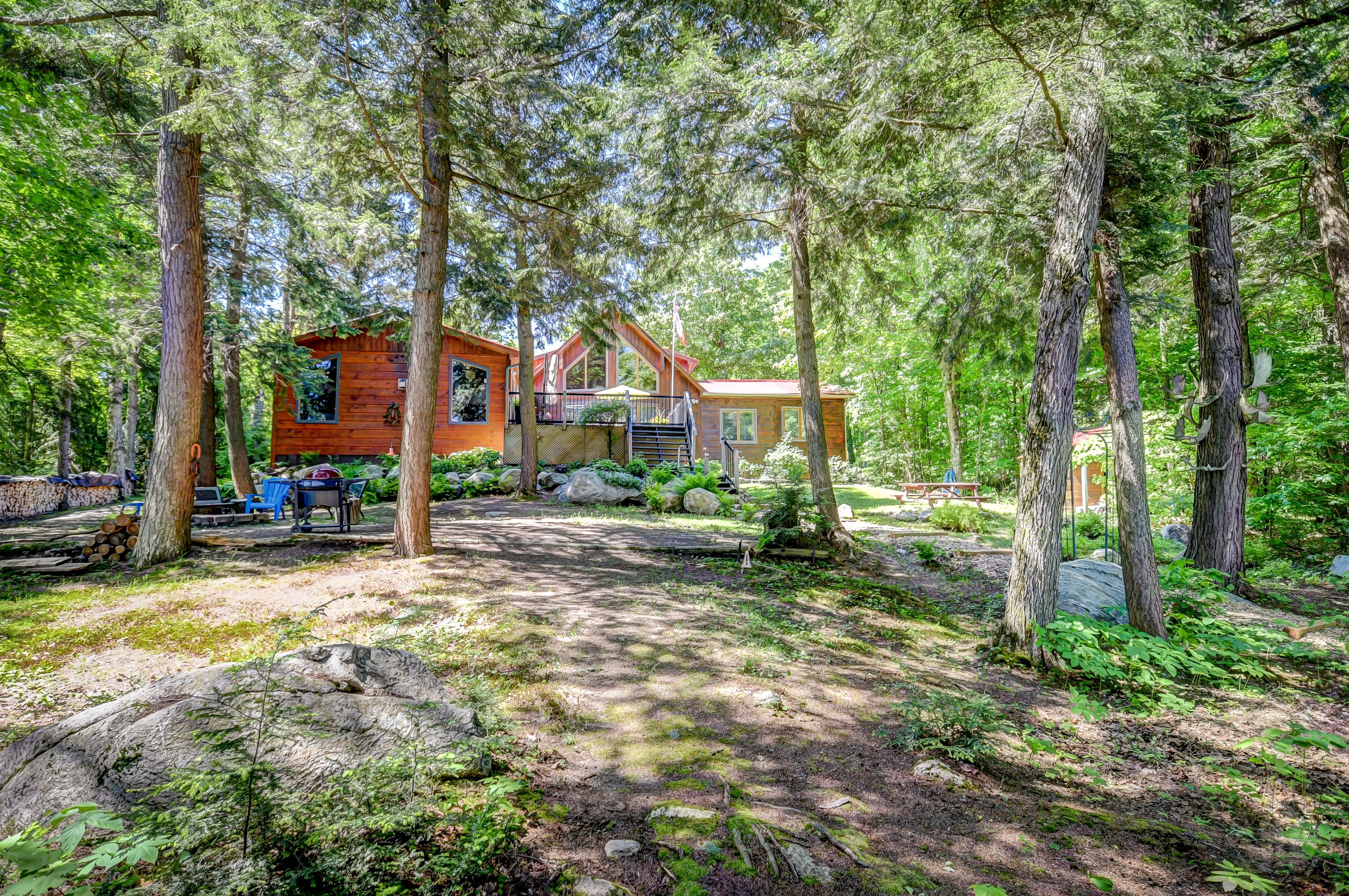 This point-of-land is just over 2 acres in size and has 209 feet of water frontage, providing excellent privacy on beautiful deer lake. Three bedroom, year round home with detached 24 x 28 garage. This home is for those that love the warmth of wood finishings; there is teak flooring, pine walls and douglas fir cathedral ceiling. The kitchen has plenty of cupboards, granite countertops and comes with the appliances. The living room has cathedral ceiling, propane fired, freestanding fireplace and view towards the lake. Main bedroom has a walkin' closet and ensuite bathroom with jet tub and heated floor. One level living here with 3pc bathroom, 2nd bedroom and laundry, also on the main floor. The family room boasts a floor to ceiling fireplace and this room can accommodate nicely for gatherings of family and friends with its direct access to the deck. The loft partially looks over the living room and acts as both 3rd bedroom on one side and sitting area on the other. Just outside the screened in porch is a patio with view of both vegetable and flower gardens. The home was built in 2000, it has a 16kw on-demand generator, domestic water is from a drilled well and connected to a septic system. The two car garage has accommodations above and a carport for extra covered storage. Other outbuildings include: a 8 x 8 sauna and 13 x 20 driveshed. All buildings have matching metal roof. This property is in the unincorporated/unorganized township of lount with year round road access. Ofsc snowmobile trail c105d runs the length of deer lake, providing excellent access to the local trail system. Deer lake is located north of hwy 124 and west of hwy 11 and the villages of sundridge and south river.