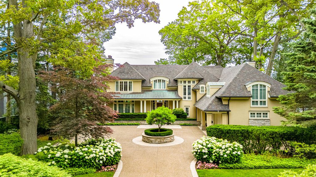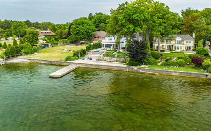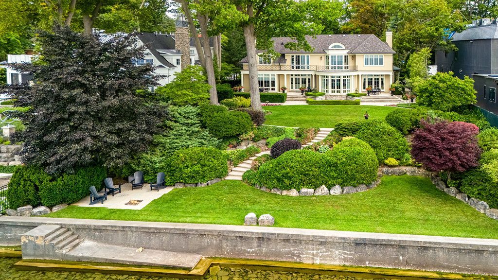 This exquisite french chateau-style estate, designed by gren weis, is gracefully positioned on a prestigious waterfront parcel with coveted riparian rights, in one of south-east oakville's most sought-after enclaves. With breathtaking views of lake ontario and a rare sense of privacy, this residence offers an unparalleled lifestyle of elegance and tranquility. Masterfully designed to blend classical architecture with modern functionality and refined interiors. From richly detailed millwork, ceiling details, radiant heated flrs to upgraded light fixtures, every finish has been thoughtfully curated to reflect timeless sophistication. Expansive principal rooms with lake vistas provide a stunning backdrop for both grand entertaining and intimate family living. The main level is anchored by a magnificent living room with double french doors that welcome in the lake breeze, a show stopping solarium, formal dining room, a gourmet kitchen with professional appliances, prep kitchen, and sunlit family room with waffle ceilings. The second level features a serene primary suite with spa-inspired ensuite and dressing room, 3 additional bedrooms, 2 bathrooms, and a beautifully appointed library offering sweeping views of the water. The lower level offers exceptional scale and light with full-size windows, radiant floors, a recreation room with wet bar, fitness room with adjacent full bathroom, guest suite with ensuite, and abundant storage ideal for extended family or hosting with ease. Your private garden offers lush, manicured grounds and is framed by the natural beauty of the lake. Multiple walkouts to the yard and easy access to the shoreline make this property a rare offering. Launching your paddle board or canoe couldn't be easier. Just steps to gairloch gardens and moments from the boutiques, fine dining, and cultural richness of downtown oakville, as well as top-tier private and public schools, this estate presents a lifestyle defined by elegance, ease, and enduring value.