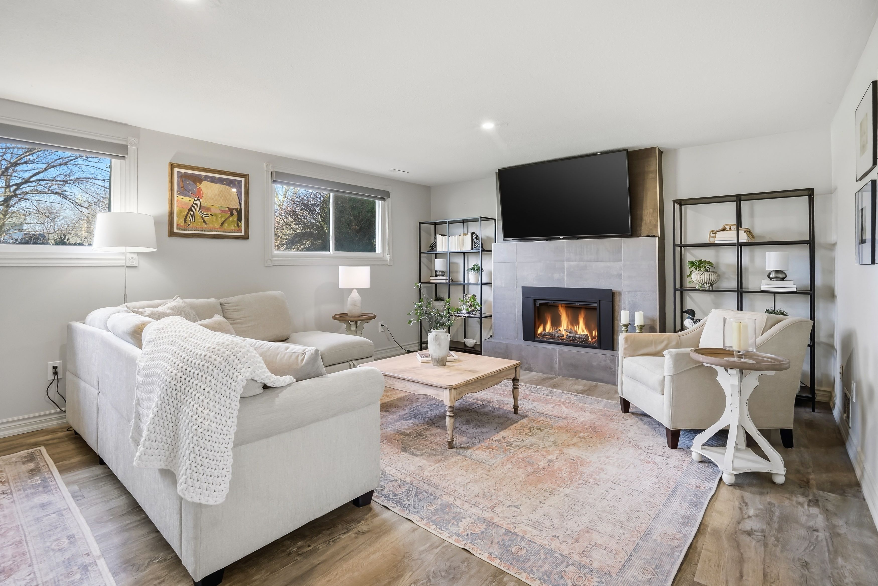 • Cozy lower level with fireplace and separate entrance for flexible living.