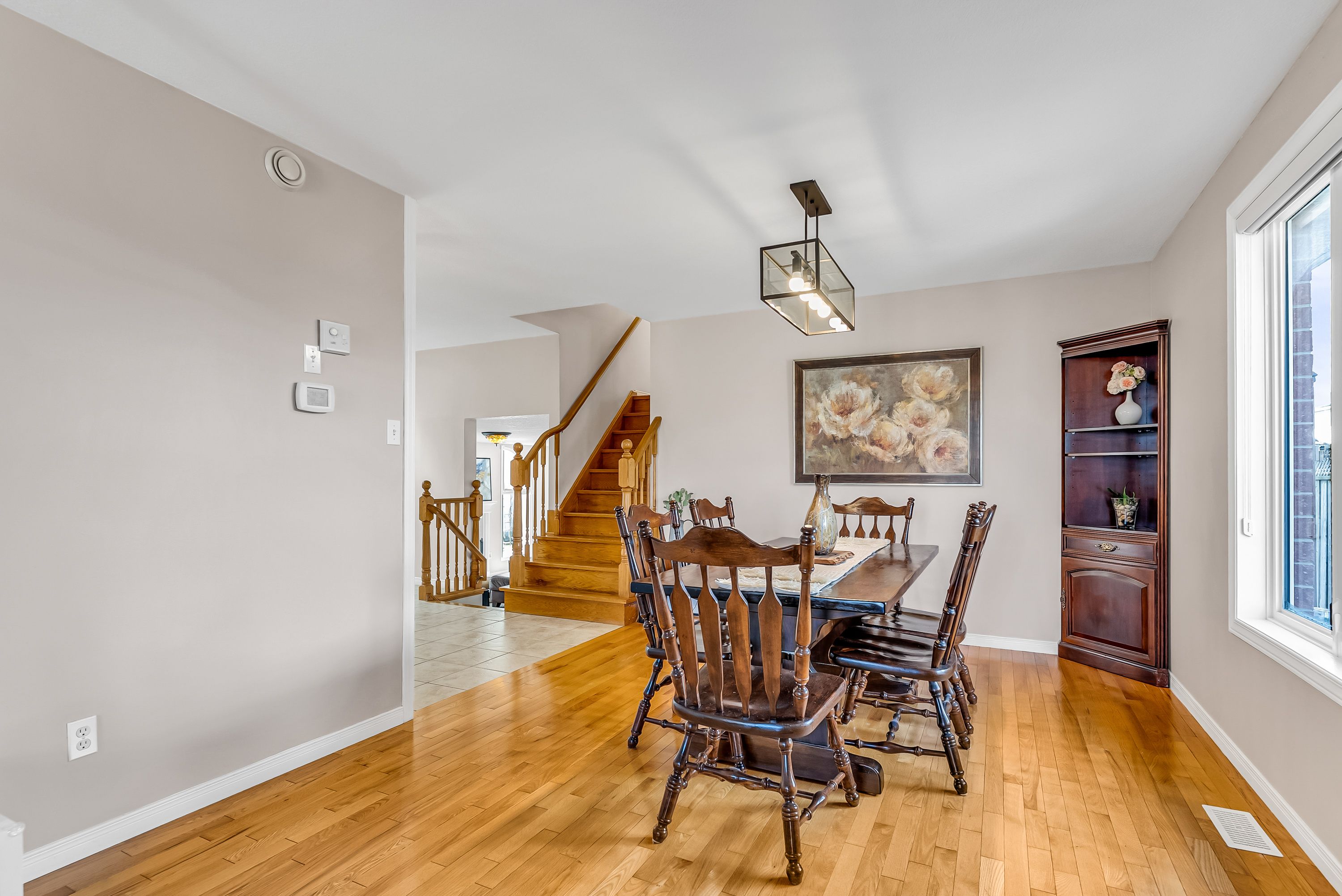 • Bright living and dining area with hardwood flooring and a large window.