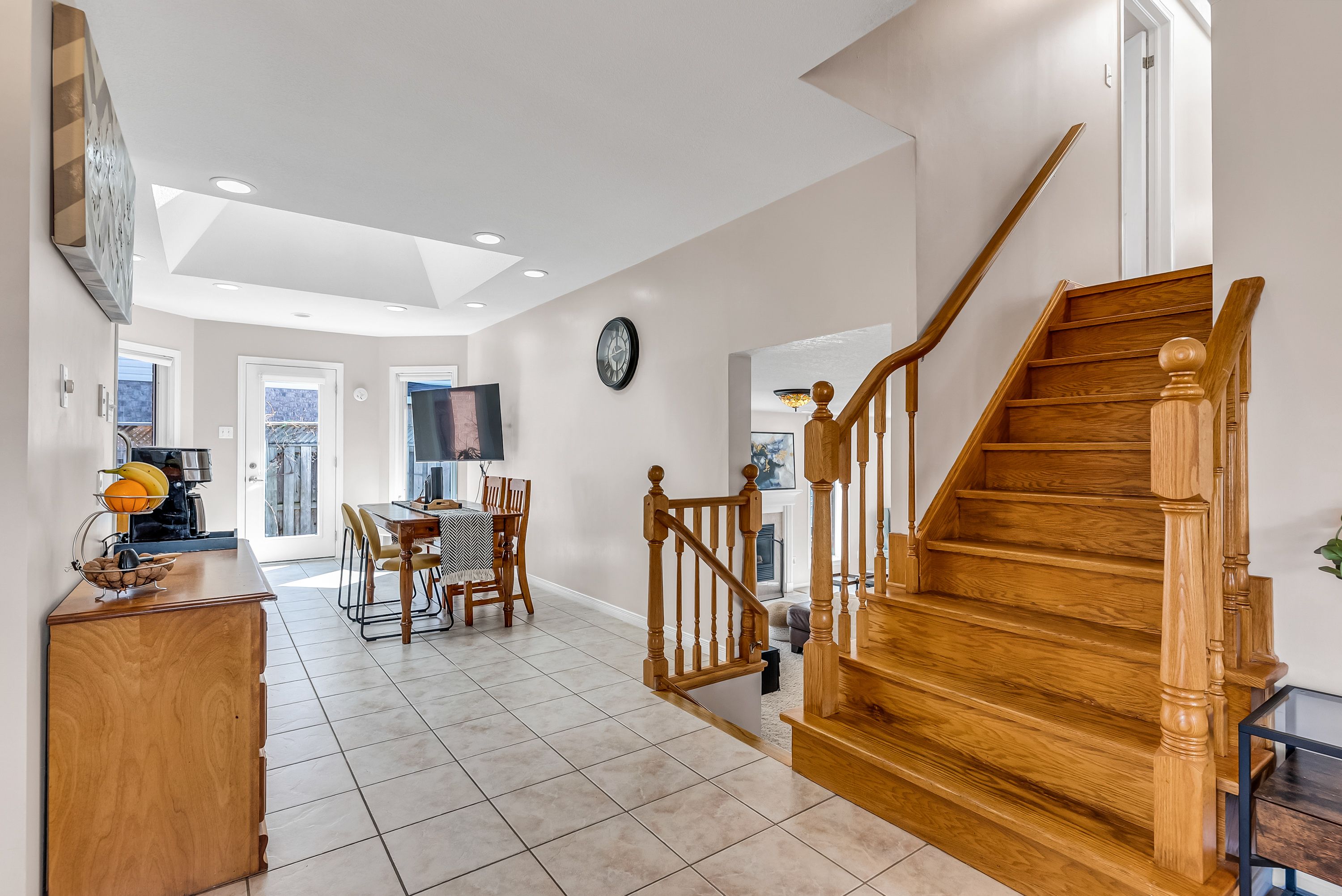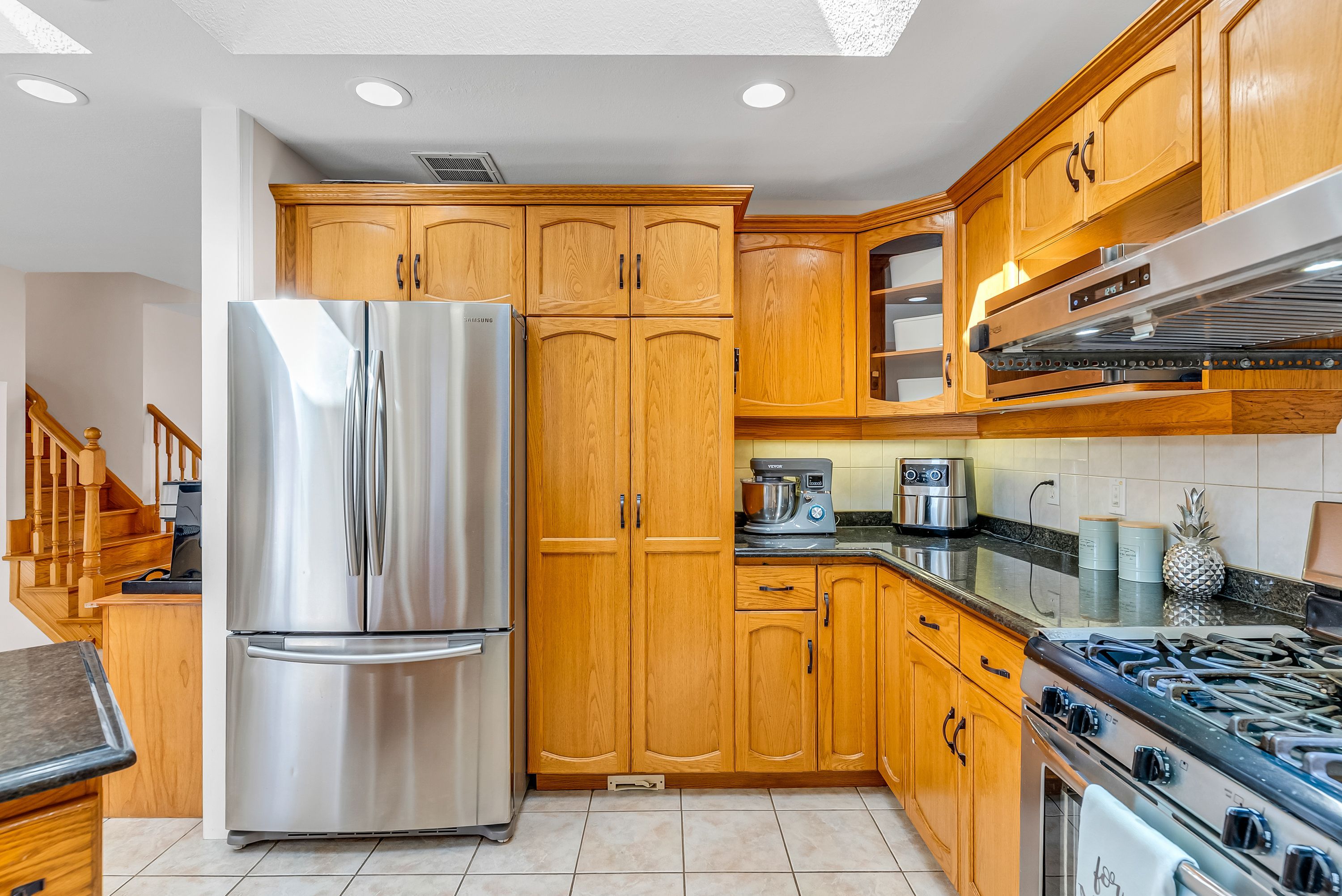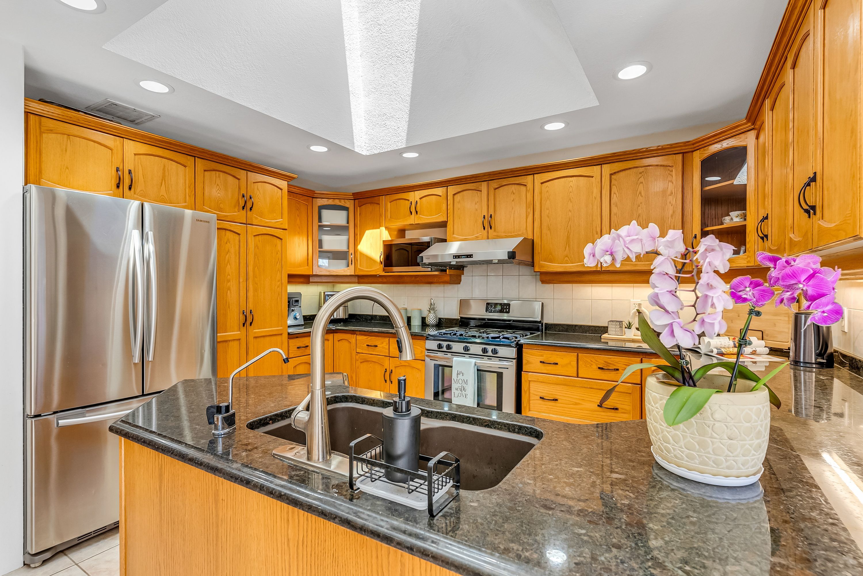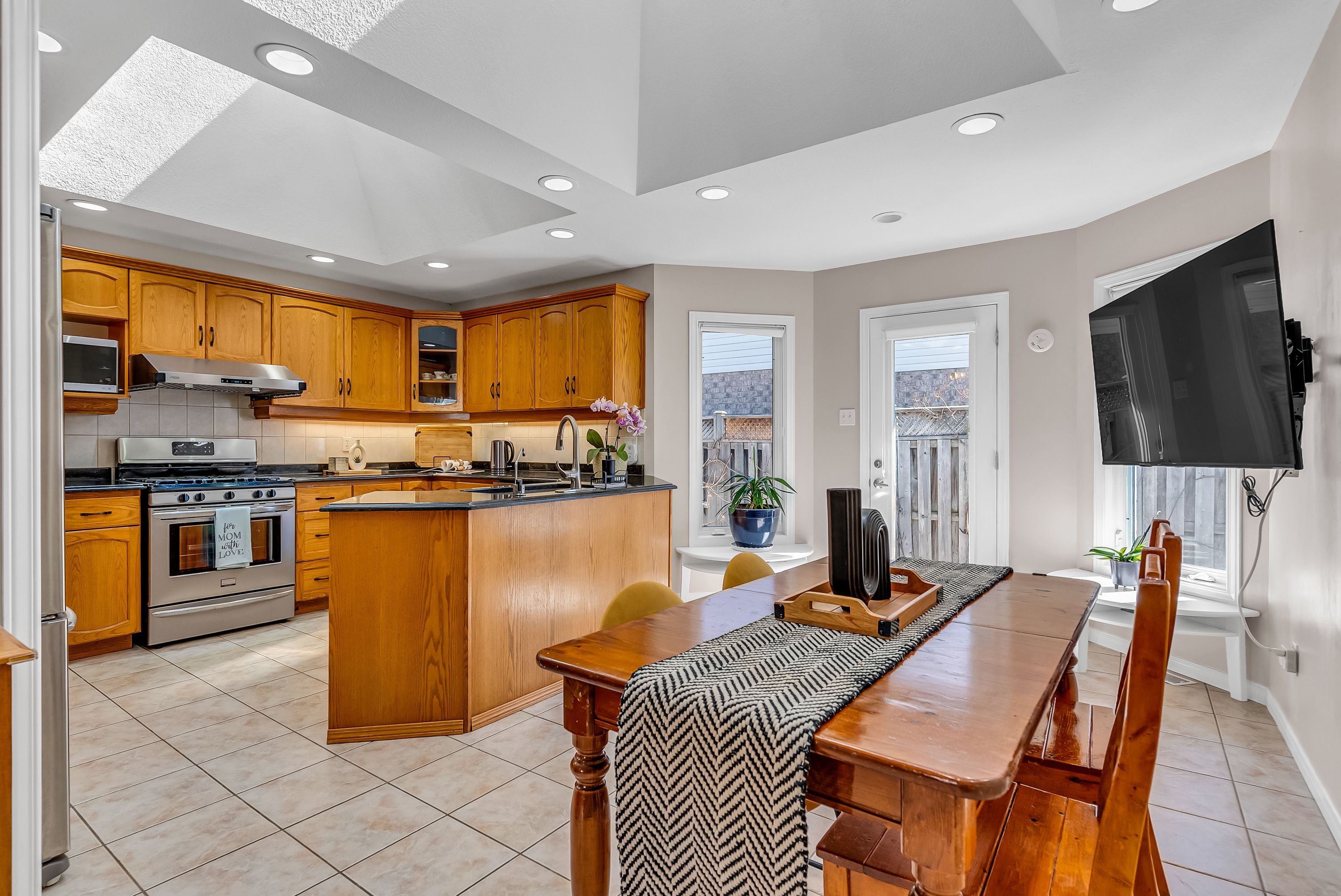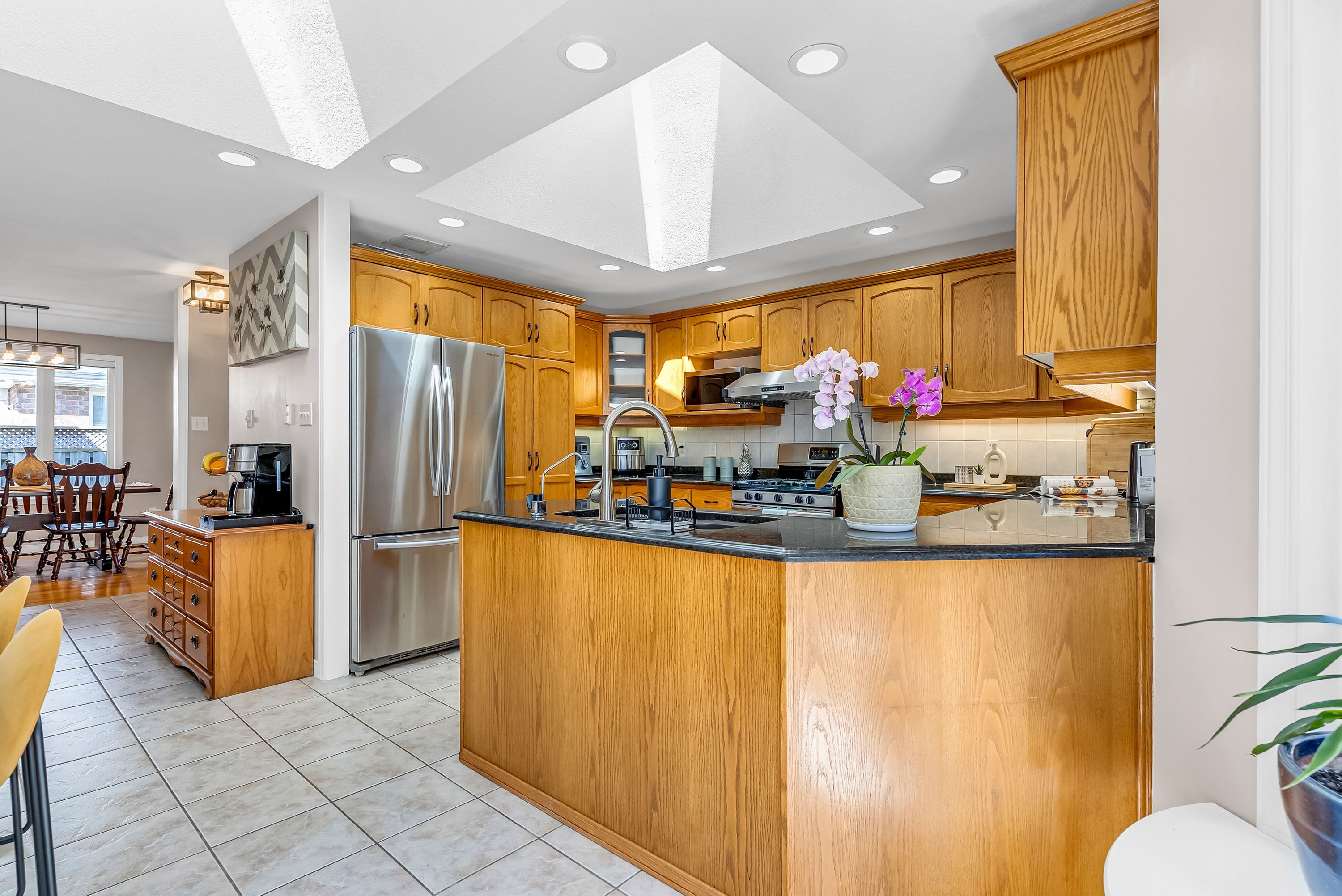 • Stylish eat-in kitchen with granite counters and two skylights.
