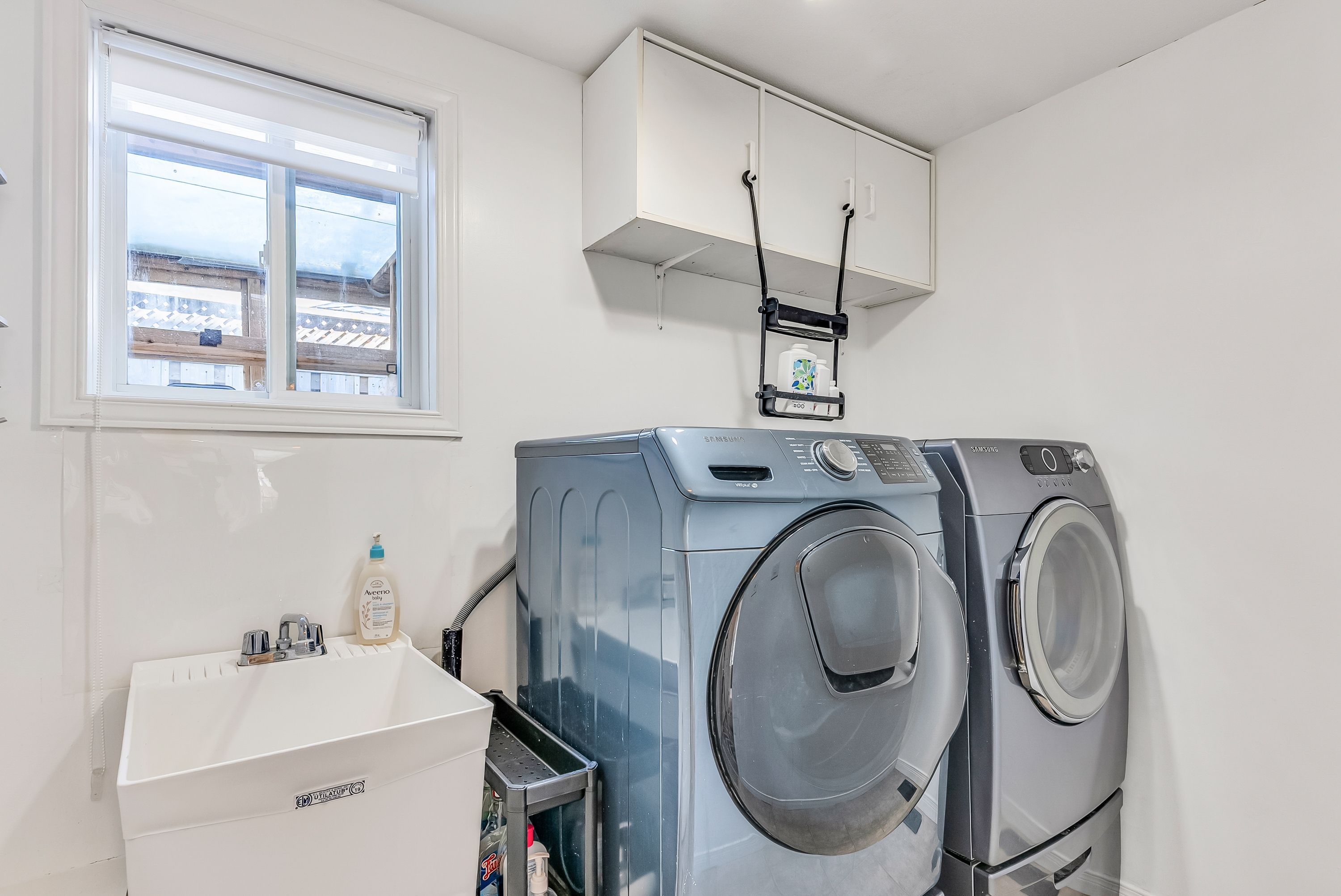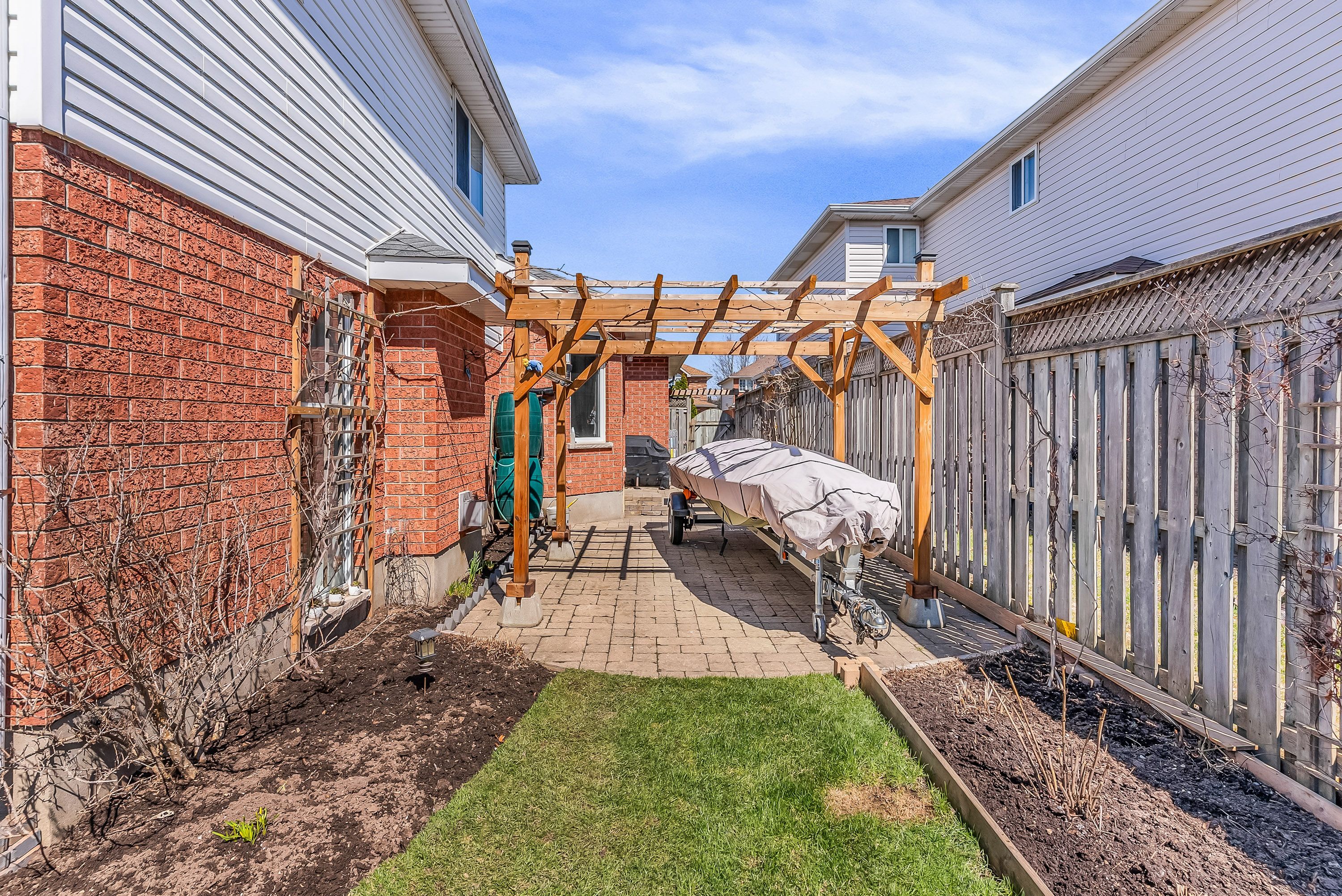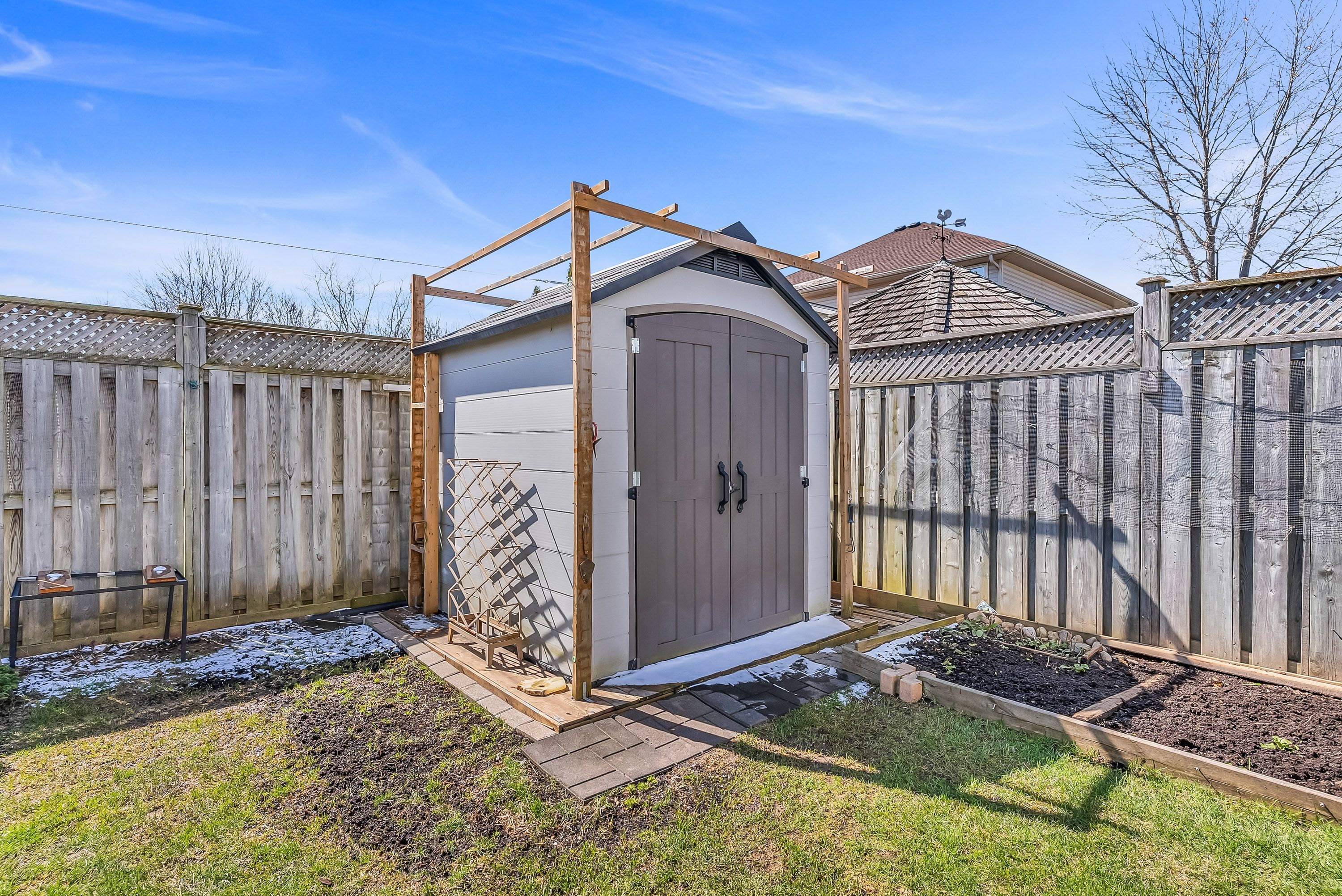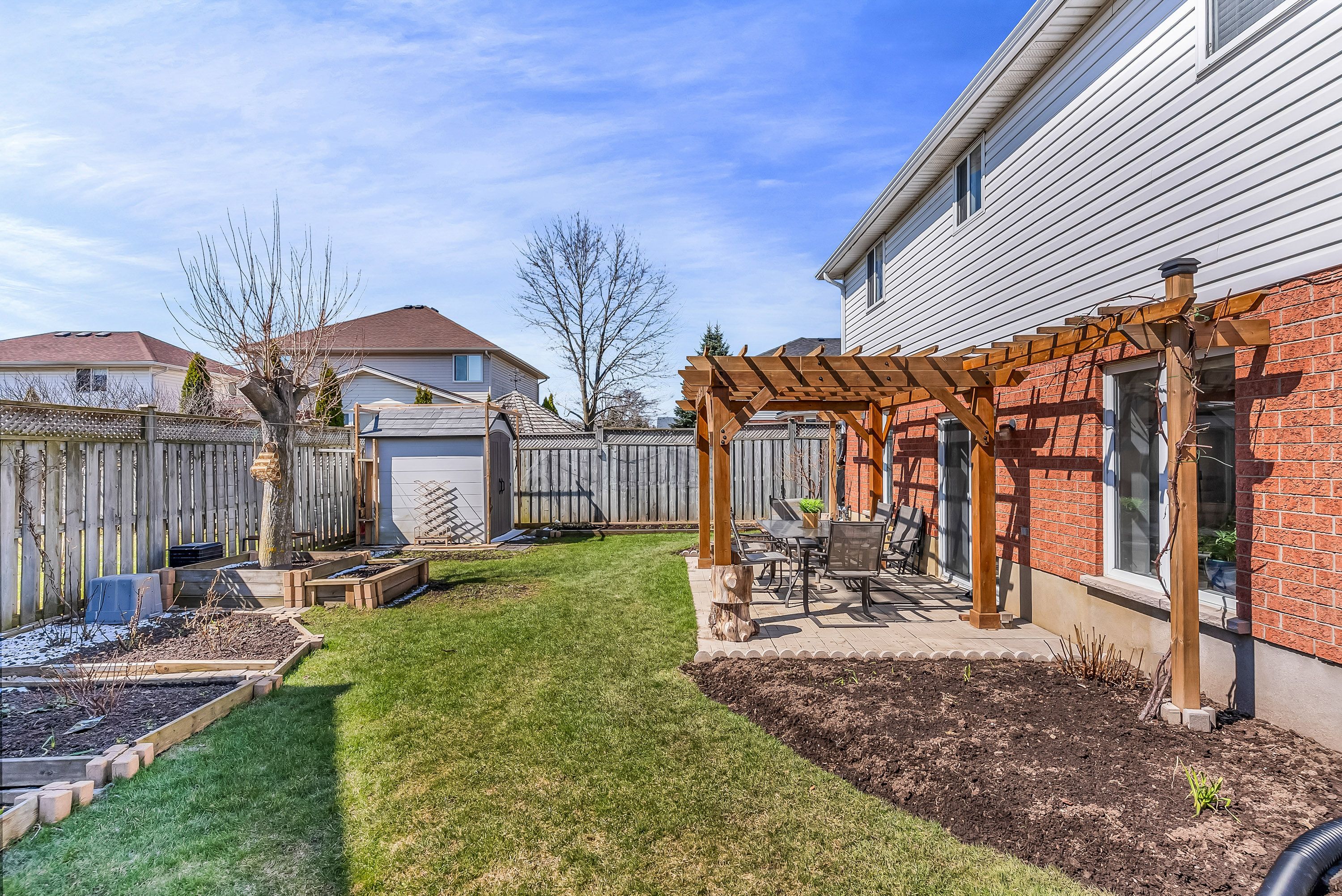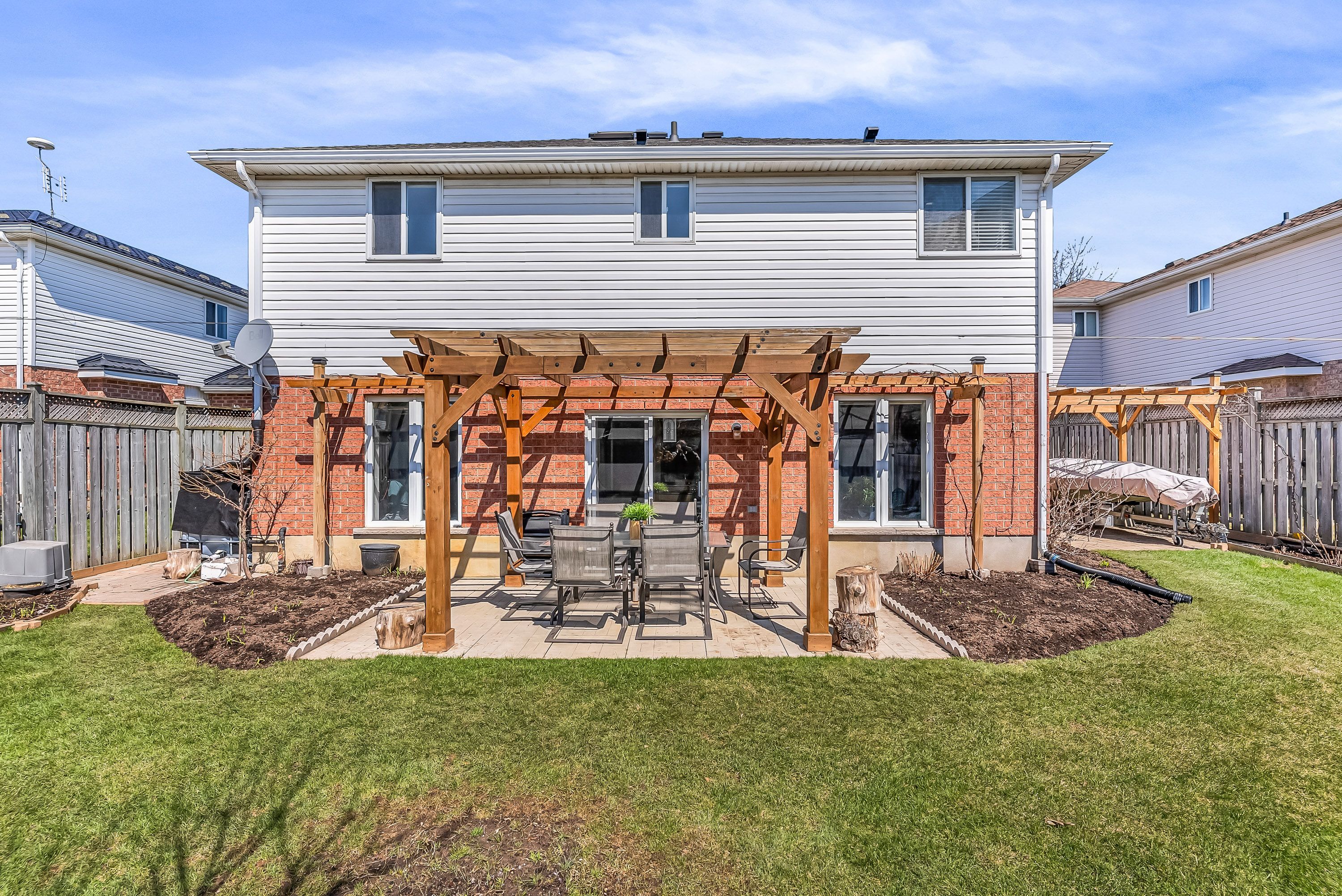 • Fully fenced backyard oasis with a stone patio for outdoor enjoyment.