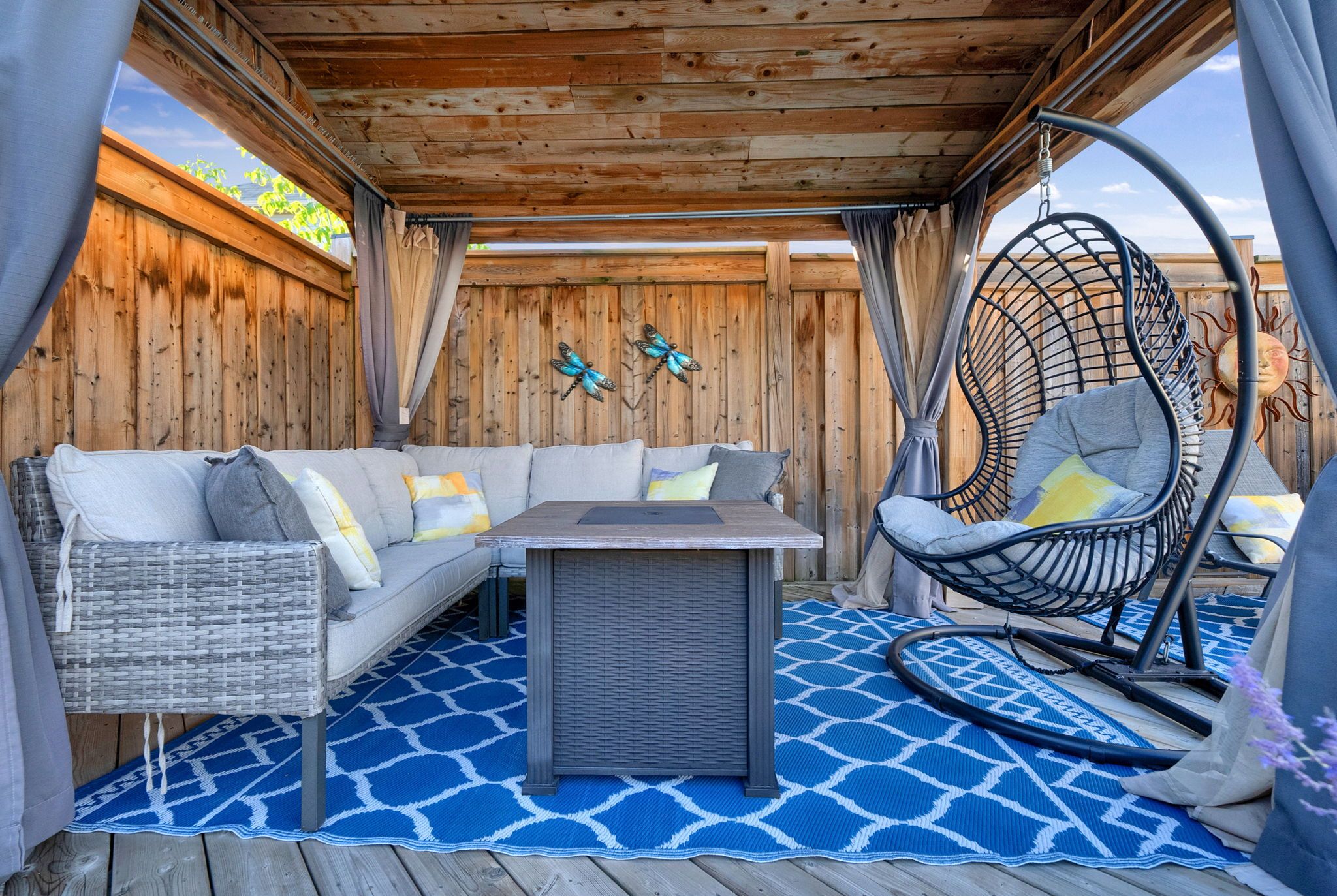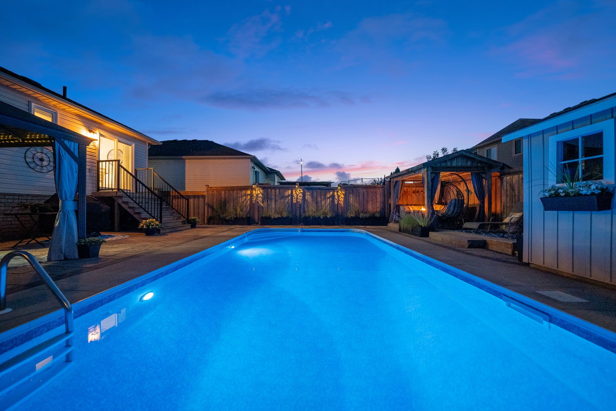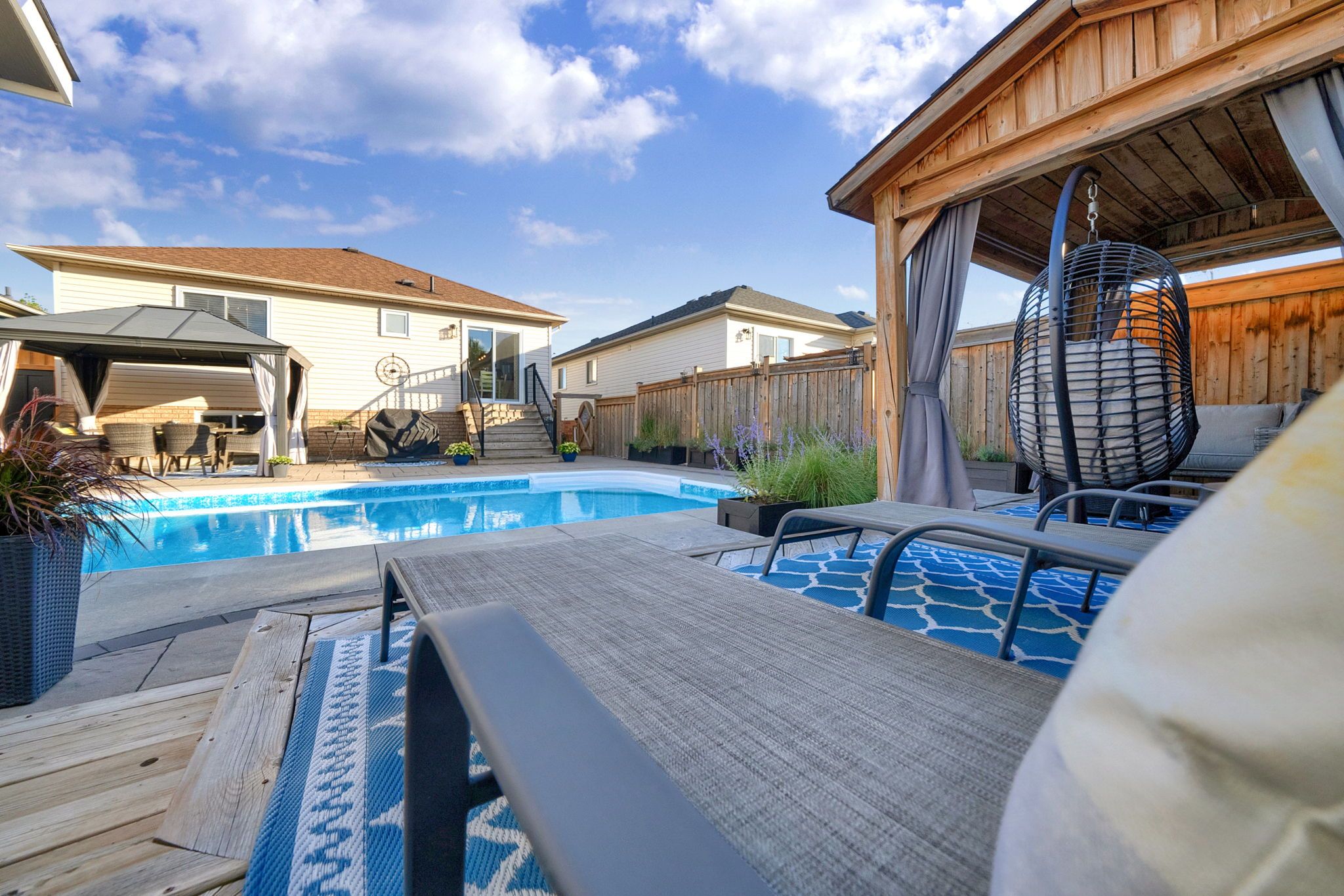 • Resort-style backyard with inground pool, lounge areas, and fire feature.