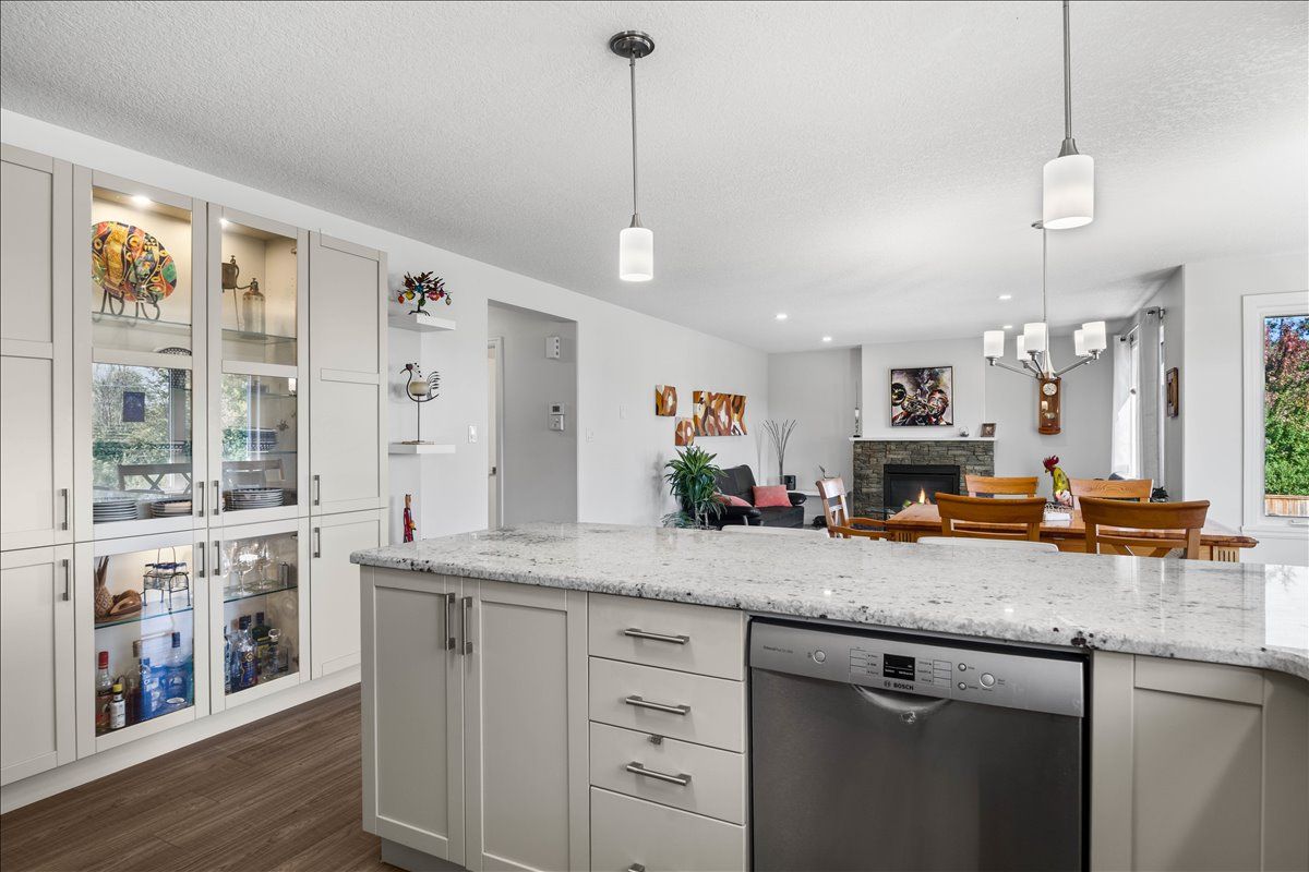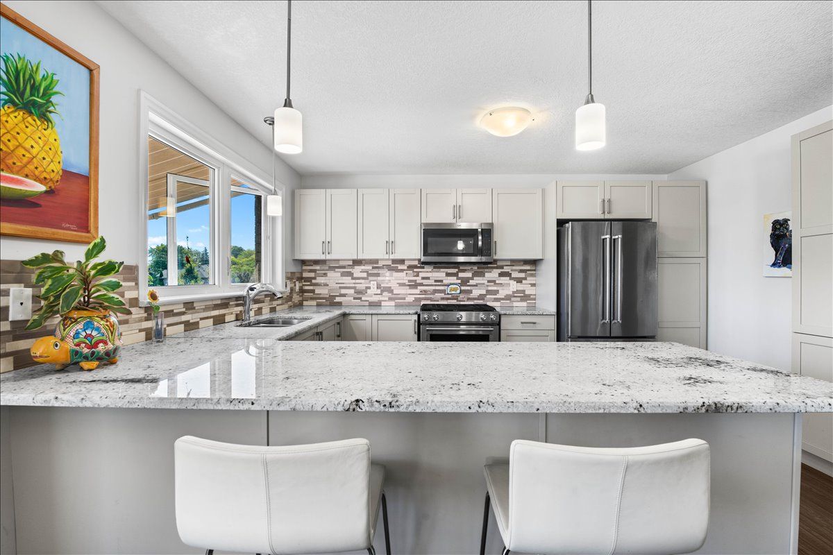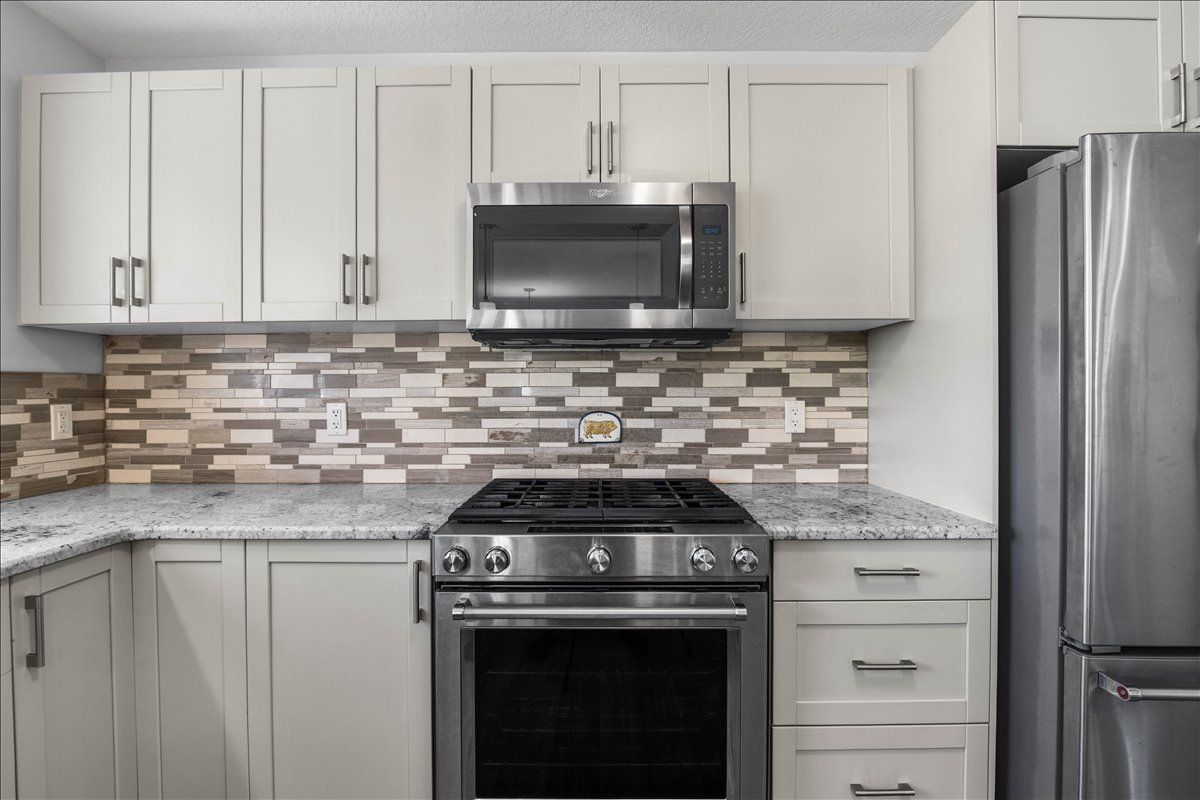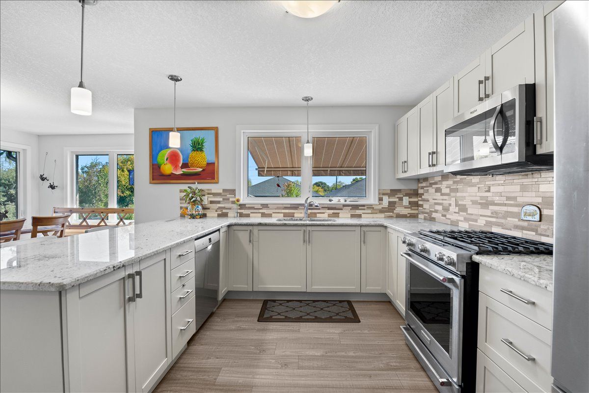 • Modern kitchen features gas stove, granite countertops, and walkout to deck.