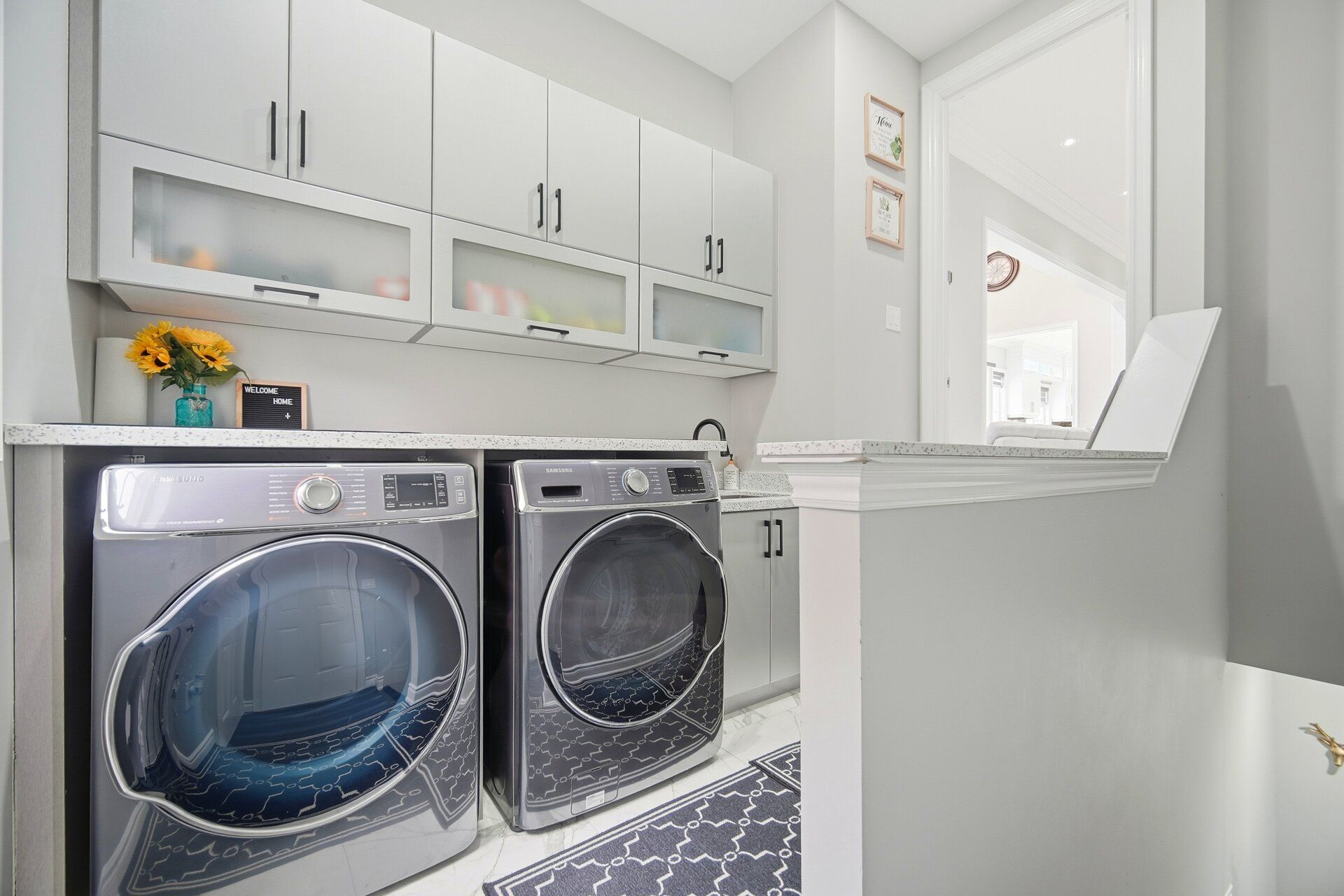 • Custom kitchen features stainless steel appliances and quartz countertops.