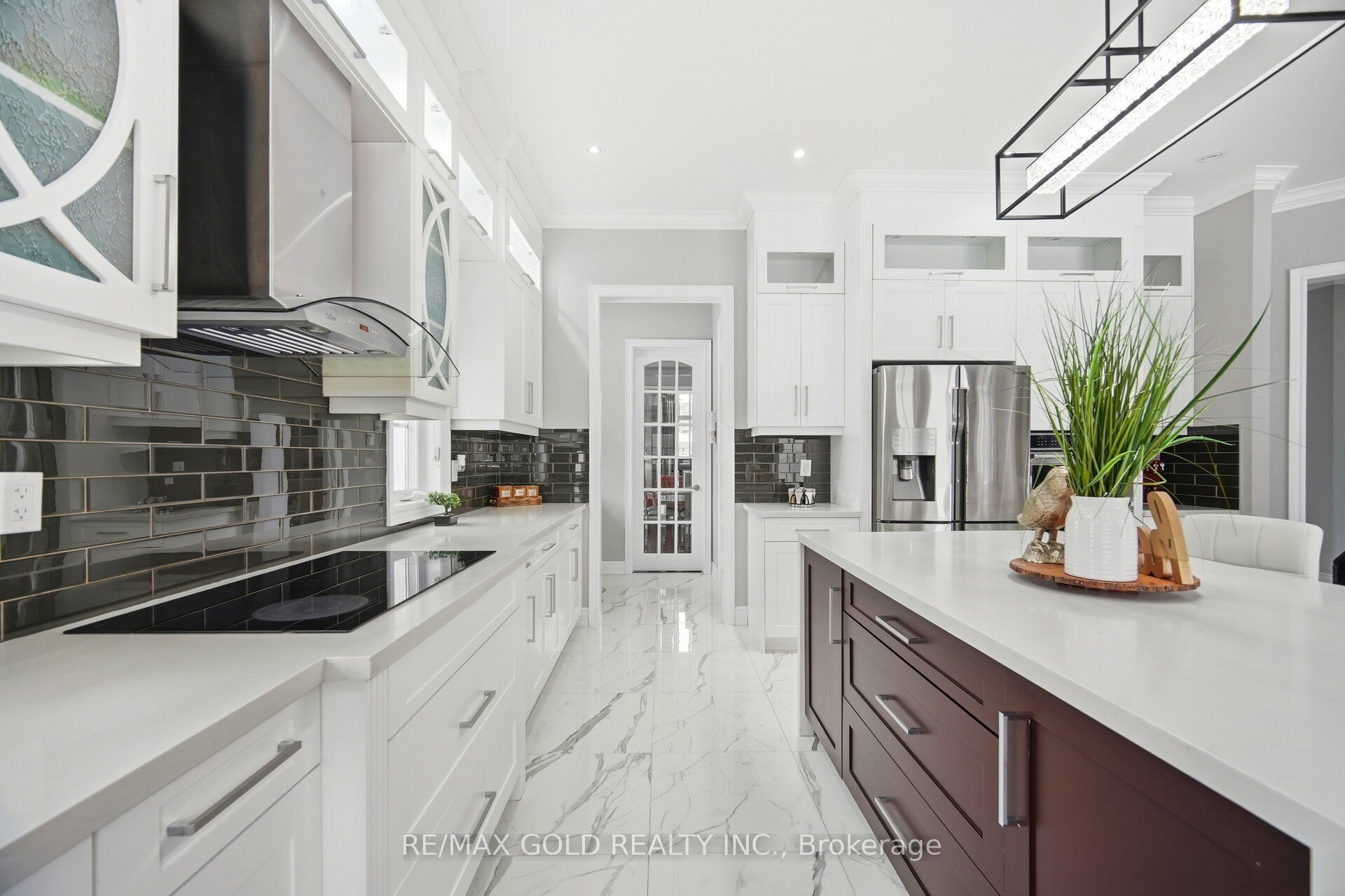 • Custom chef's kitchen featuring stainless steel appliances and quartz countertops.