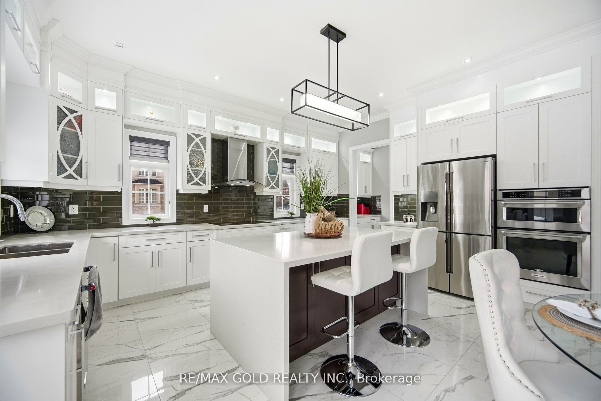 • Custom chef's kitchen featuring stainless steel appliances and quartz countertops.