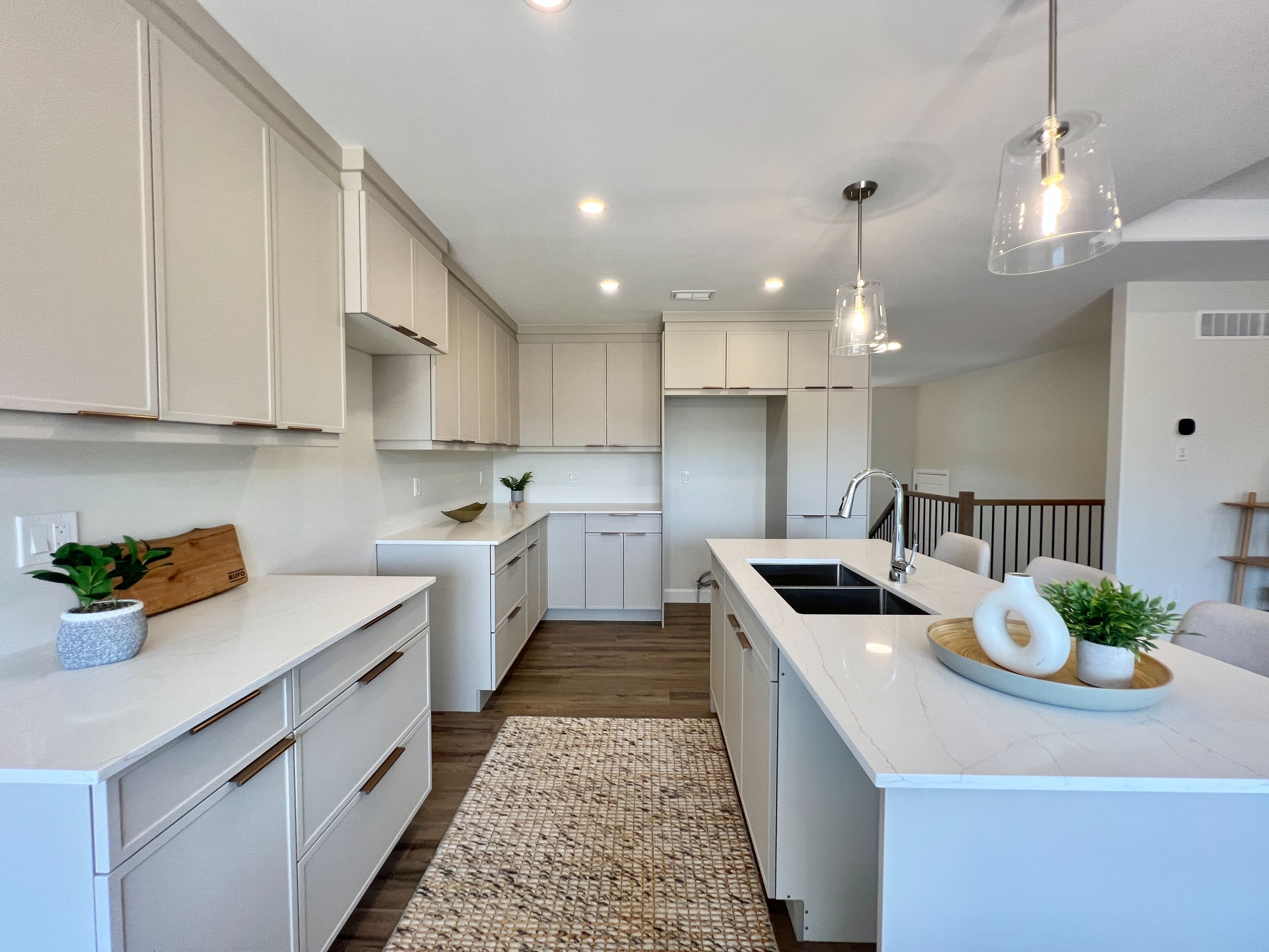 • Coffered ceilings and quartz countertops add unique charm and modern style.