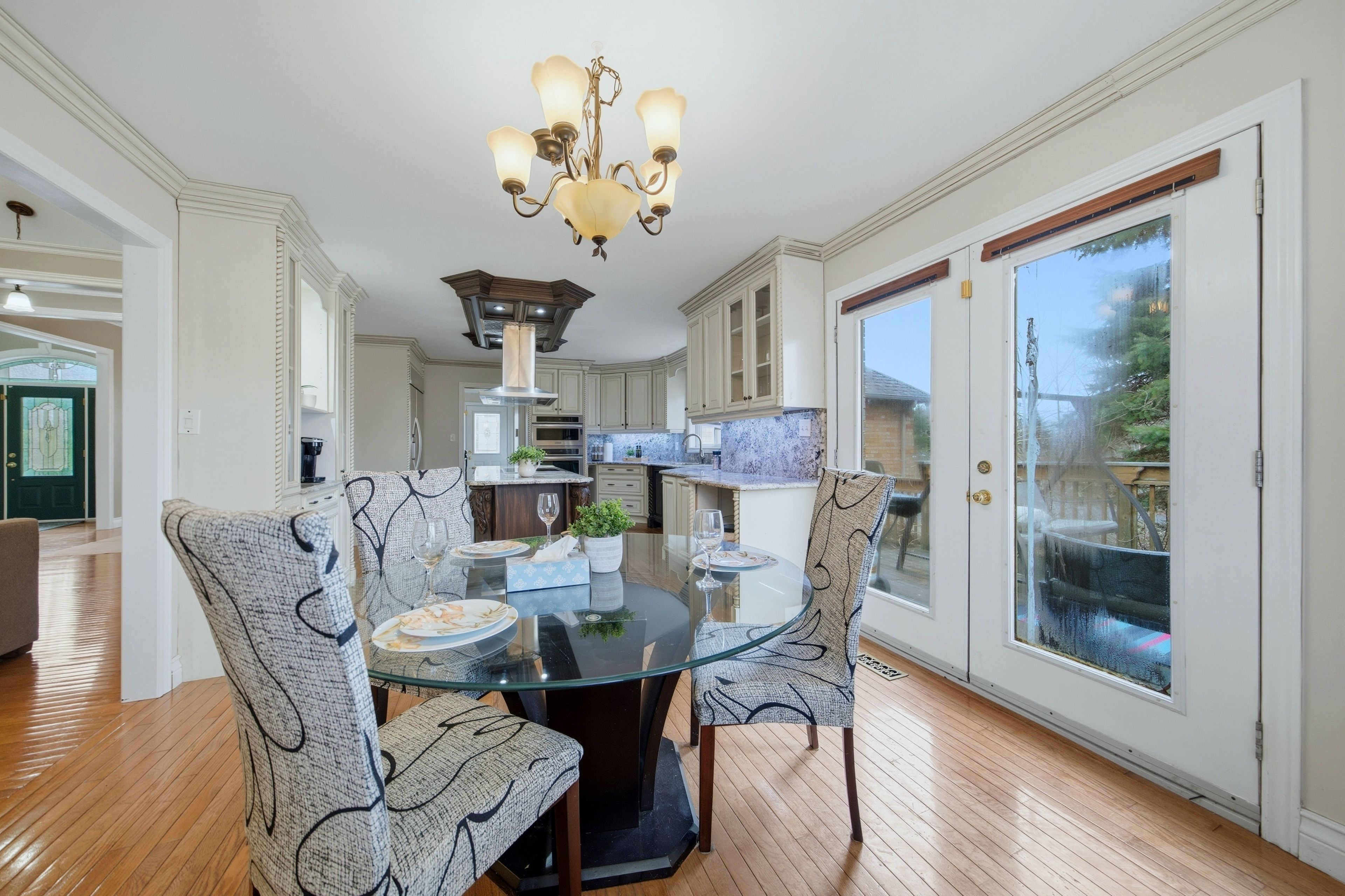 • Gourmet kitchen with stainless steel appliances and balcony overlooking the backyard.