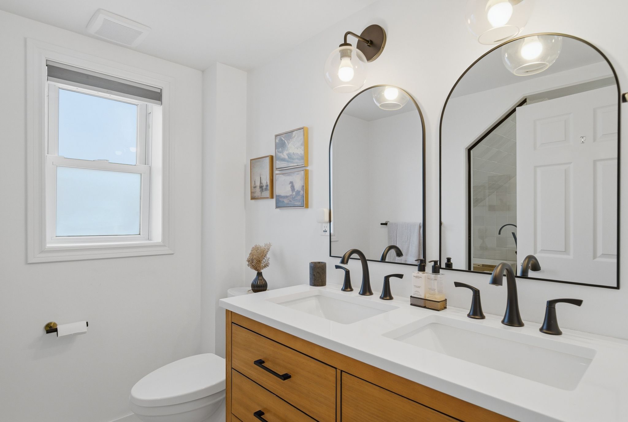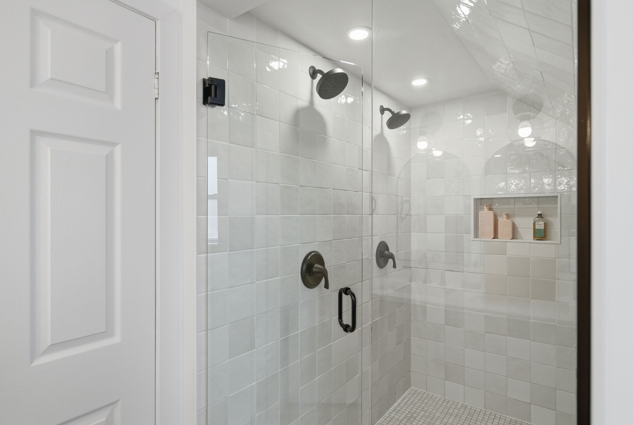 • Luxurious spa-inspired bathroom with walk-in shower and soaking tub.