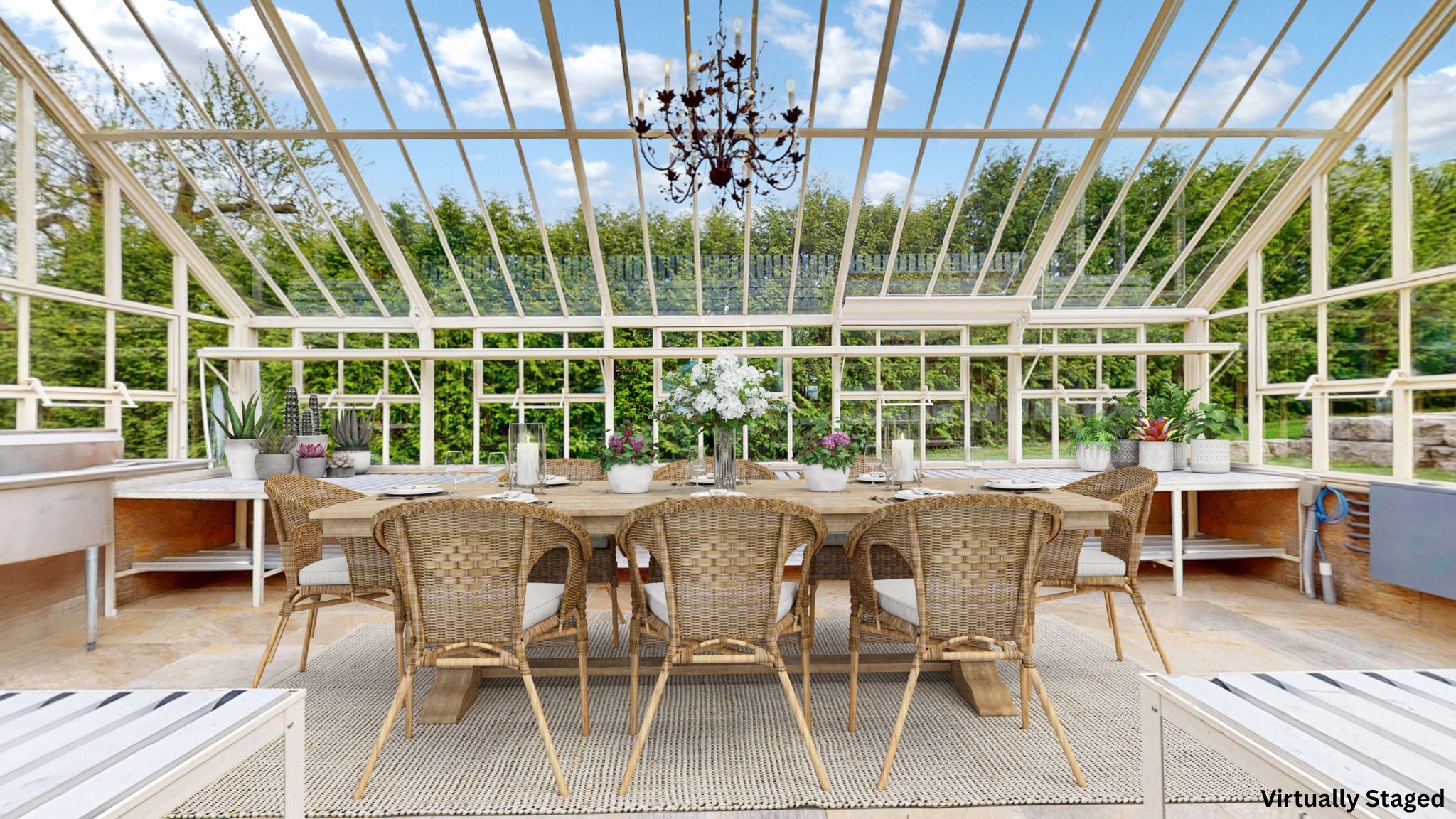 • Beautiful greenhouse for gardening or hosting parties, rain or shine.