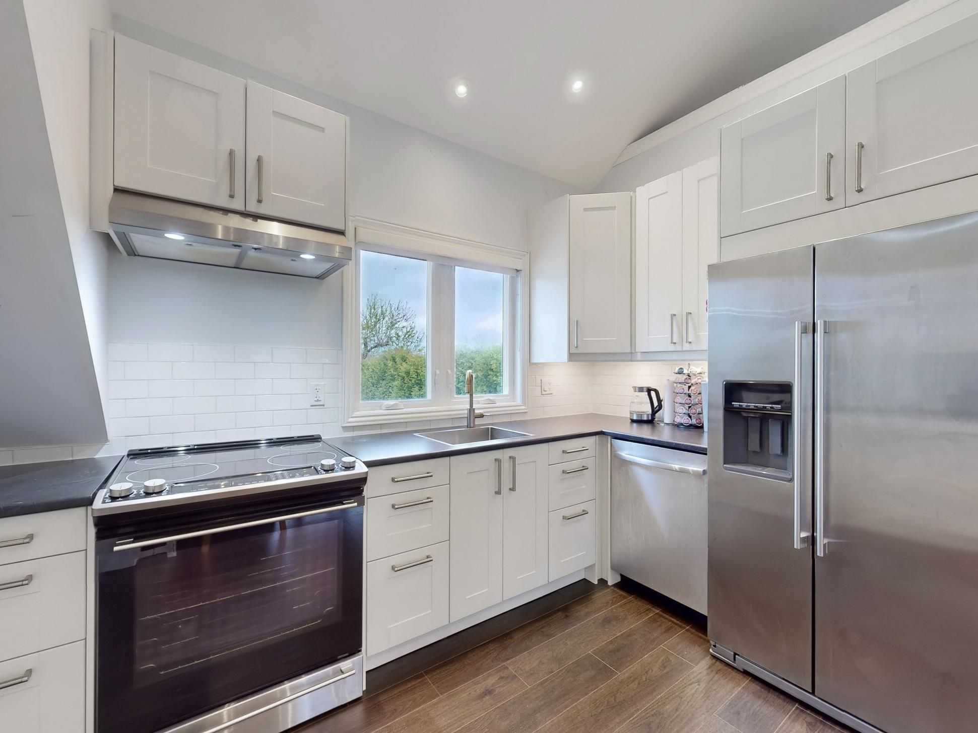 • Gourmet kitchen has stainless steel appliances and subway tile backsplash.