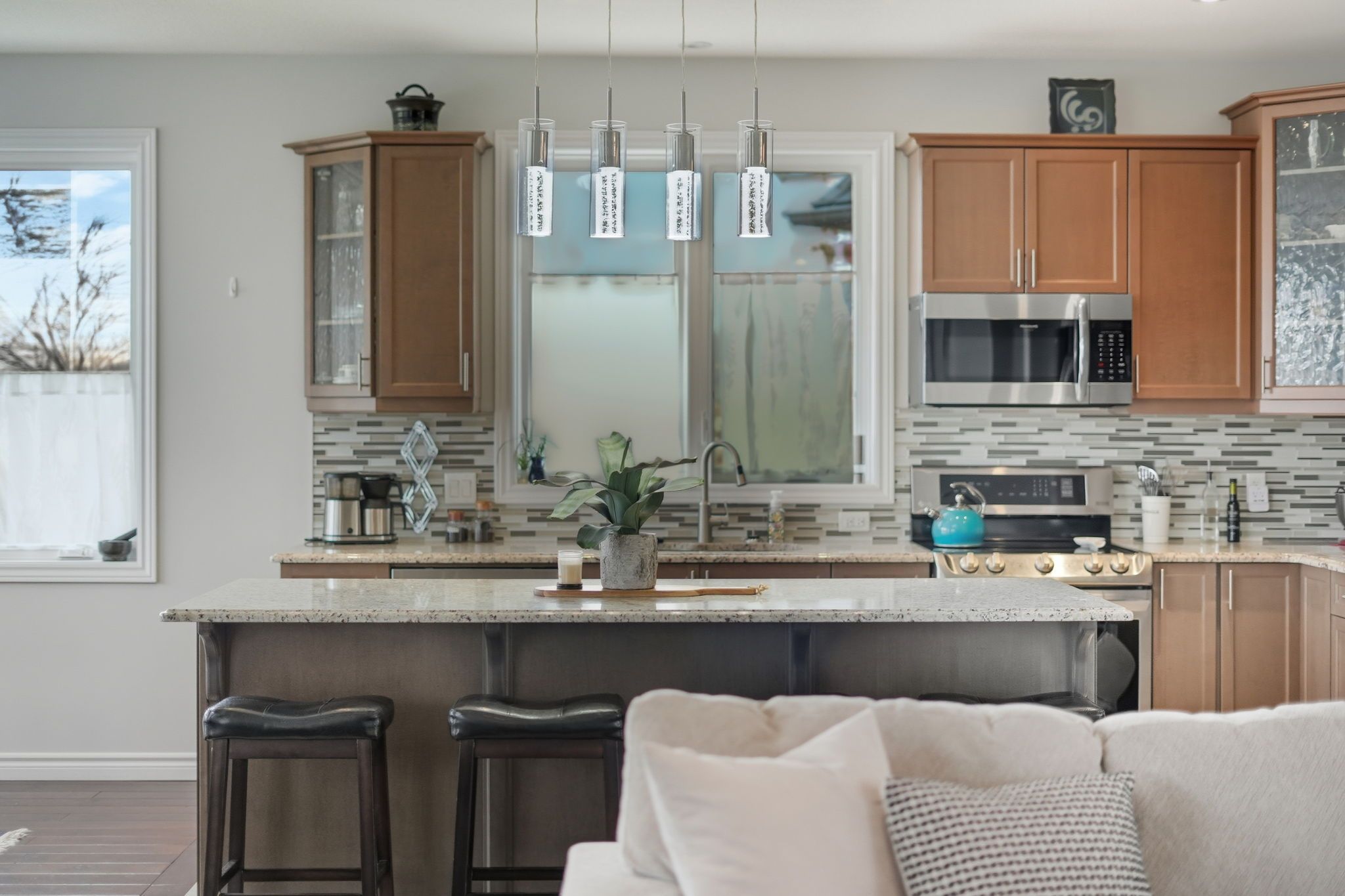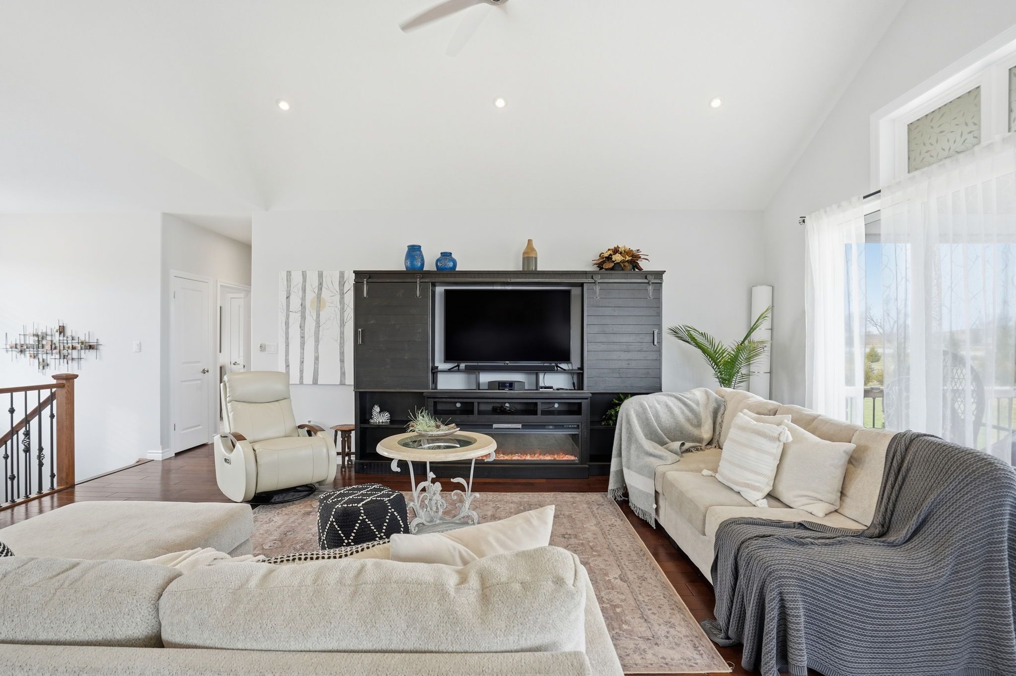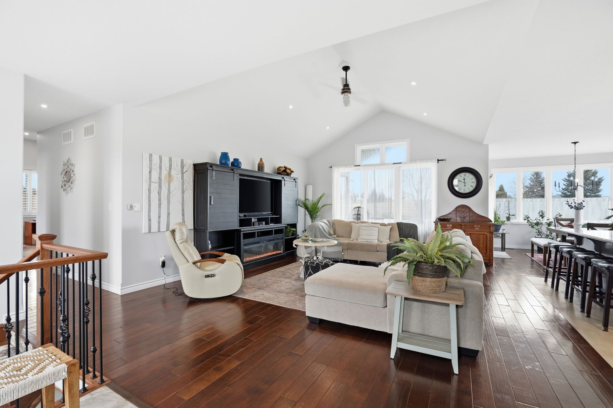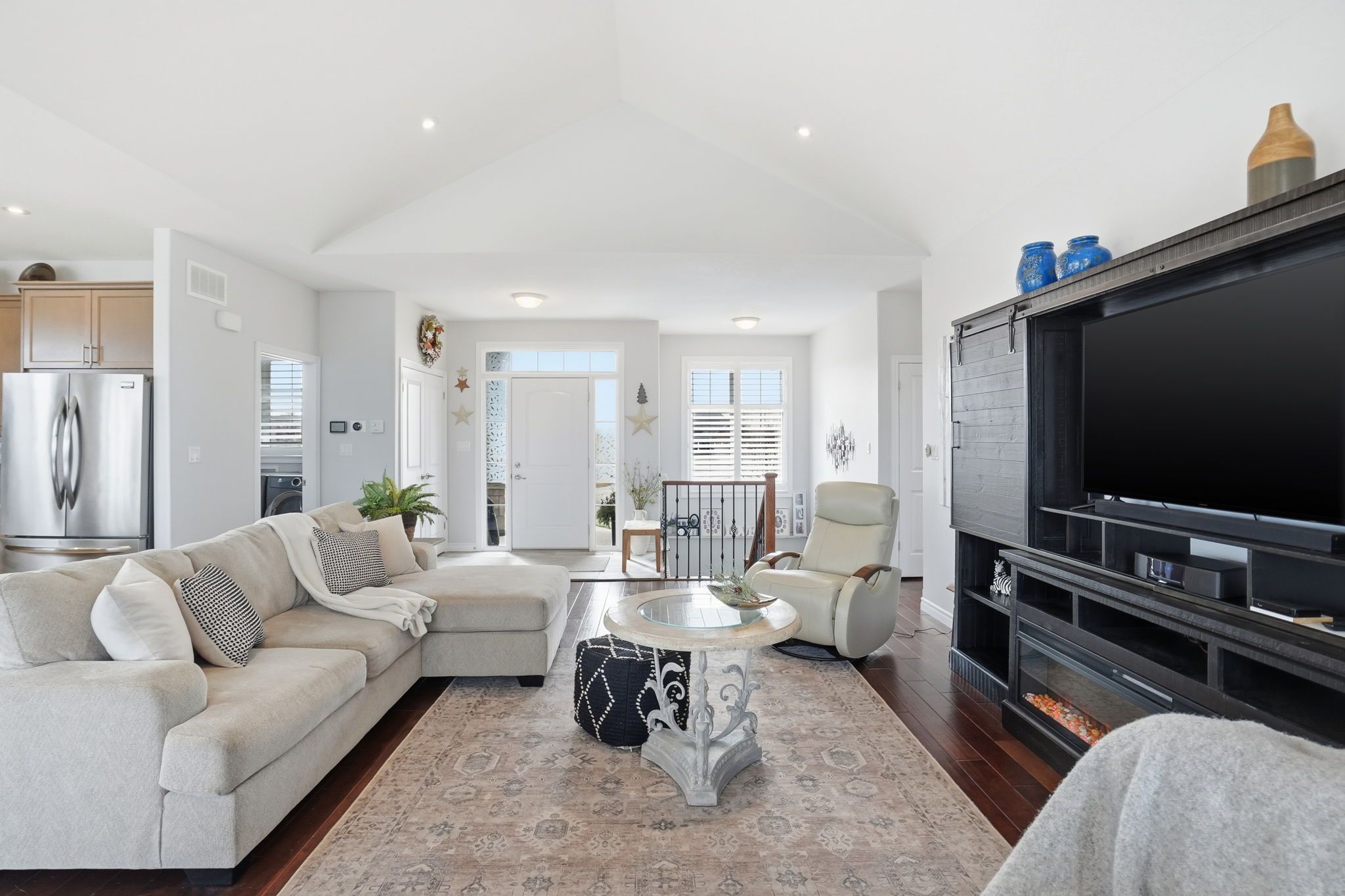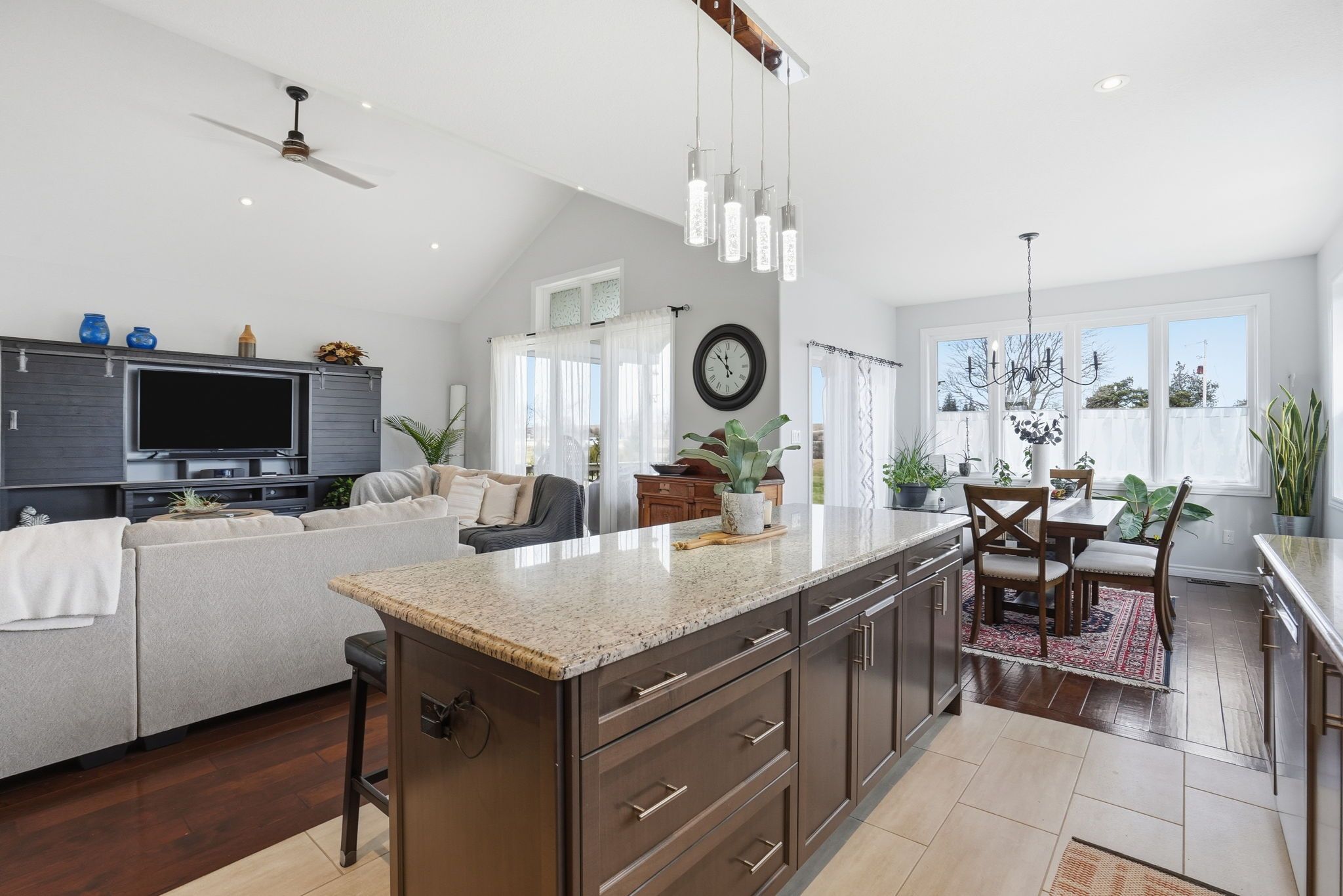 • Bright open concept main floor with vaulted ceilings and a custom kitchen.