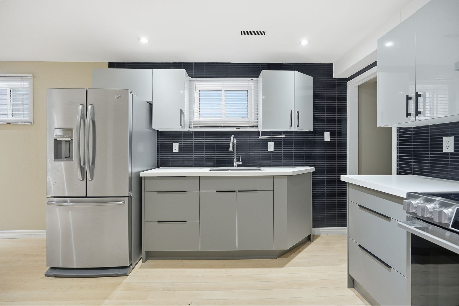 • Modern kitchen with stainless steel appliances and a separate laundry room.