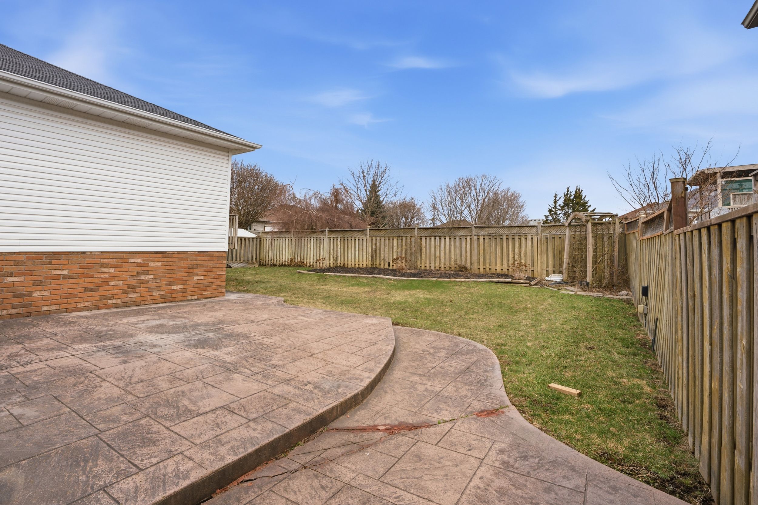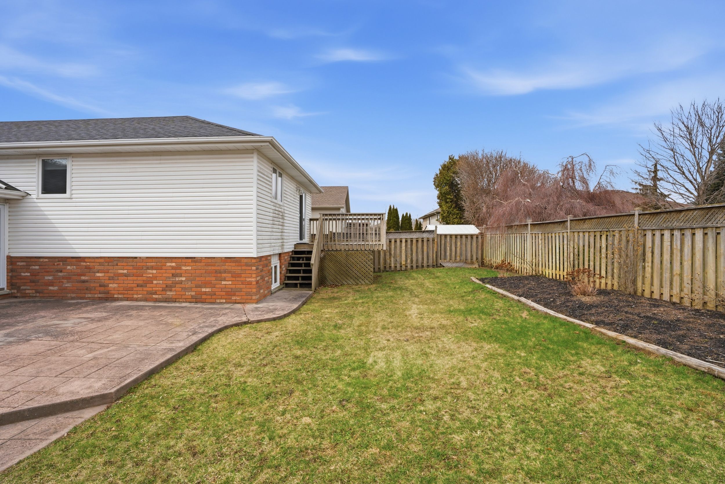 • Private fenced yard with an expansive patio and lush landscaping.