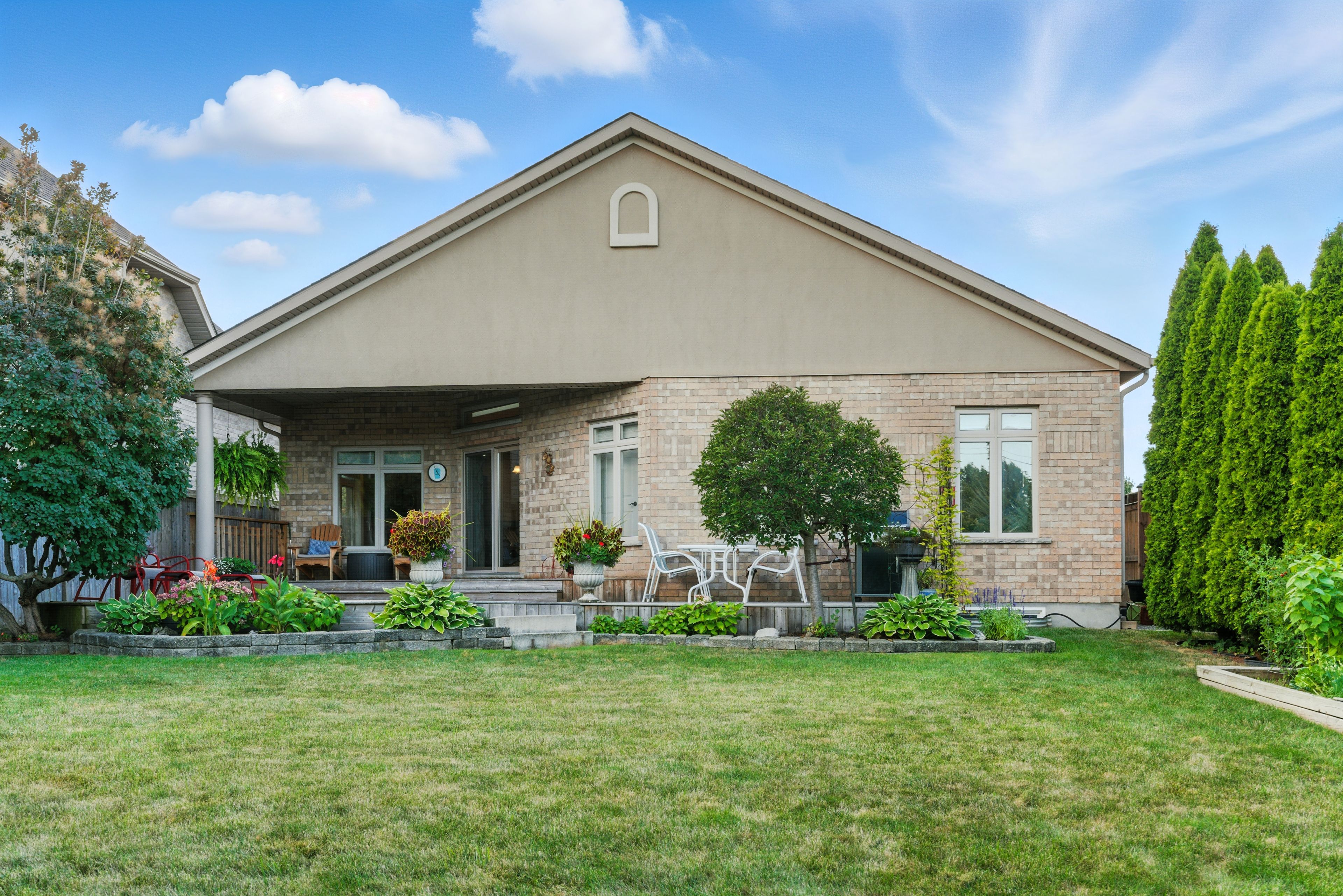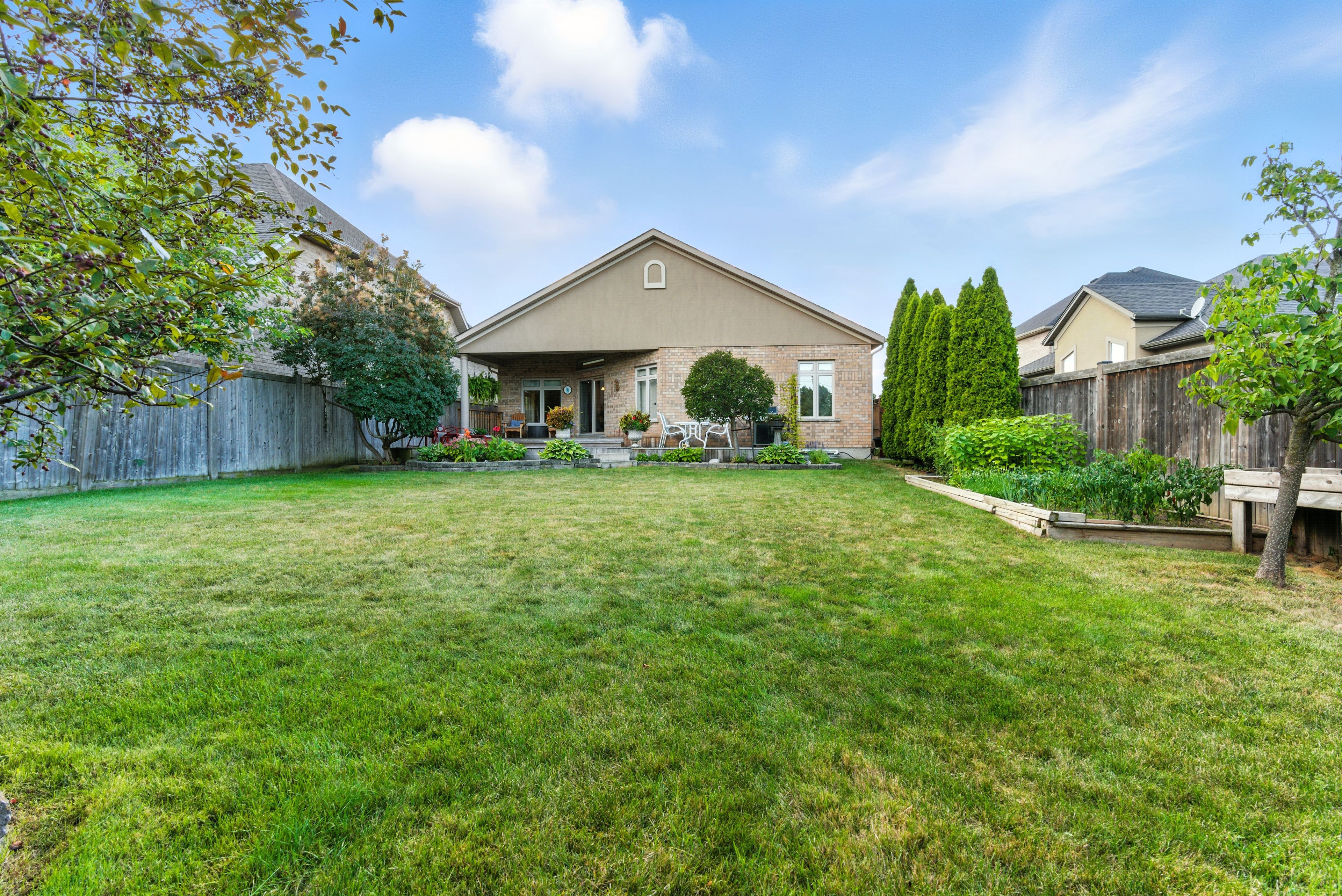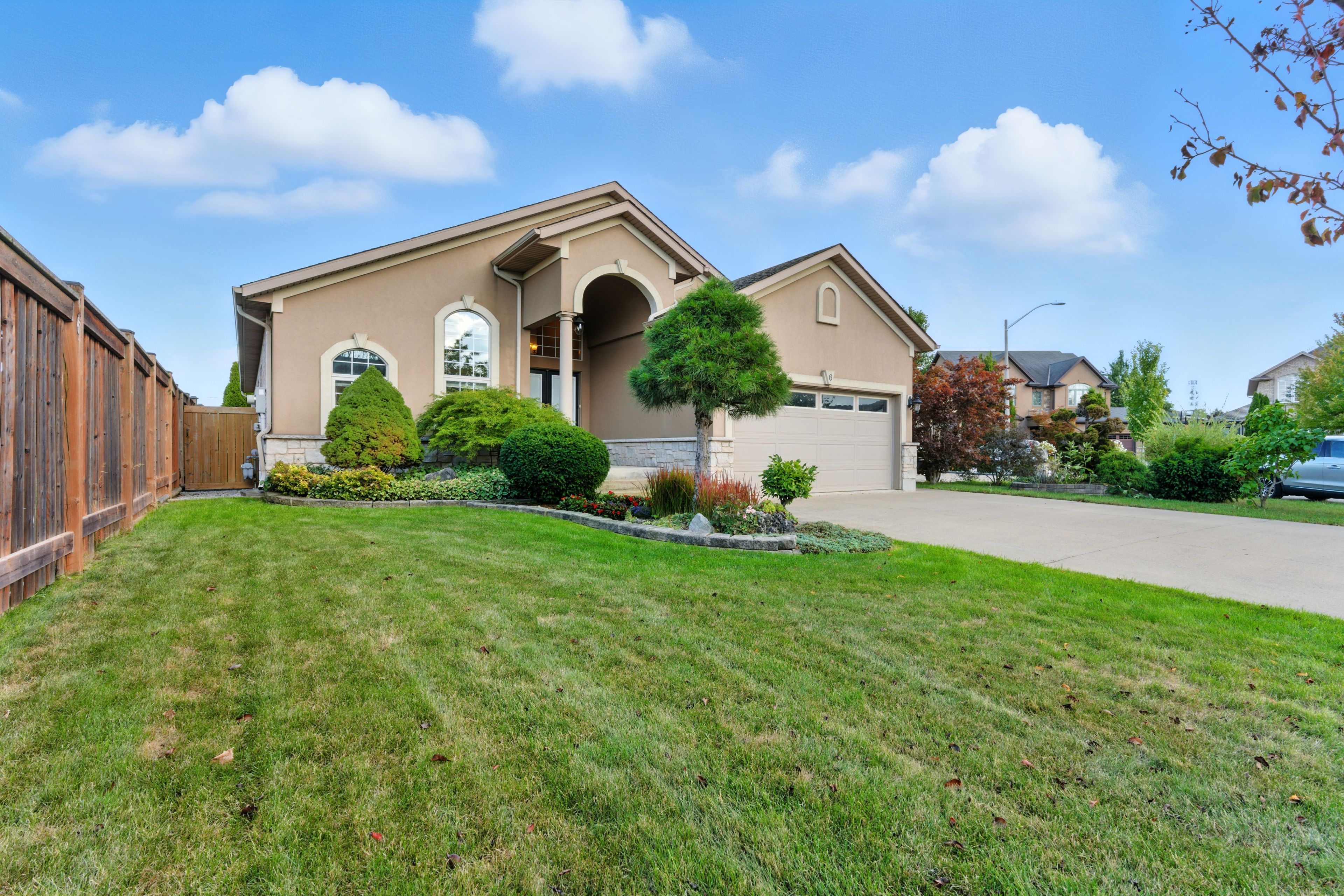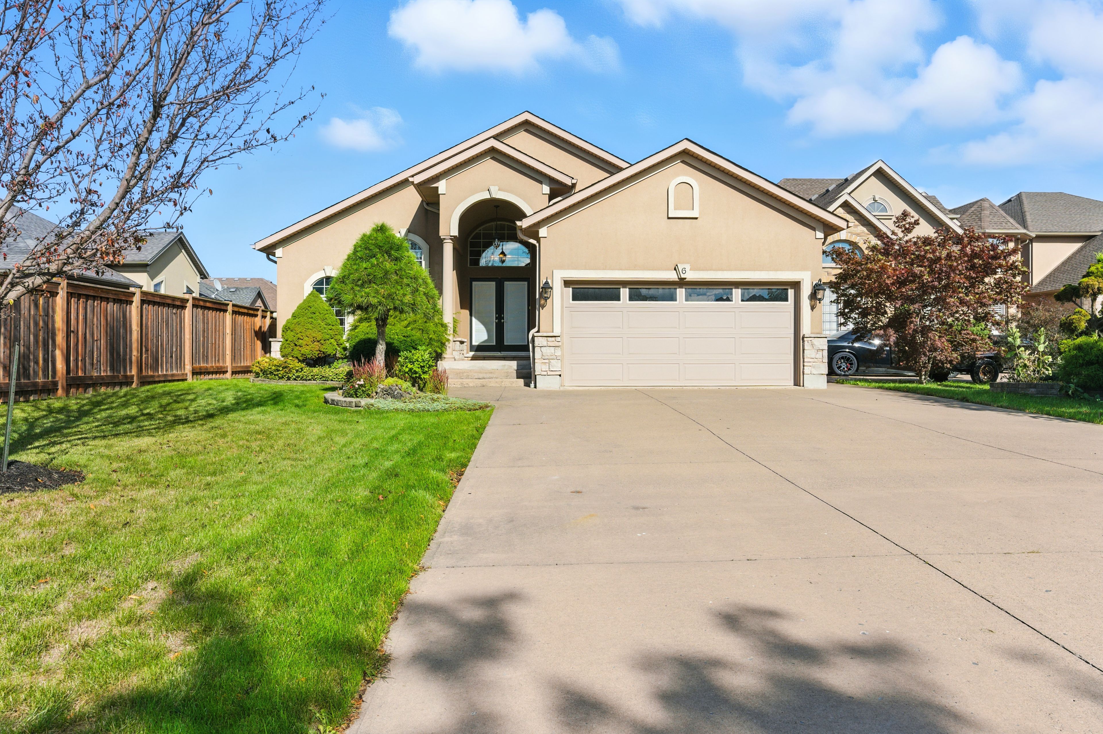 Tucked away on a quiet cul-de-sac in one of st. Catharines most sought-after neighborhoods, 6 mclean court is a rare executive bungalow that blends comfort, elegance, and everyday convenience. From the moment you arrive, the meticulously cared-for front yard and expansive driveway, with parking for up to six vehicles and a double-car garage, create a welcoming first impression. Step inside to discover approx. 2,100 sq. Ft. Of thoughtfully designed main-floor living, where soaring 14-ft vaulted ceilings and skylights flood the open-concept space with natural light. At the heart of the home, the gourmet kitchen features an oversized island, high-end cabinetry, and seamless flow into the dining and living areas, making it ideal for both everyday living and entertaining. The primary suite is a serene retreat with walk-in closets and spa-like 5-piece ensuite. Two additional bedrooms and a well-appointed 3-piece bathroom complete the main floor, providing flexibility for family, guests, or a home office. A full unfinished basement offers excellent potential for future living space, whether imagined as a recreation room, gym, or in-law suite. Step outside to a private, fully fenced backyard with a large deck the perfect setting for outdoor dining, morning coffee, or quiet evenings under the stars. Ideally located, this home offers both tranquility and convenience. Just minutes away you will find shopping, dining, the st. Catharines hospital, and highly regarded schools, all while enjoying the peaceful charm of a family-friendly neighborhood. Rarely does a bungalow of this size, style, and setting become available. Welcome to your sanctuary at 6 mclean court a home that offers comfort, and a lifestyle to match.