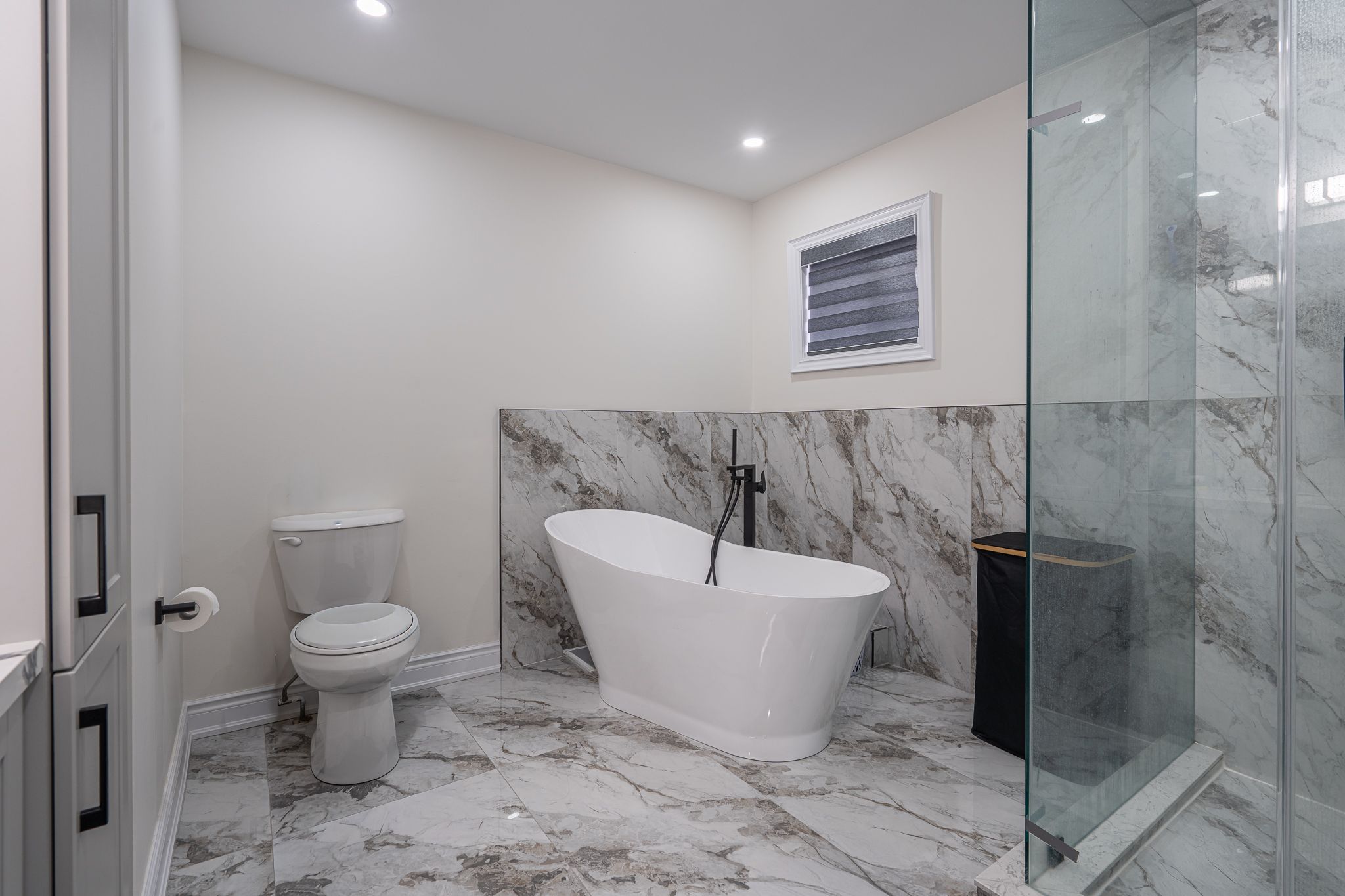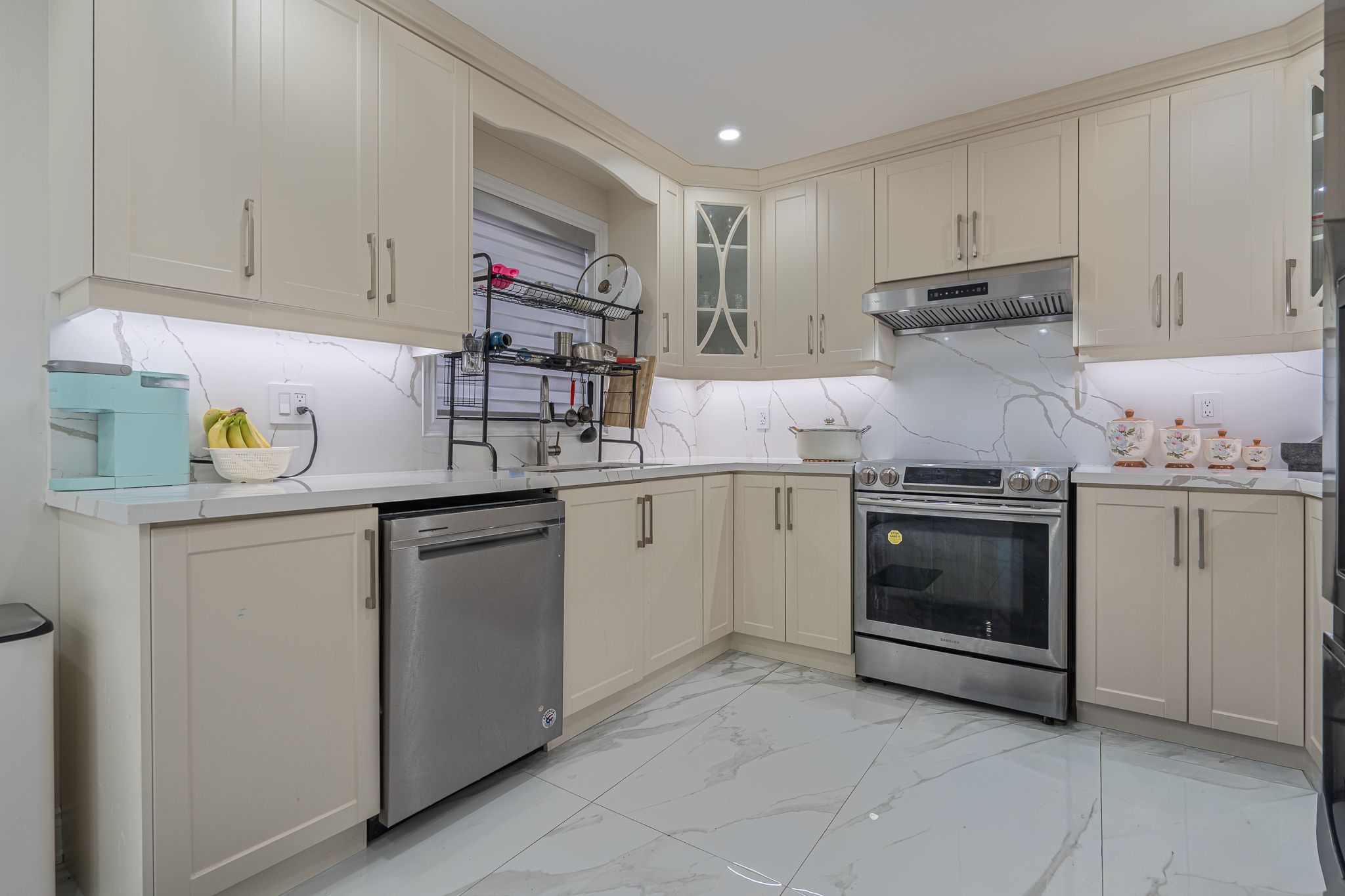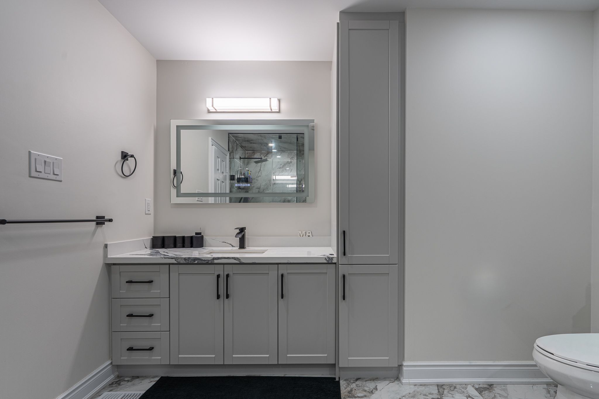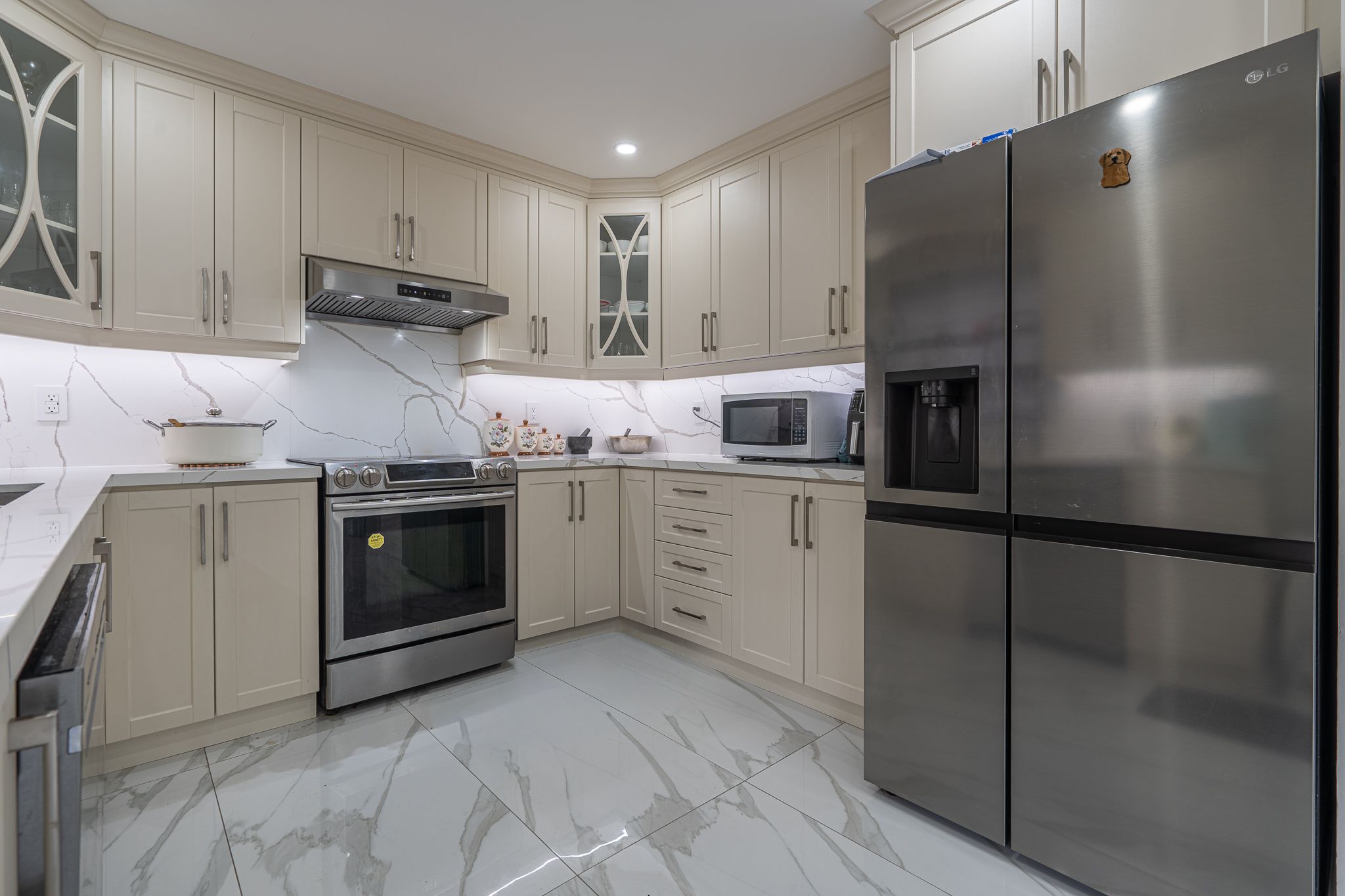 • Modern finishes including quartz countertops and large-format porcelain tiles.