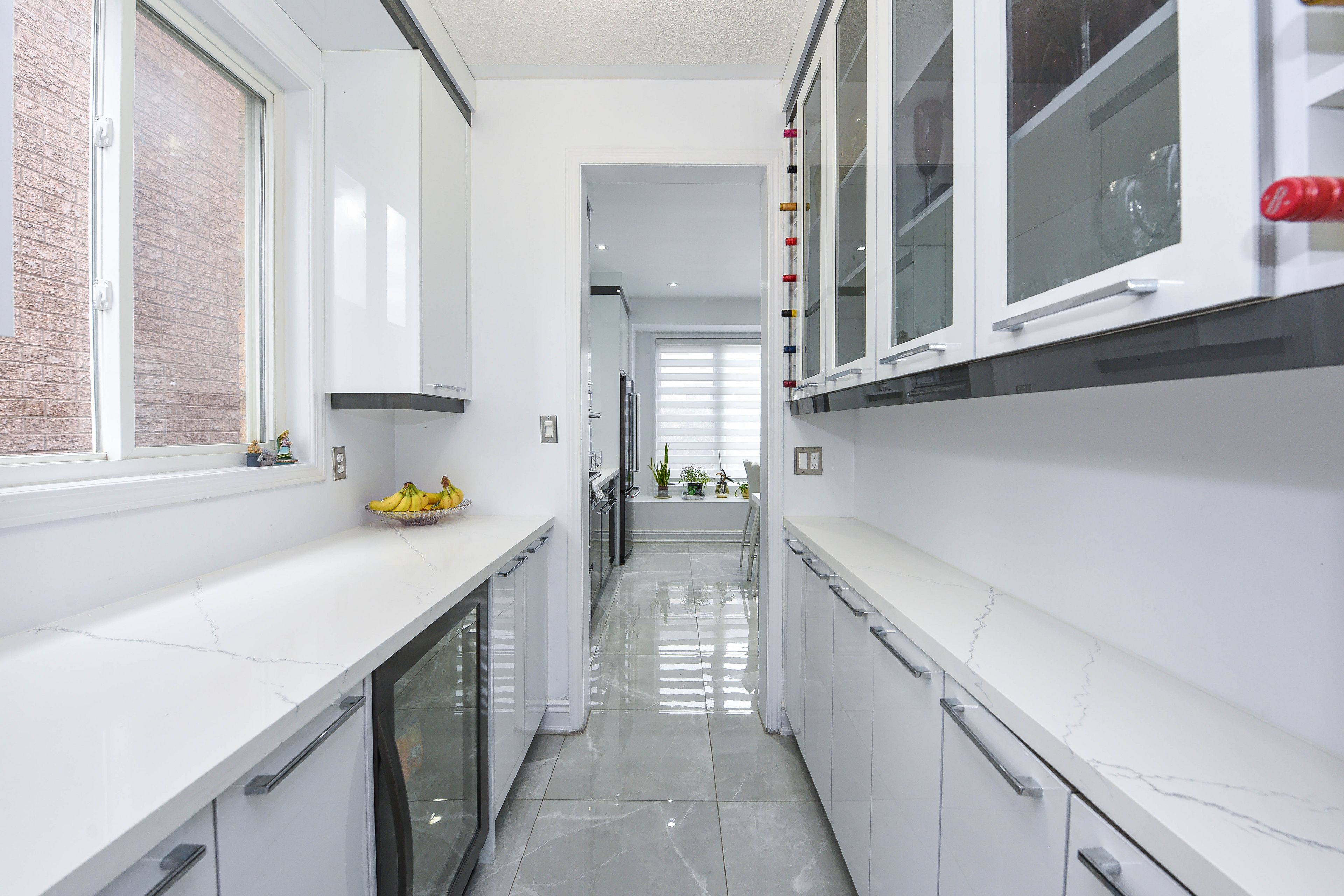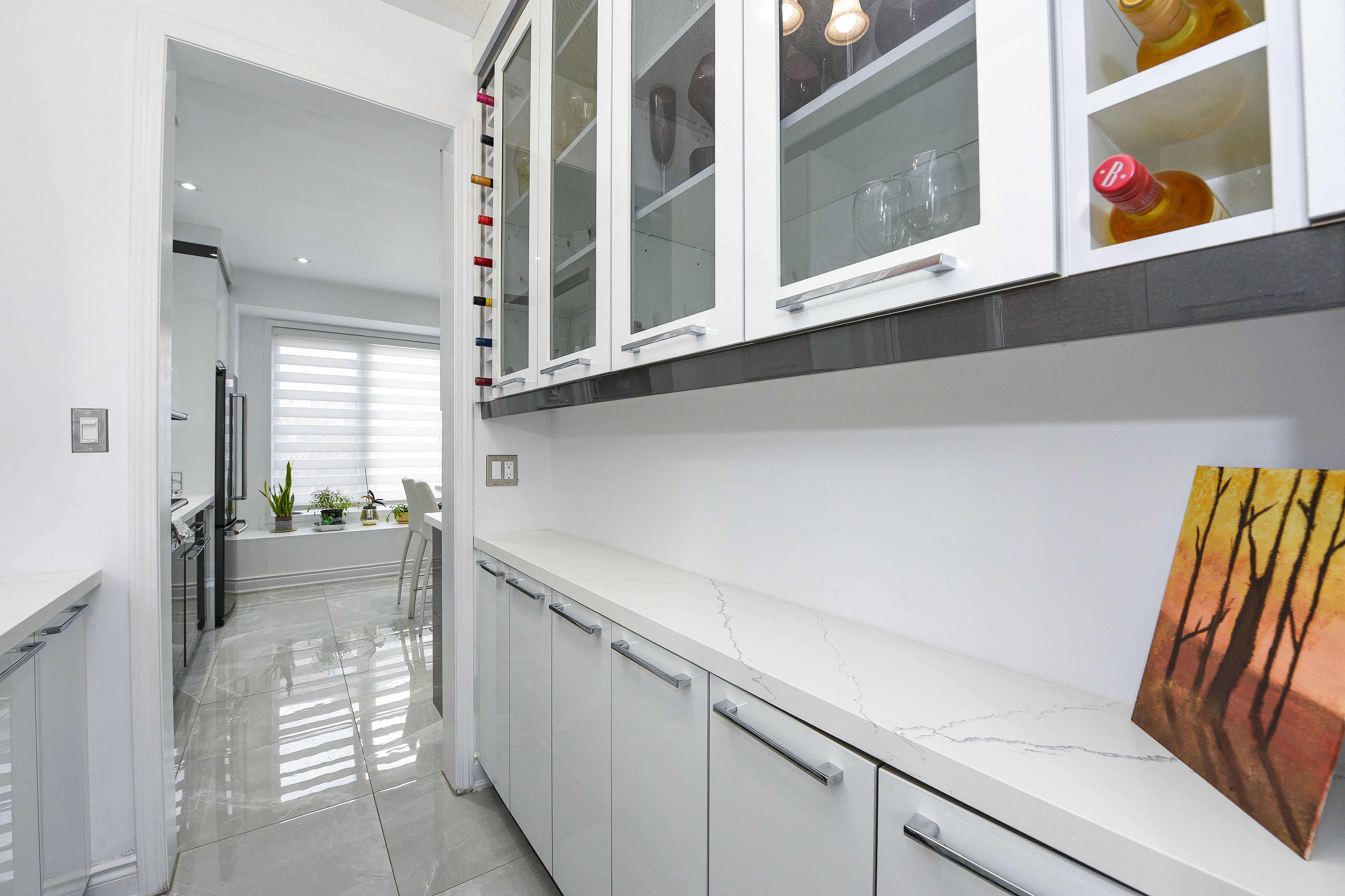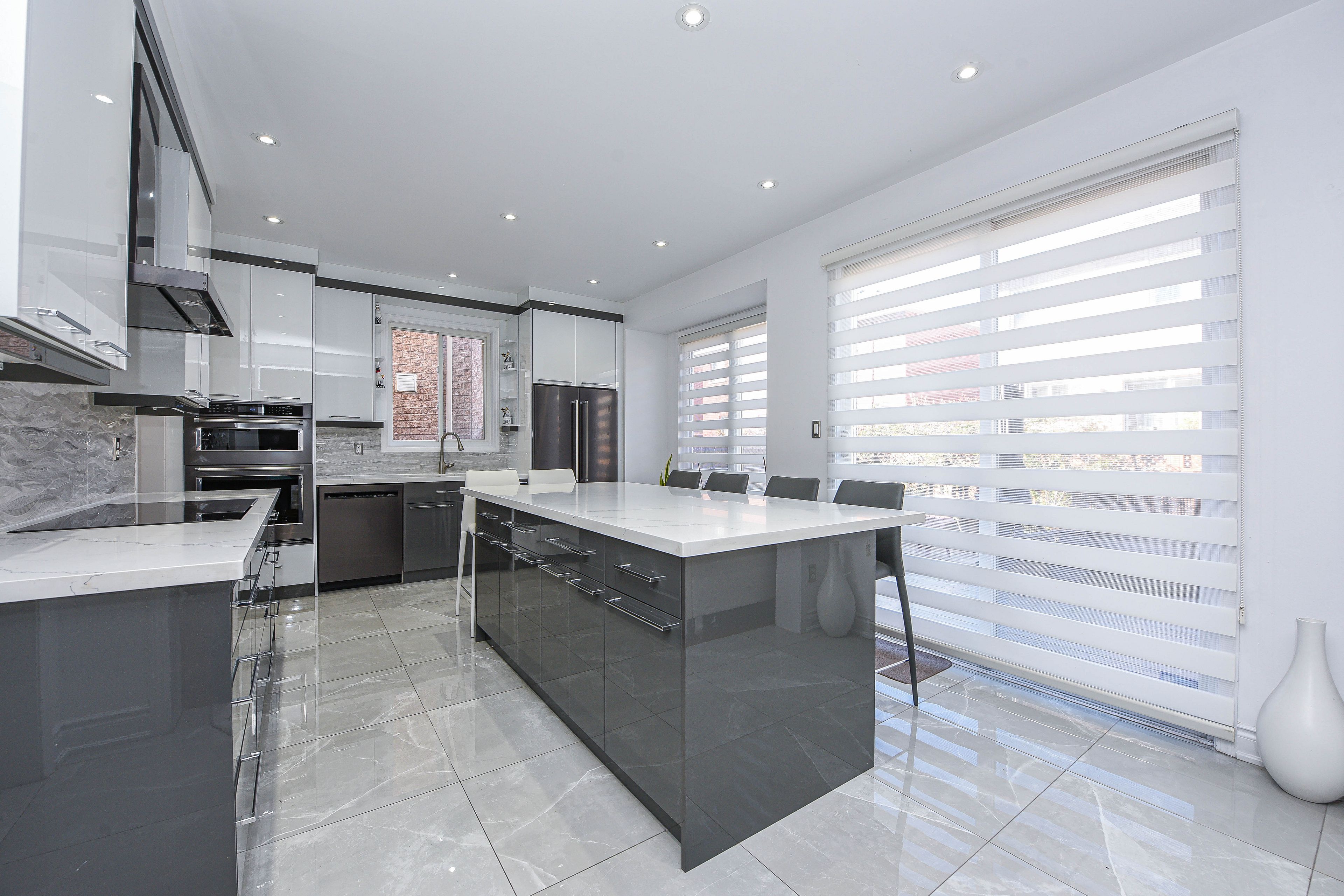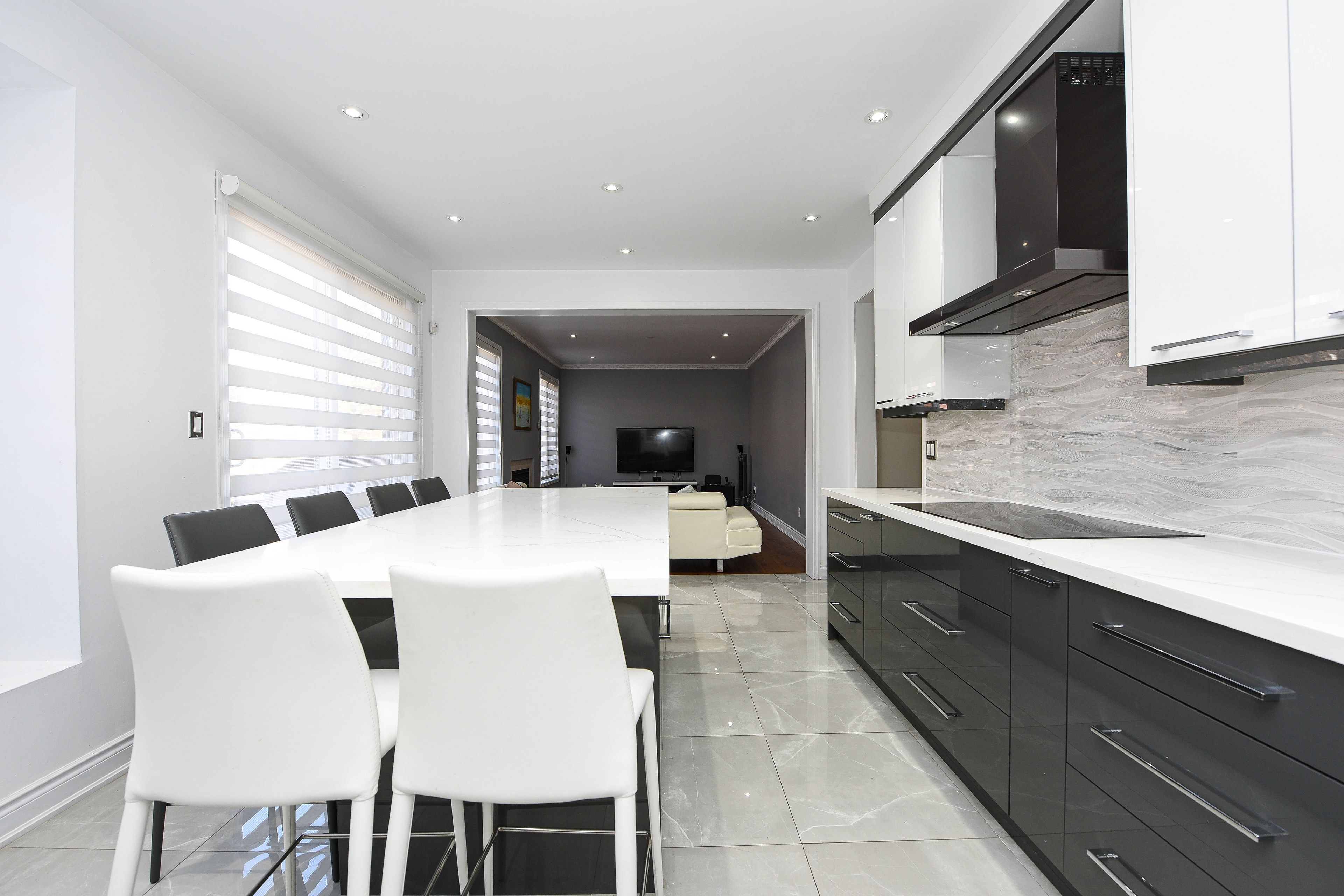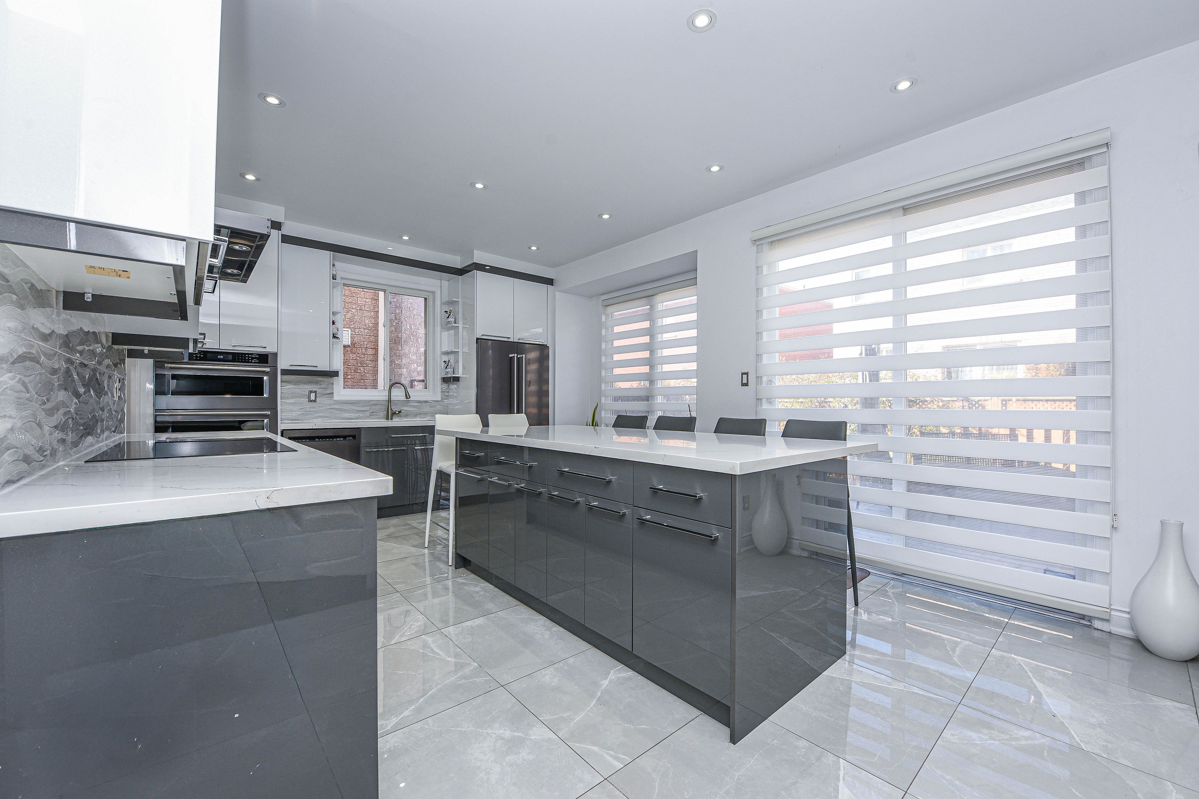 • Modern kitchen with quartz countertops and large island for gatherings.