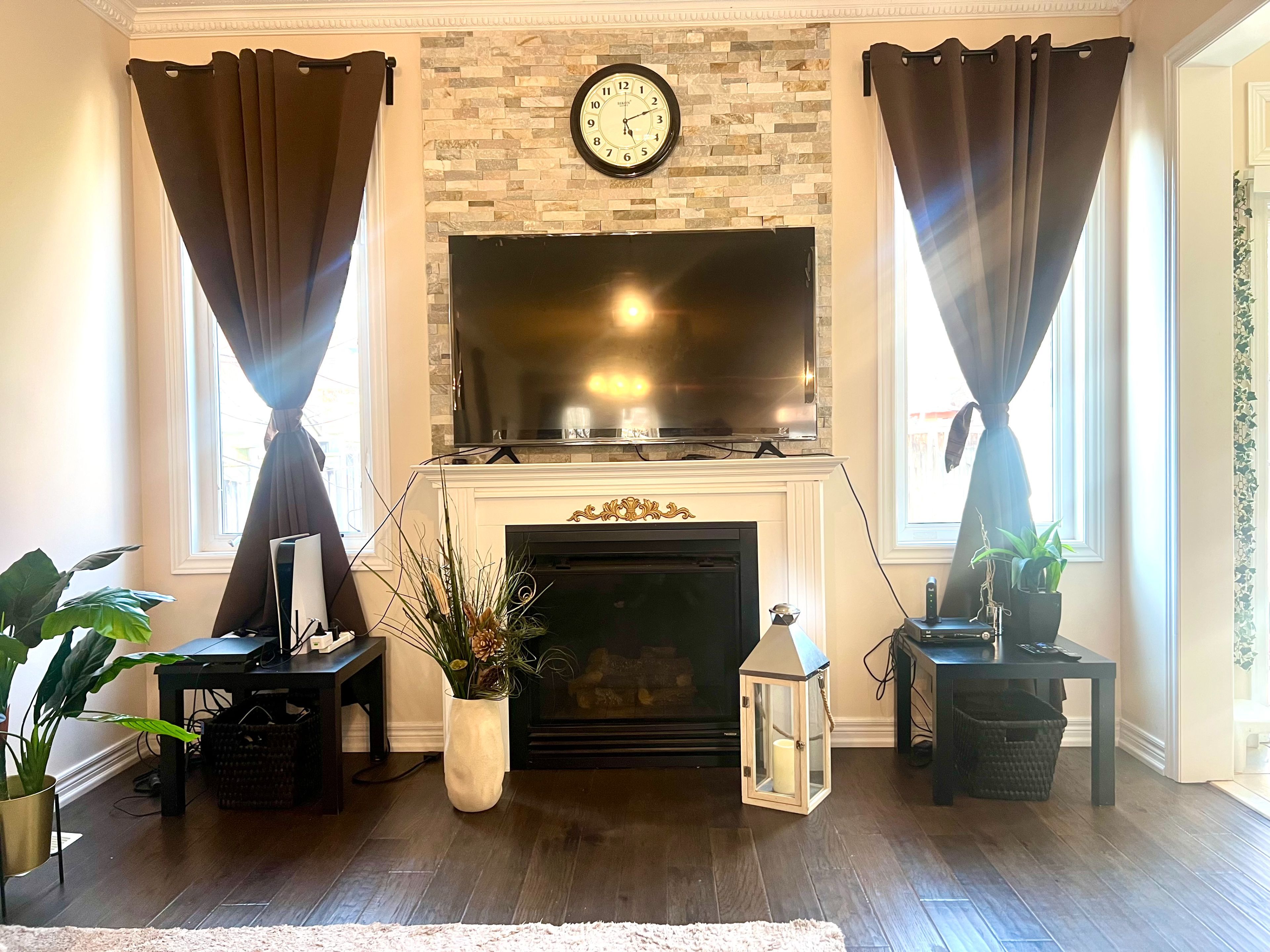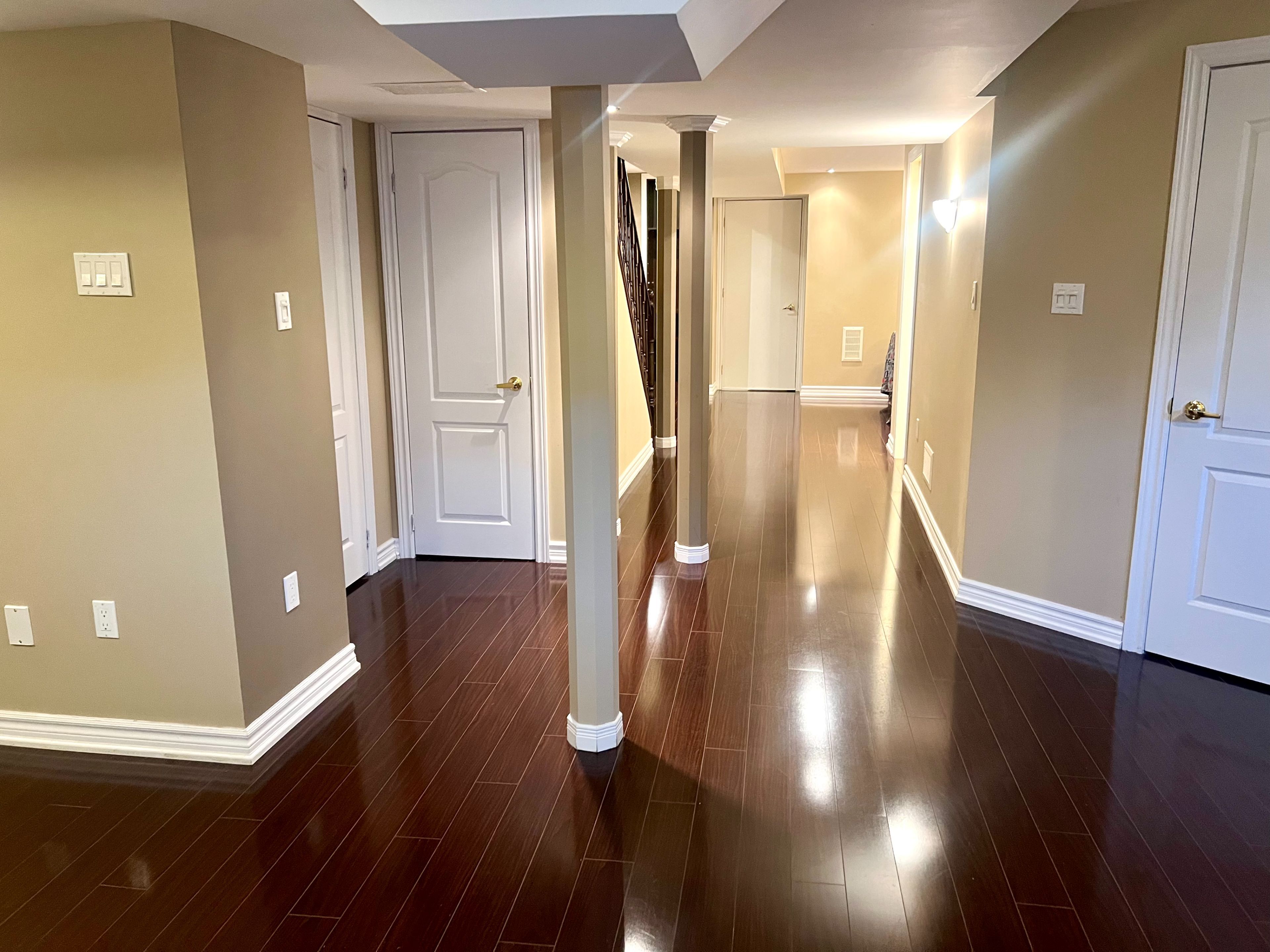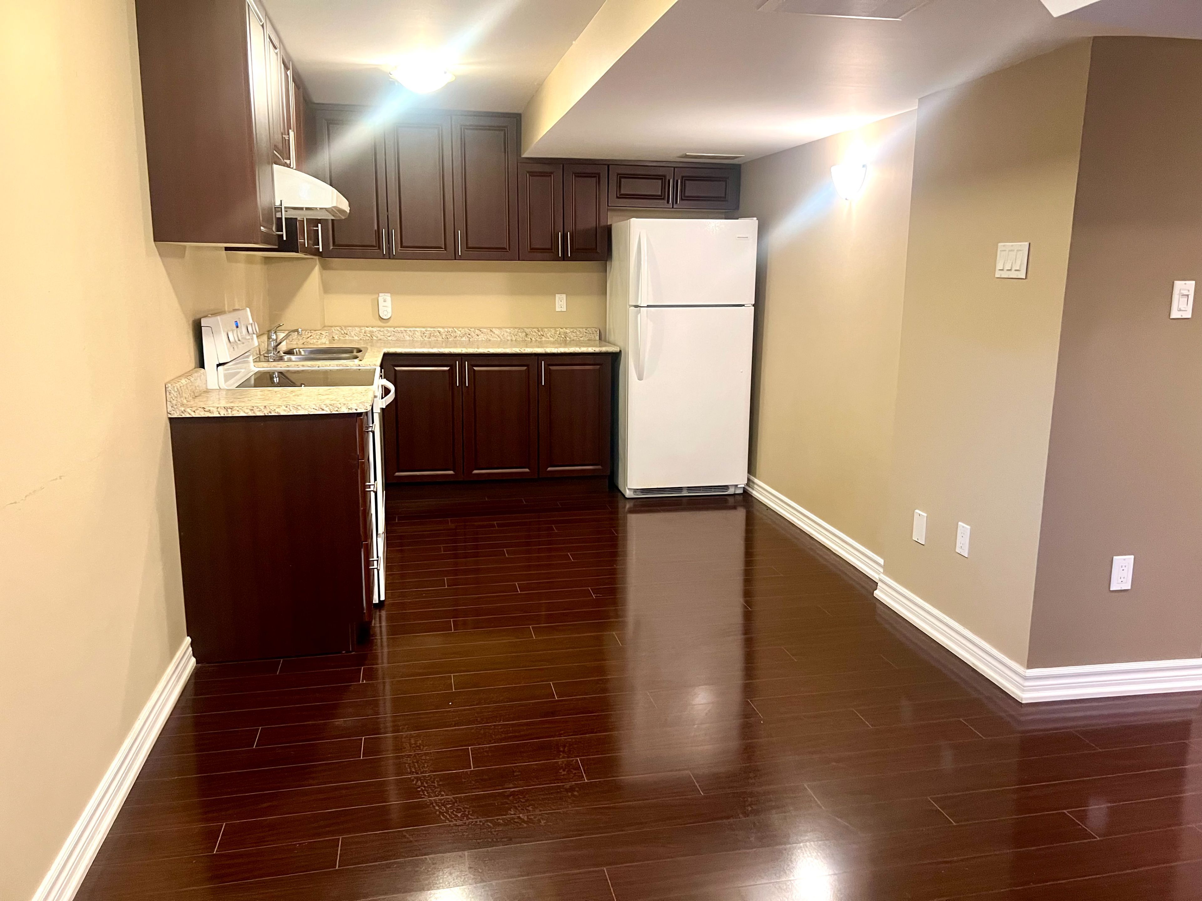 • Open-concept layout with high ceilings and hardwood flooring.