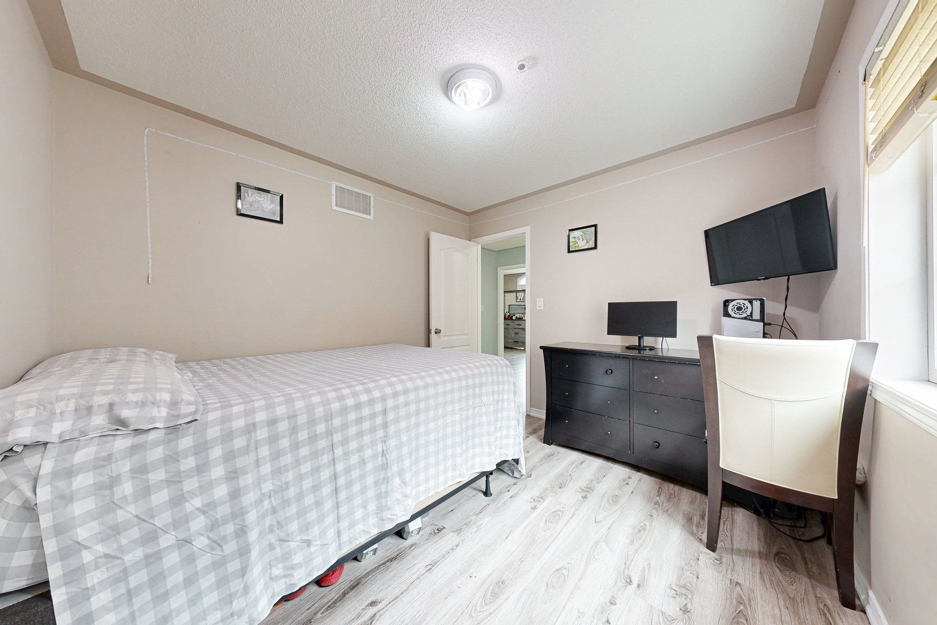 • Stone countertops and hardwood floors enhance the home's aesthetic appeal.