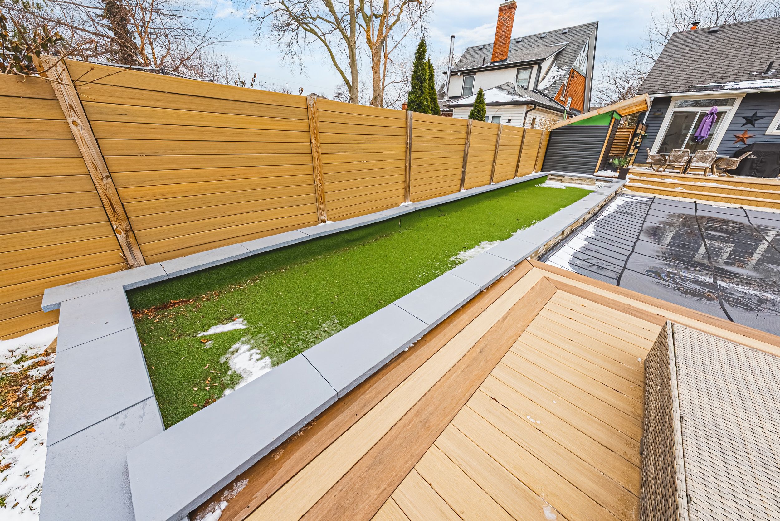 • Oversized private backyard with in-ground saltwater pool and bocce ball court.