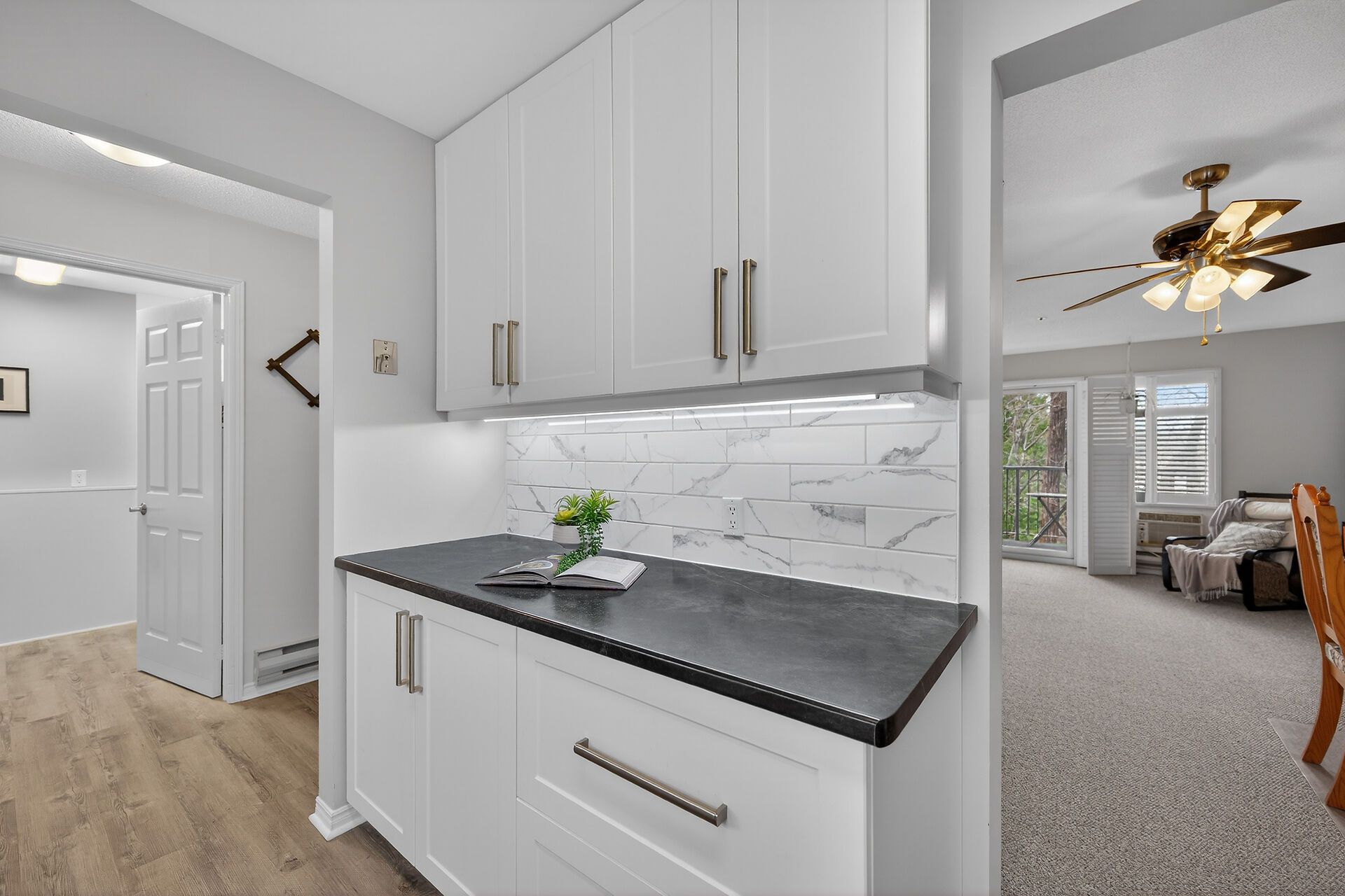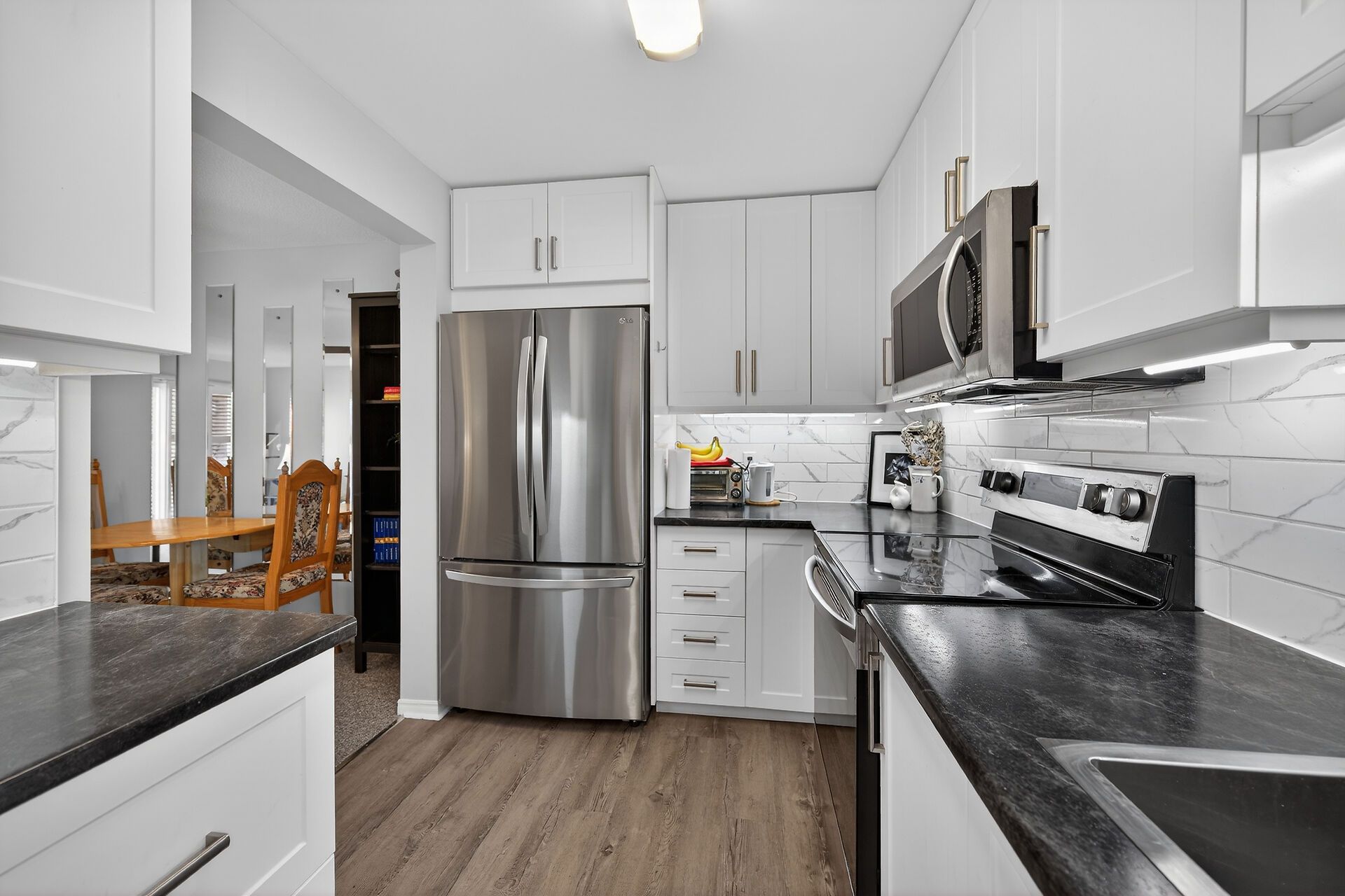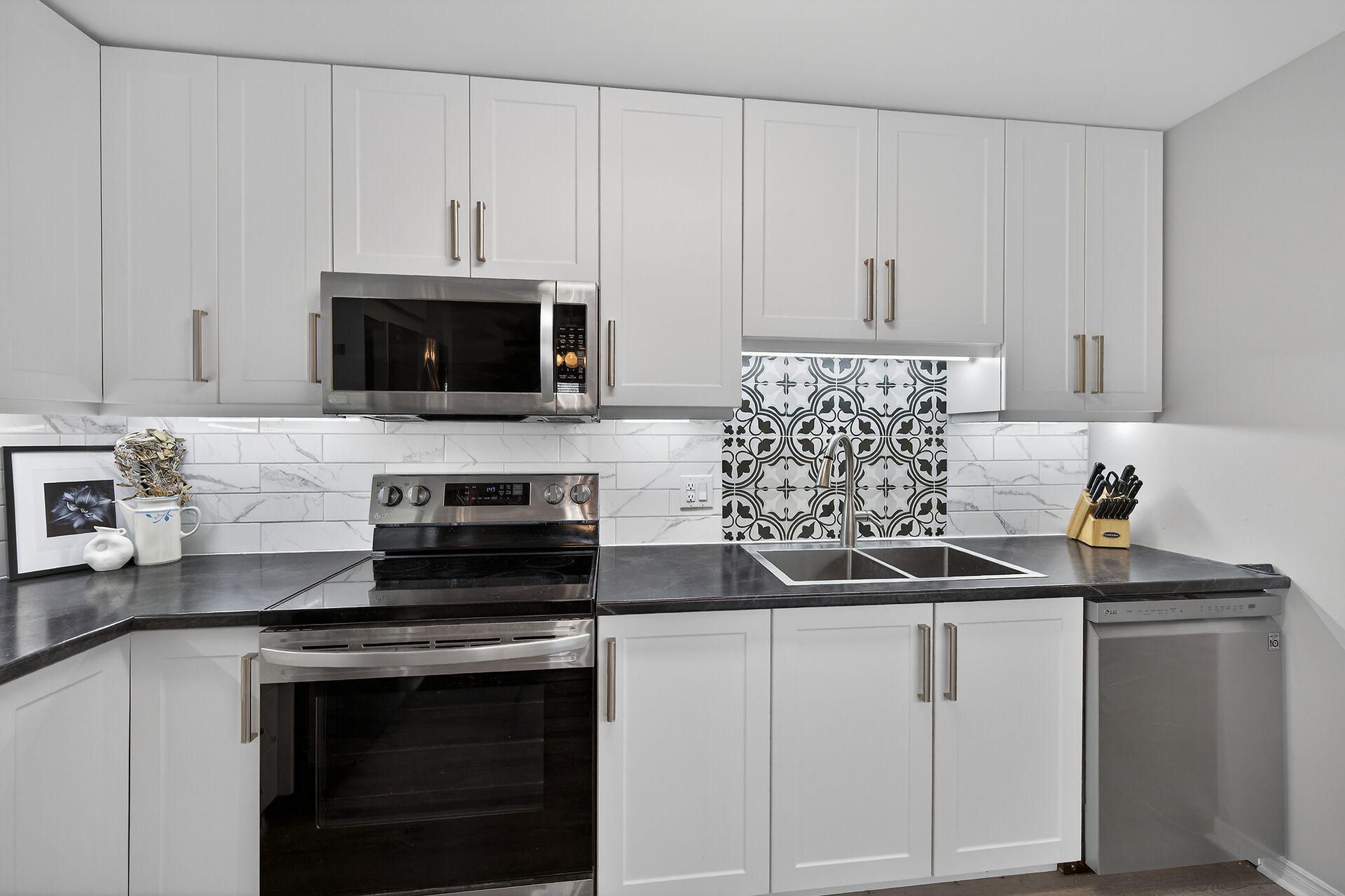 • Updated kitchen with modern appliances and stylish tile backsplash.