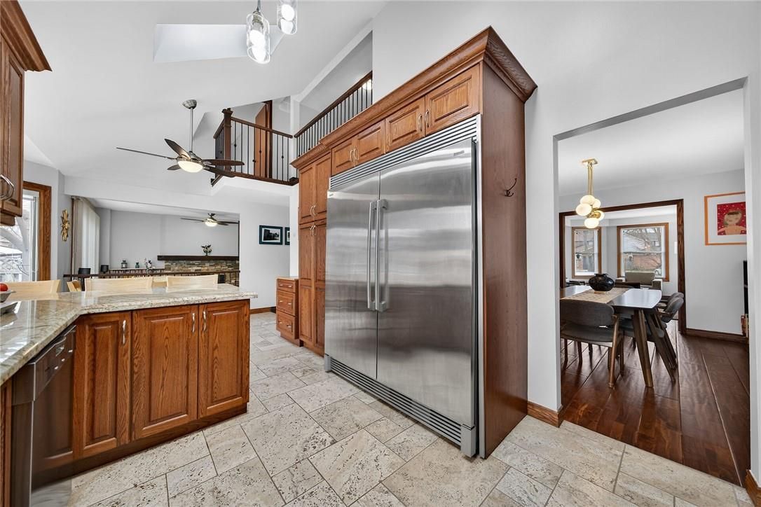 • Modern kitchen features Travertine tile, granite countertops, and upscale appliances.