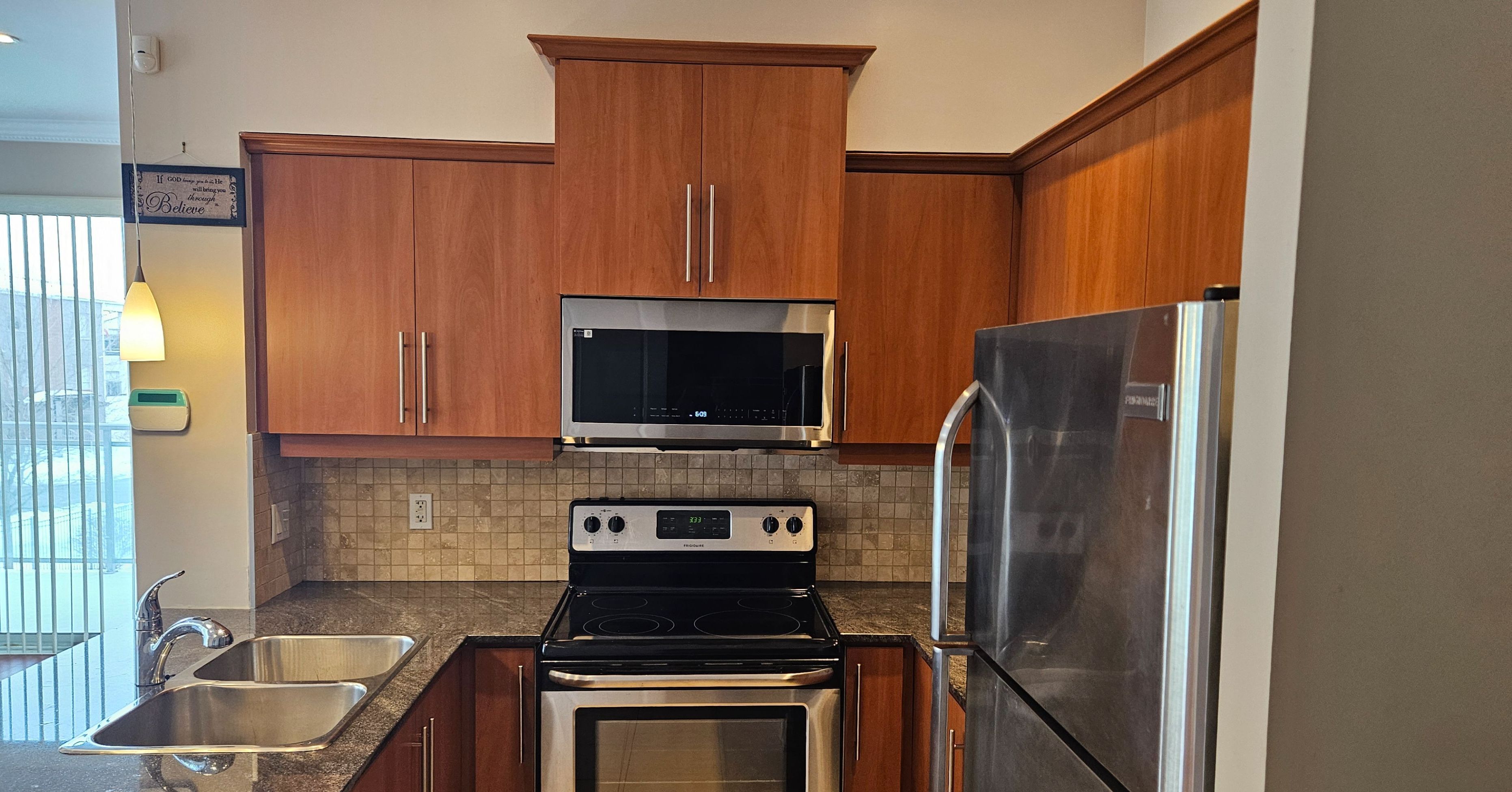 • Well-arranged kitchen featuring granite countertops and modern appliances.