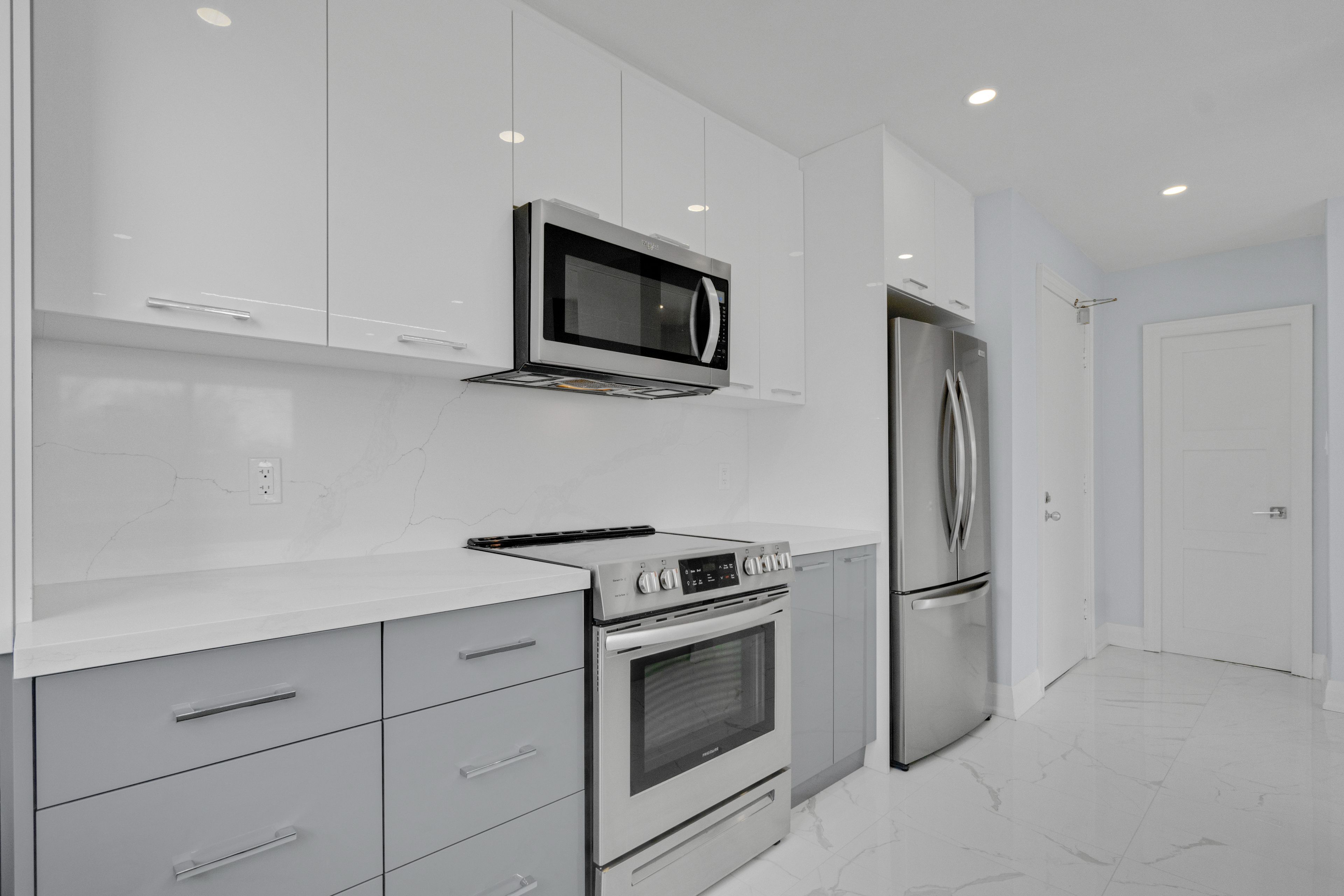 • Stylish kitchen featuring stainless steel appliances and quartz countertops.