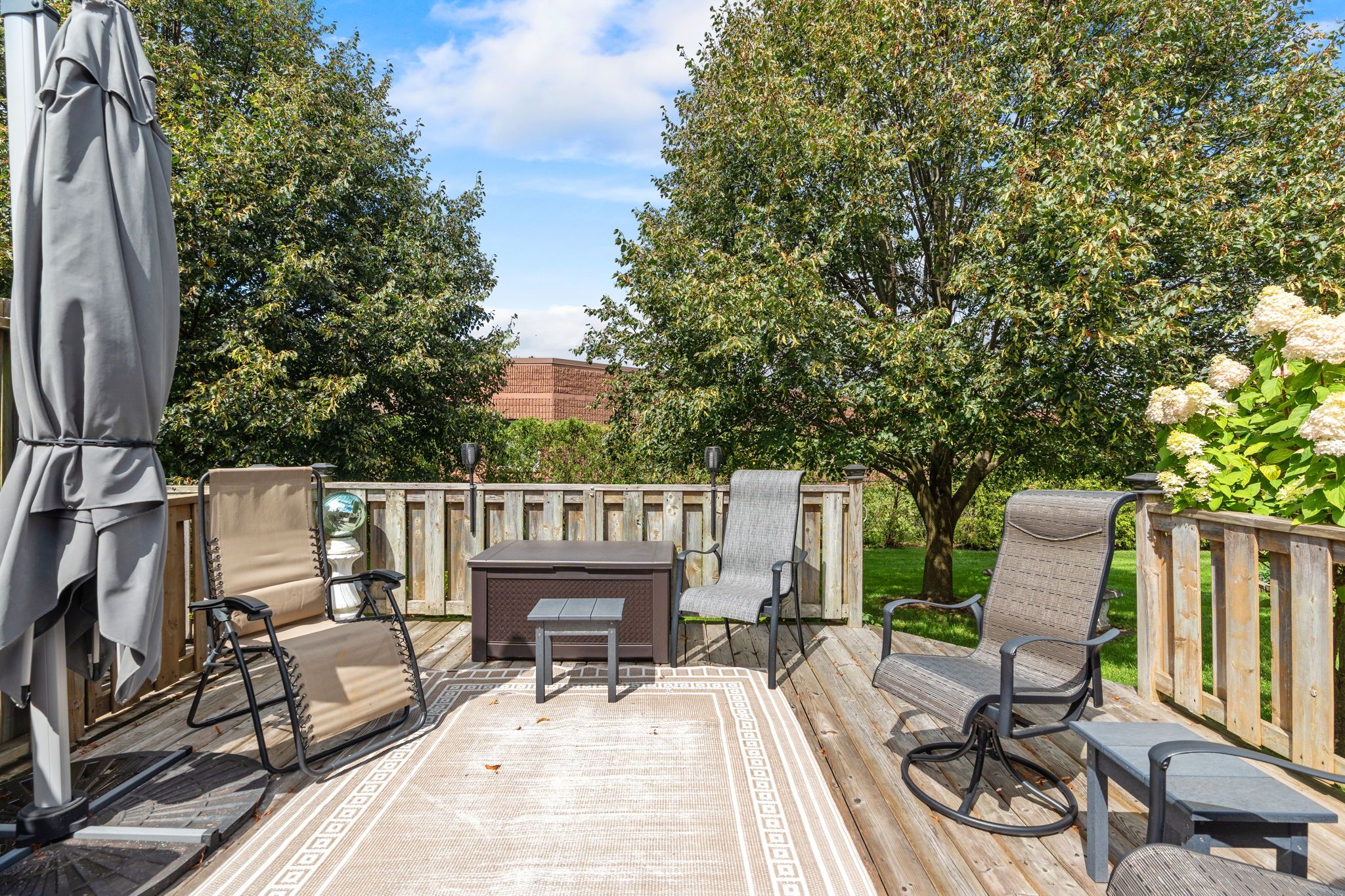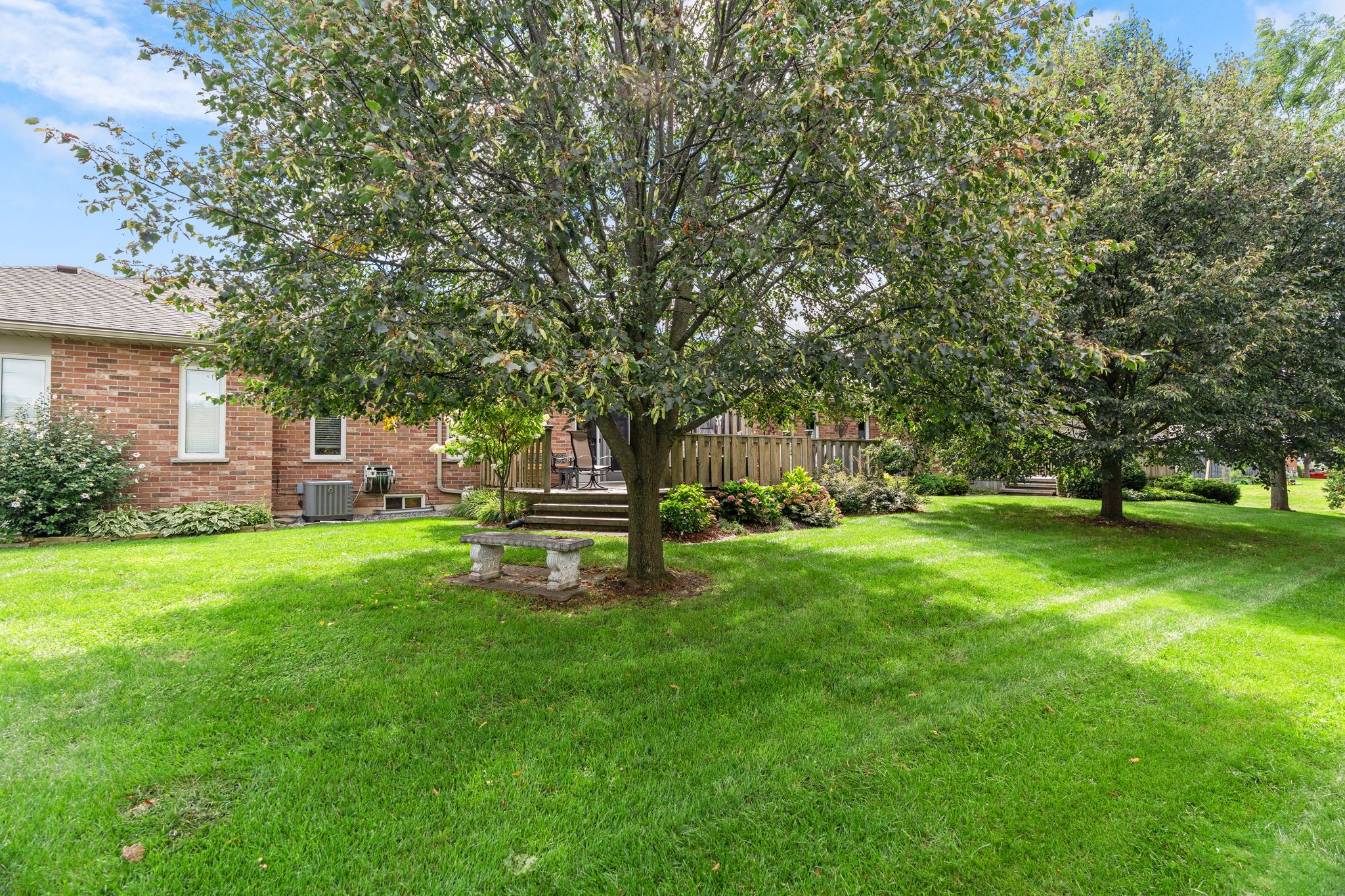 • Large rear deck surrounded by landscaping for outdoor relaxation.
