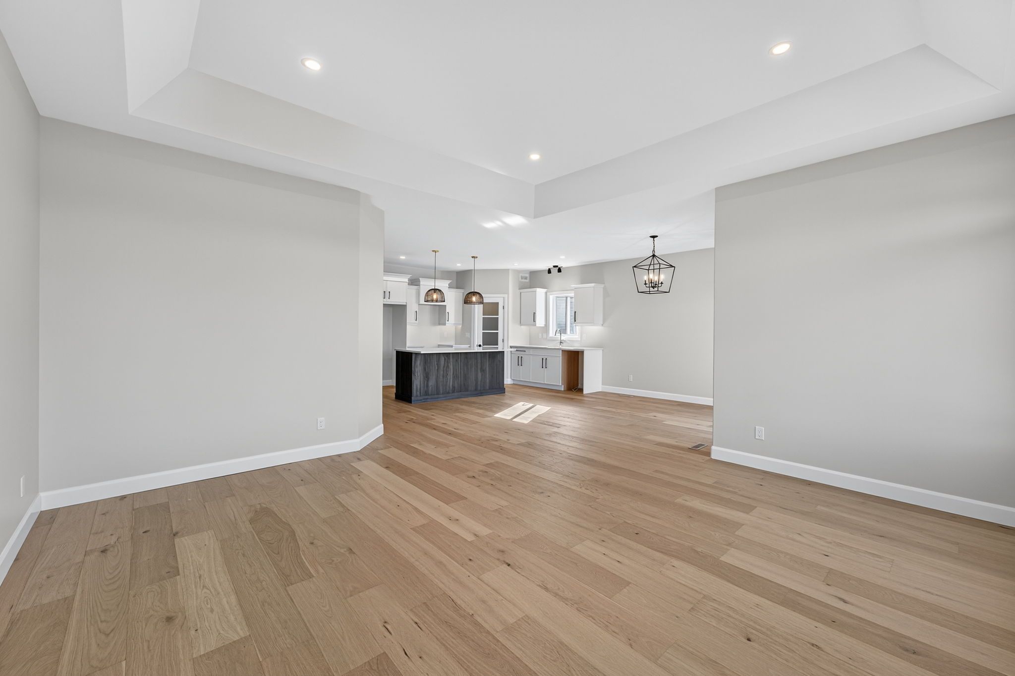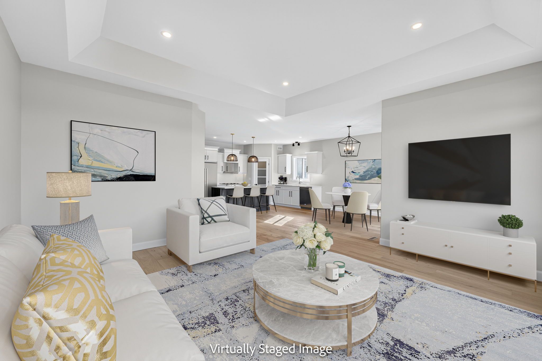 • Open-concept design featuring a custom kitchen and coffered ceiling in the living room.