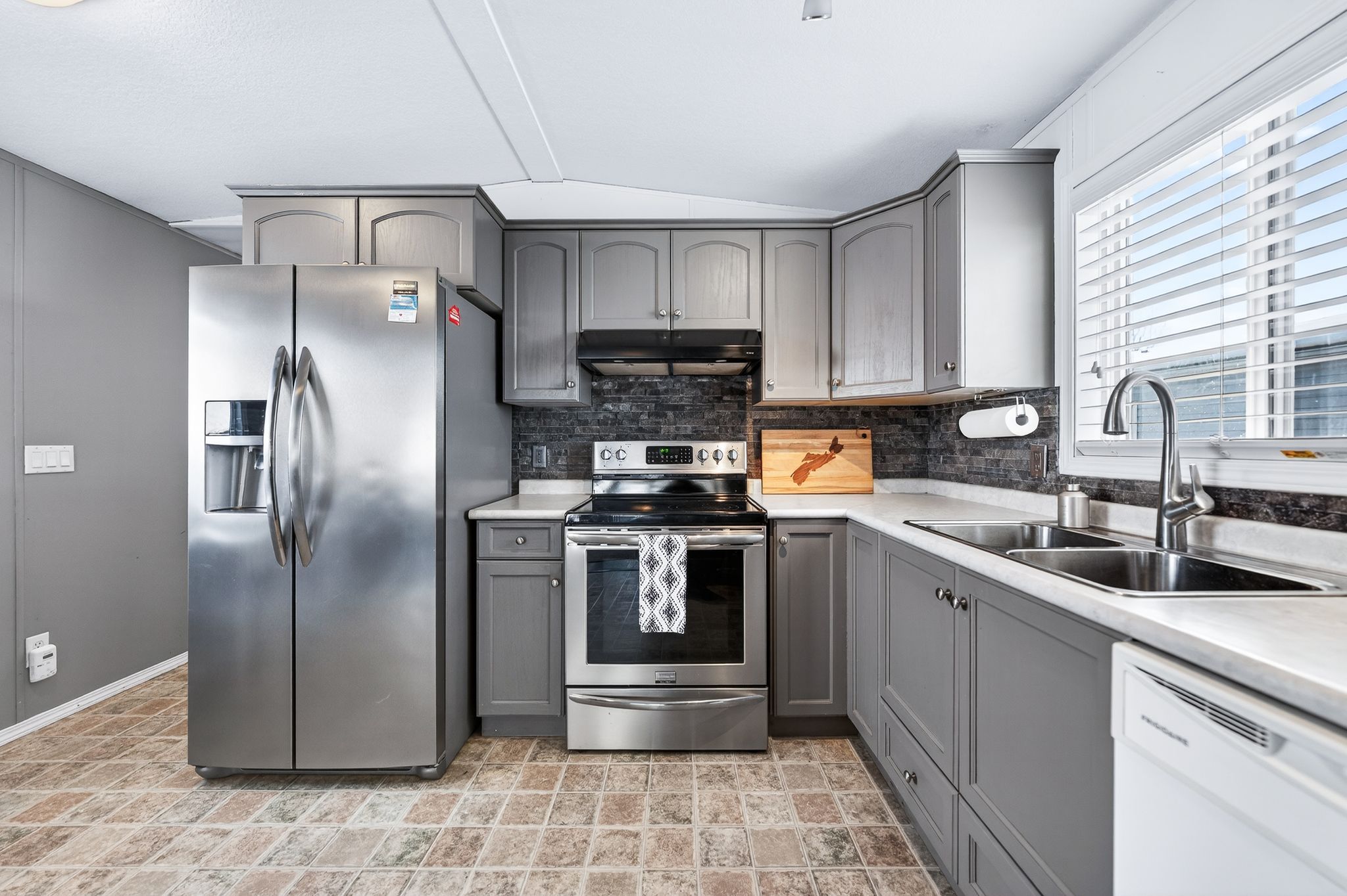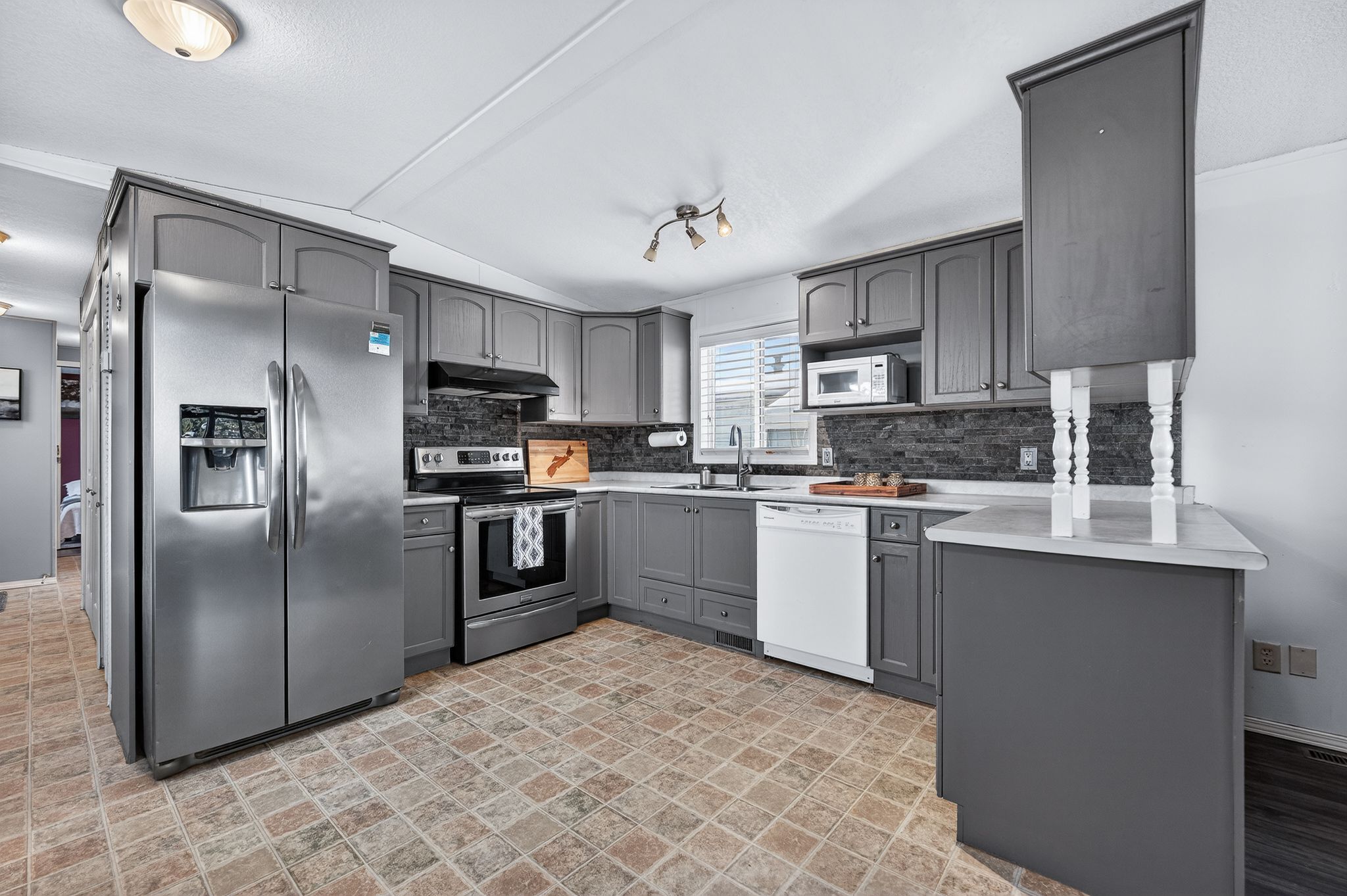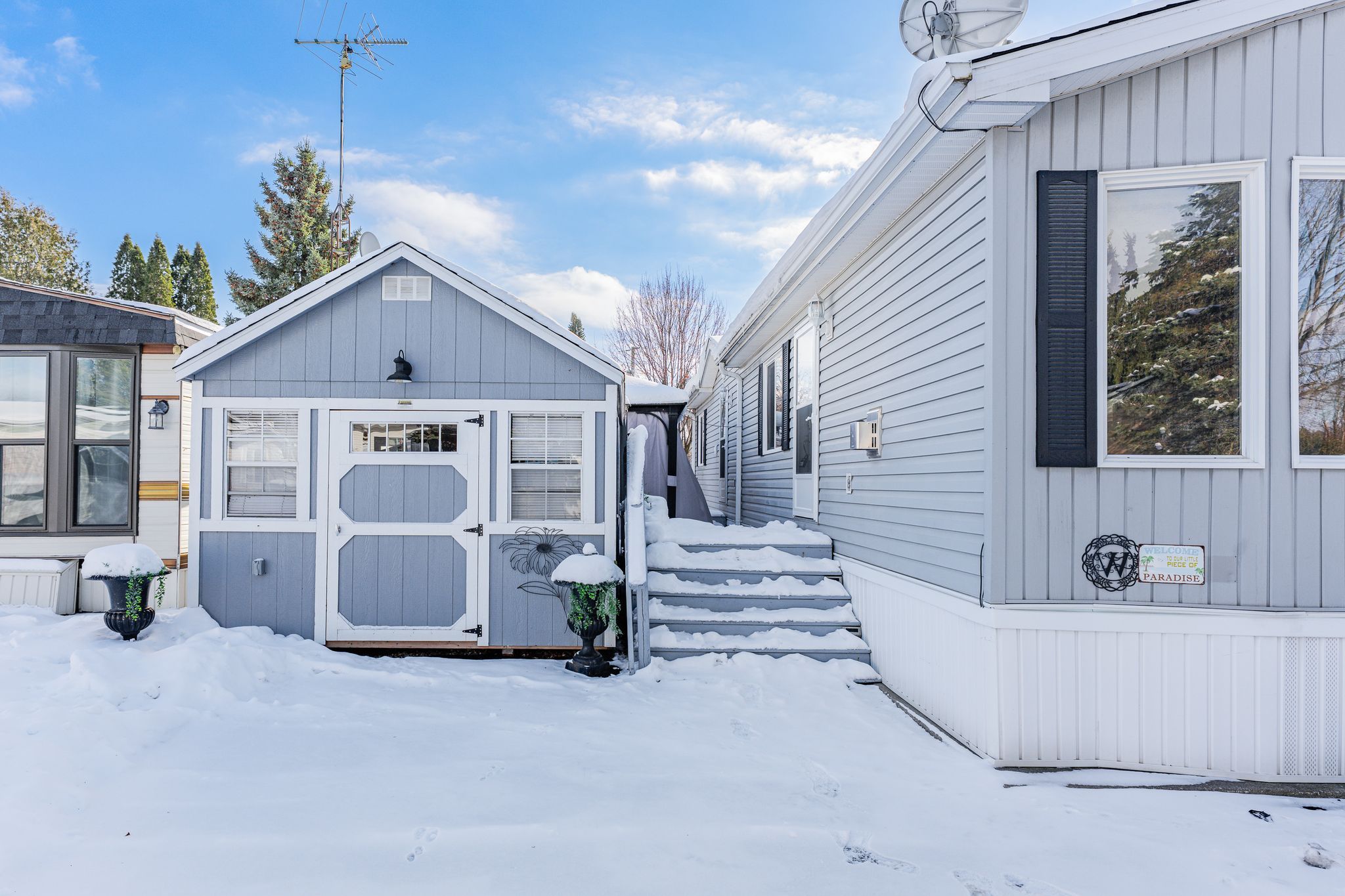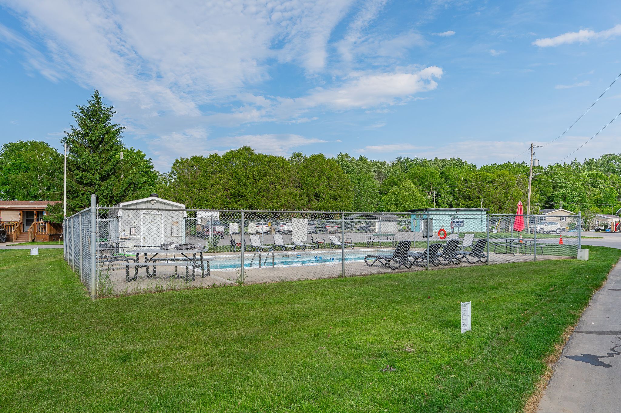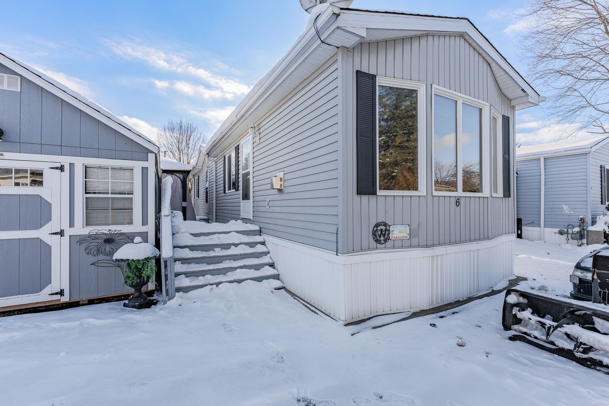 Cosy up in front of the fireplace! This charming home is located in a year round gated community and is perfectly situated on a quiet, private lot. You'll find all the comforts of home with plenty of charm, including the cozy natural gas fireplace featuring a beautiful stone surround and mantel. The open-concept living area is ideal for entertaining or simply enjoying everyday life, whether you're cooking dinner or catching up on your favourite show, you're always part of the conversation. Down the hall, the primary bedroom is peacefully tucked away at the back of the home, perfect for sleeping. A well-appointed bathroom with a bright skylight sits conveniently between the primary and second bedroom, offering privacy and functionality. Outside enjoy meals on the deck or lounging in the yard. The shed (10' x 12') with front and rear door provides ample storage for your tools and toys. The true magic of mini lakes lies beyond your door where a sense of community envelopes you. There are activities for every interest-bocce, cards, darts, golf tournaments, walking clubs, and more you'll never run out of things to do. The driveway has been freshly paved and there is plenty of room to park 2 vehicles and a golf cart! Whether you're looking for a peaceful retreat or a fun-filled lifestyle, this home and resort style community have it all.