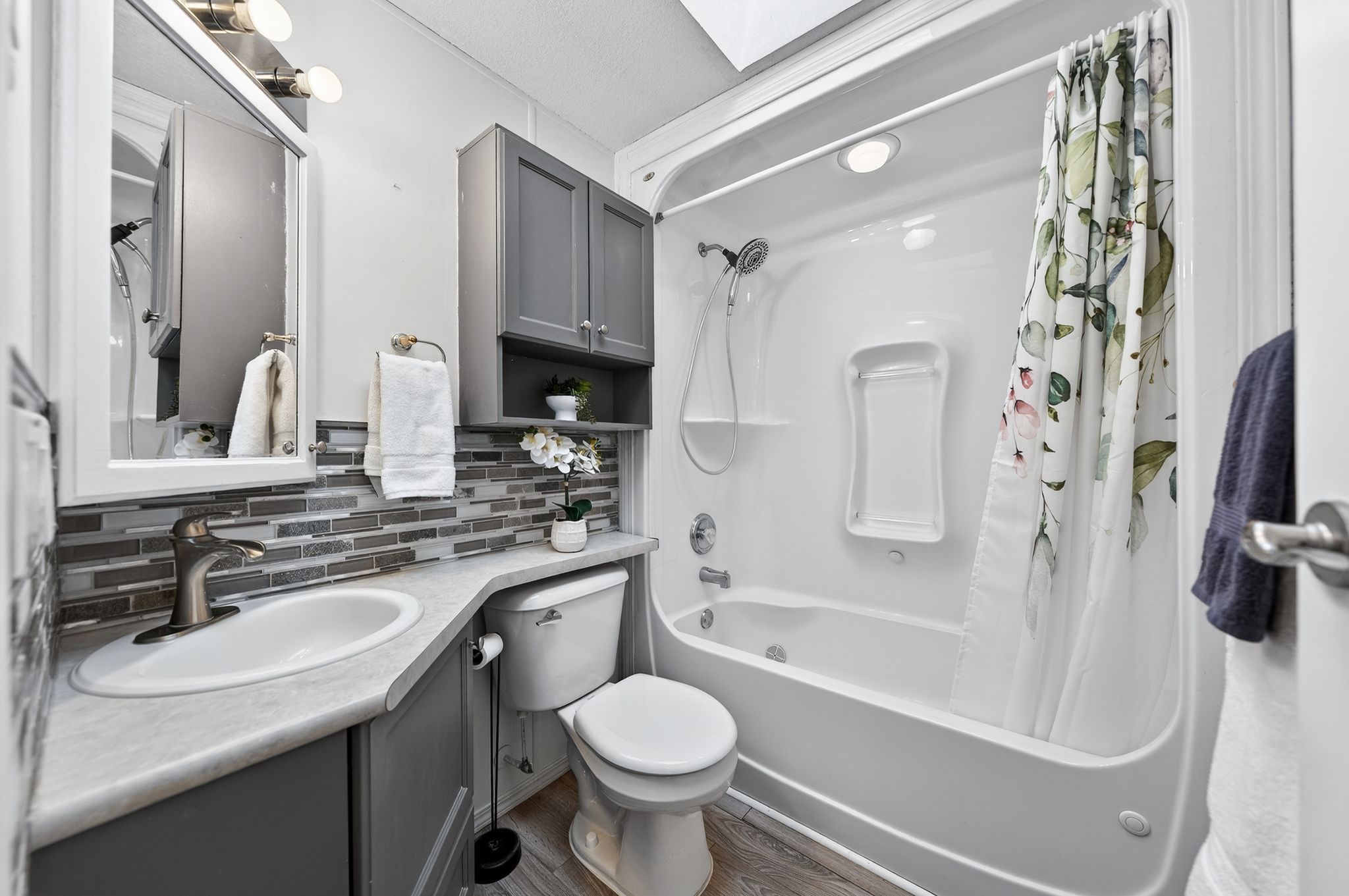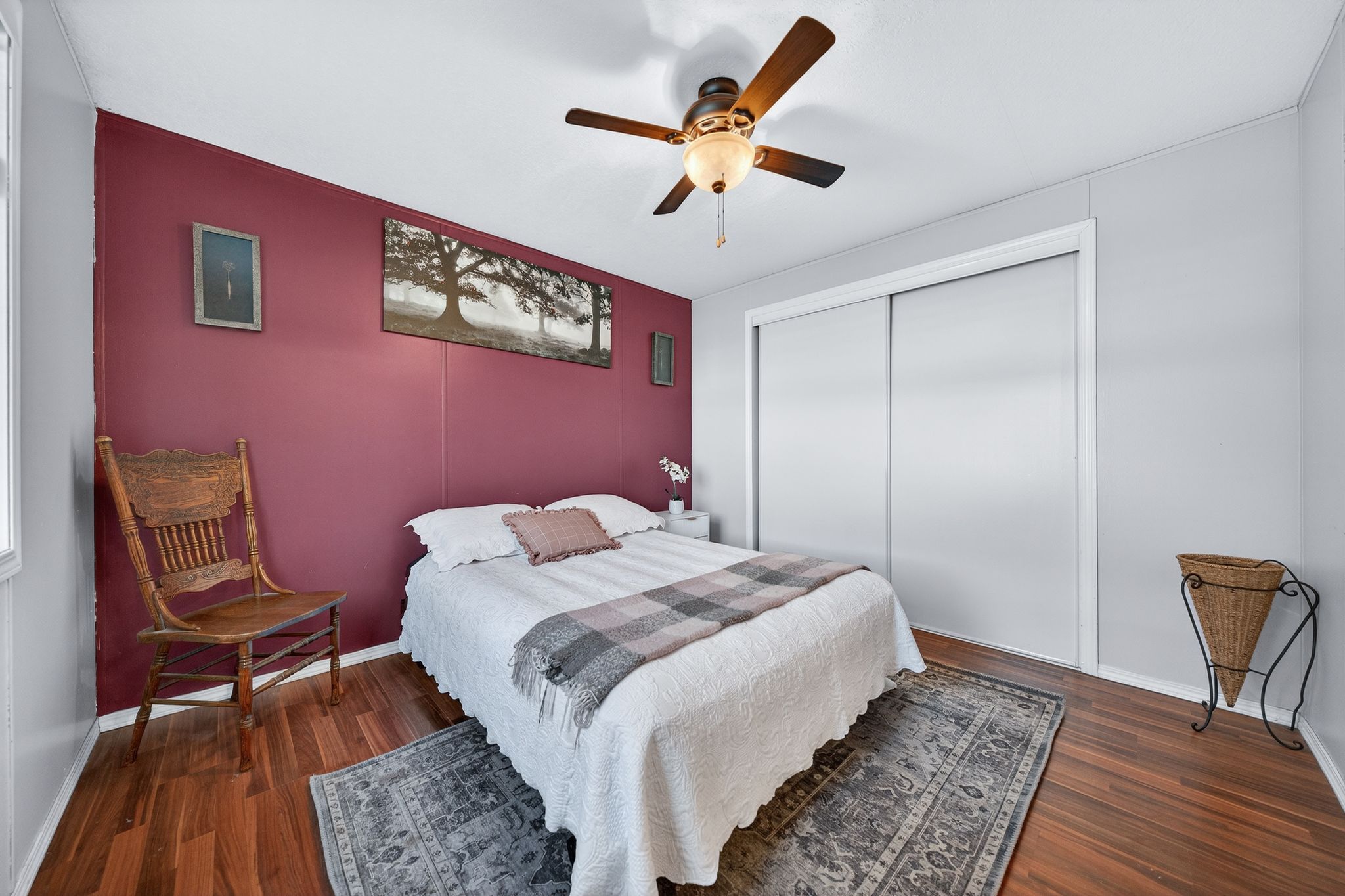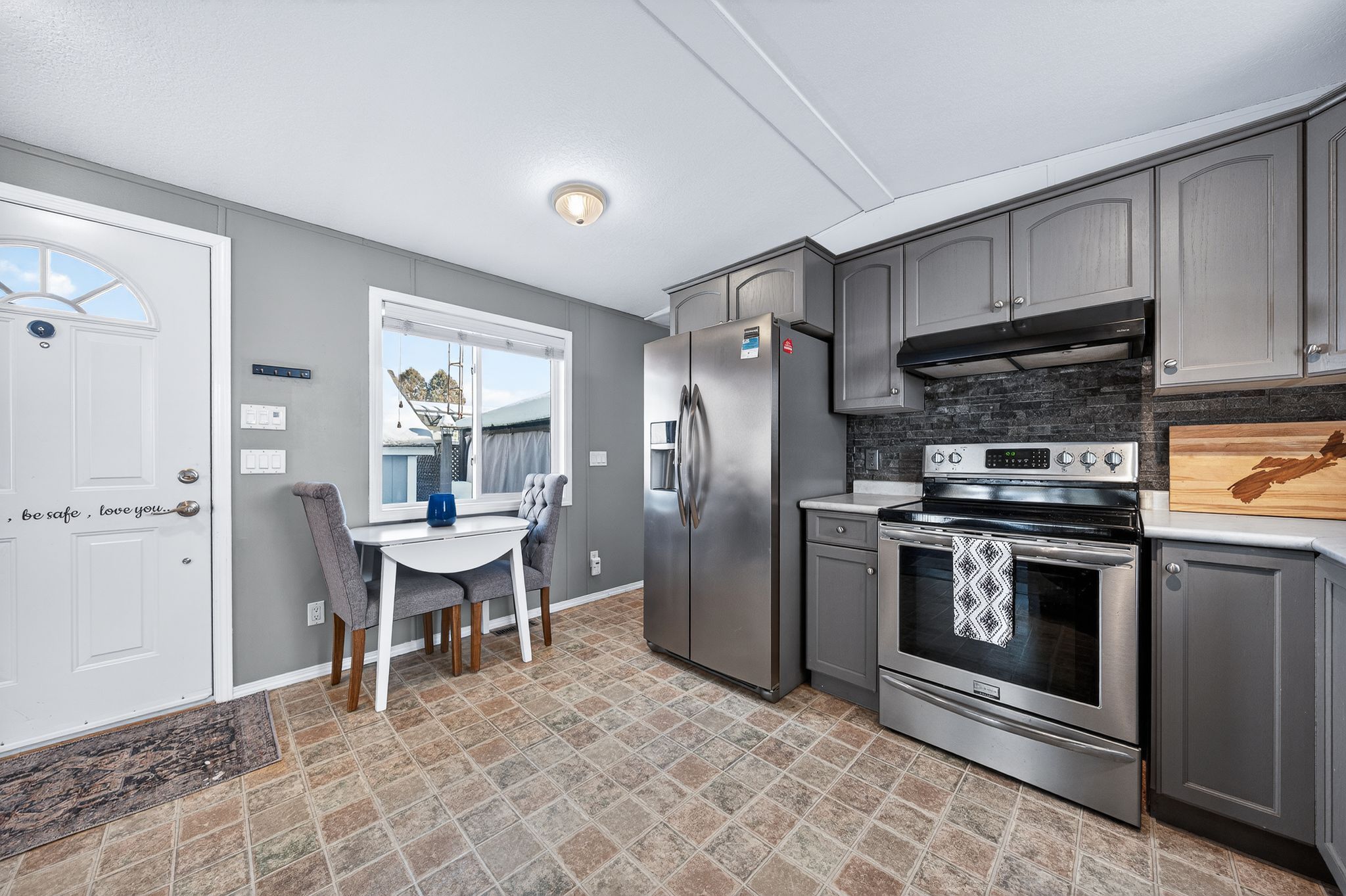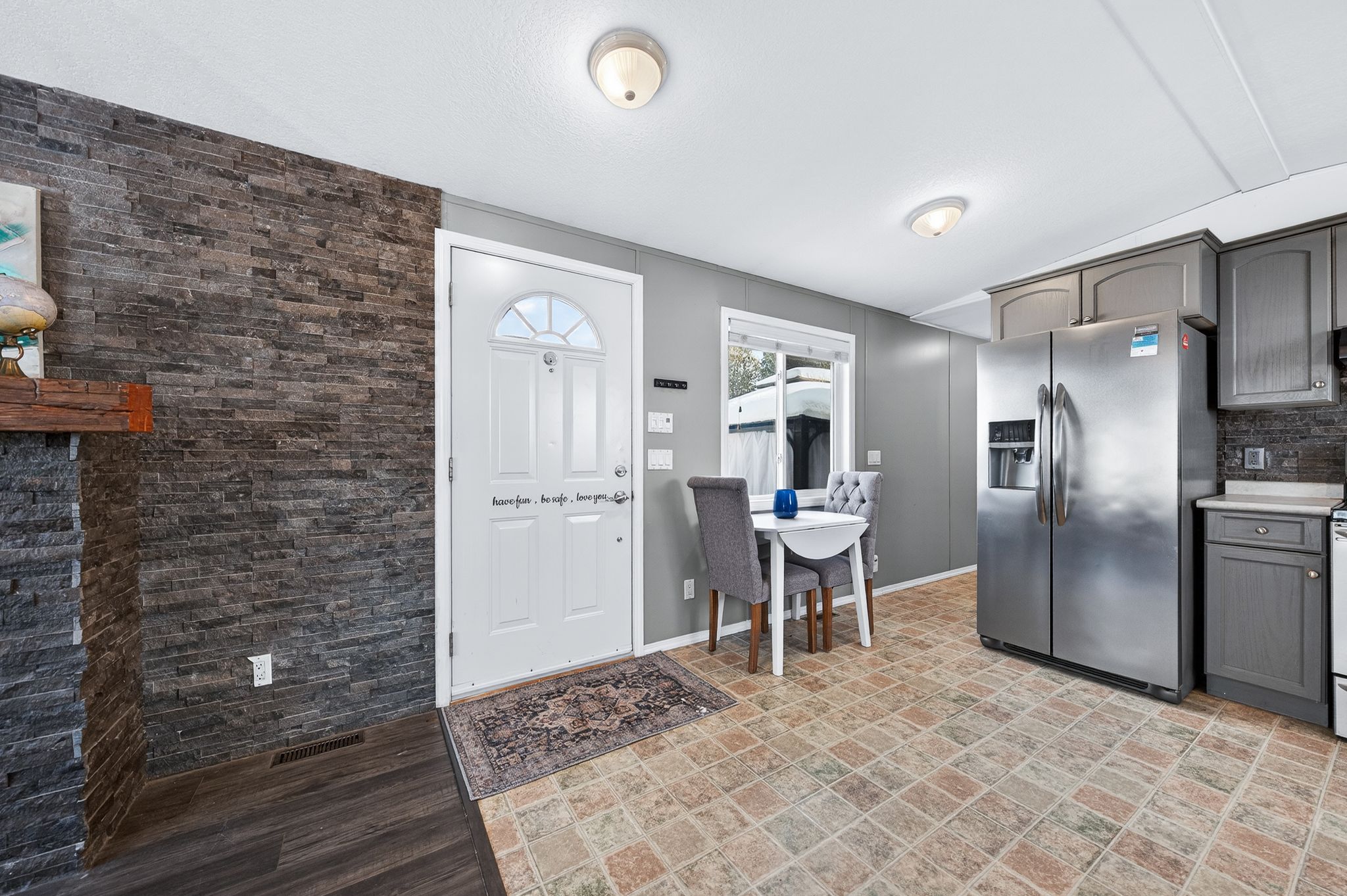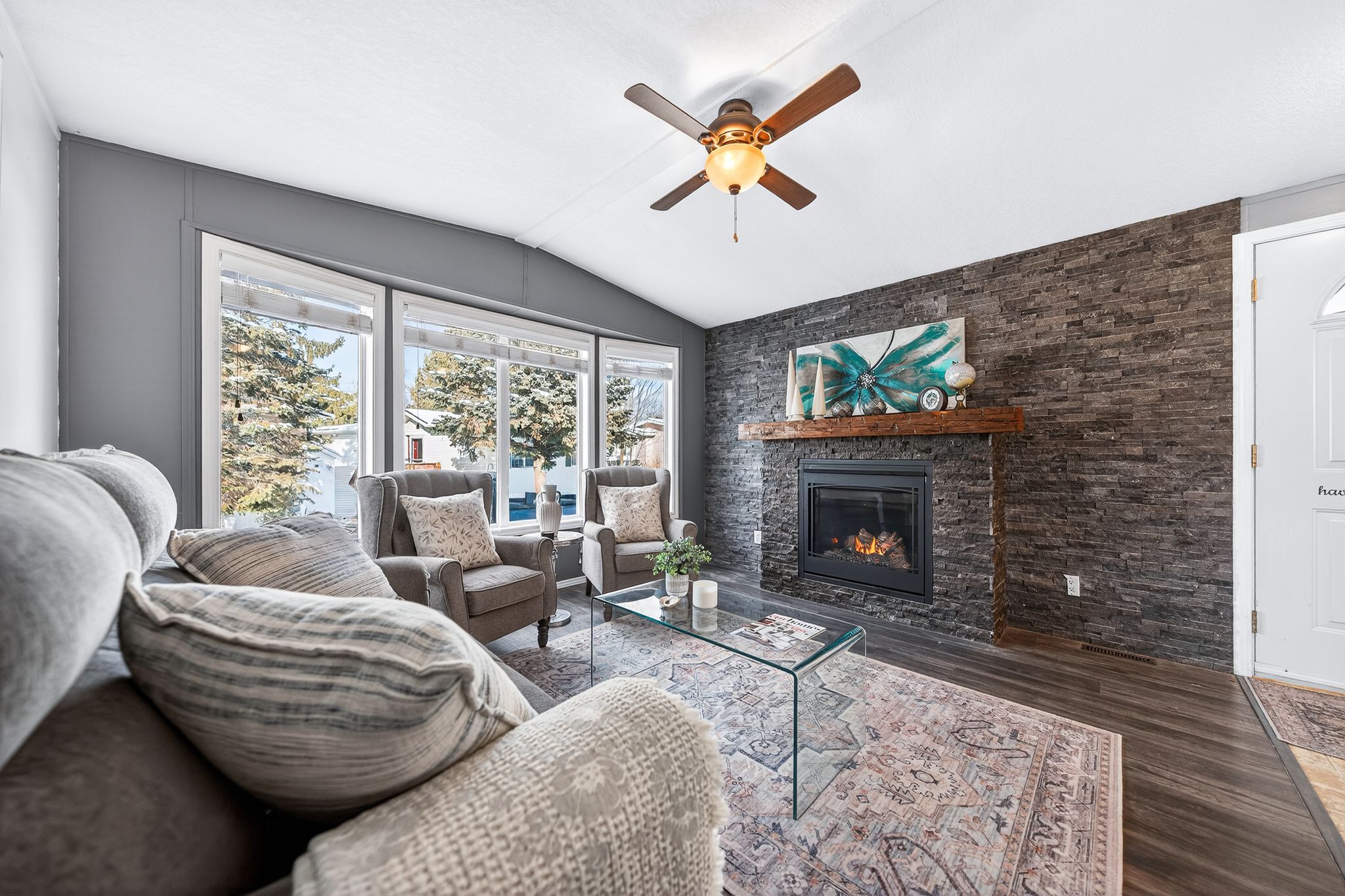 • Cozy natural gas fireplace with stone surround adds warmth and charm.