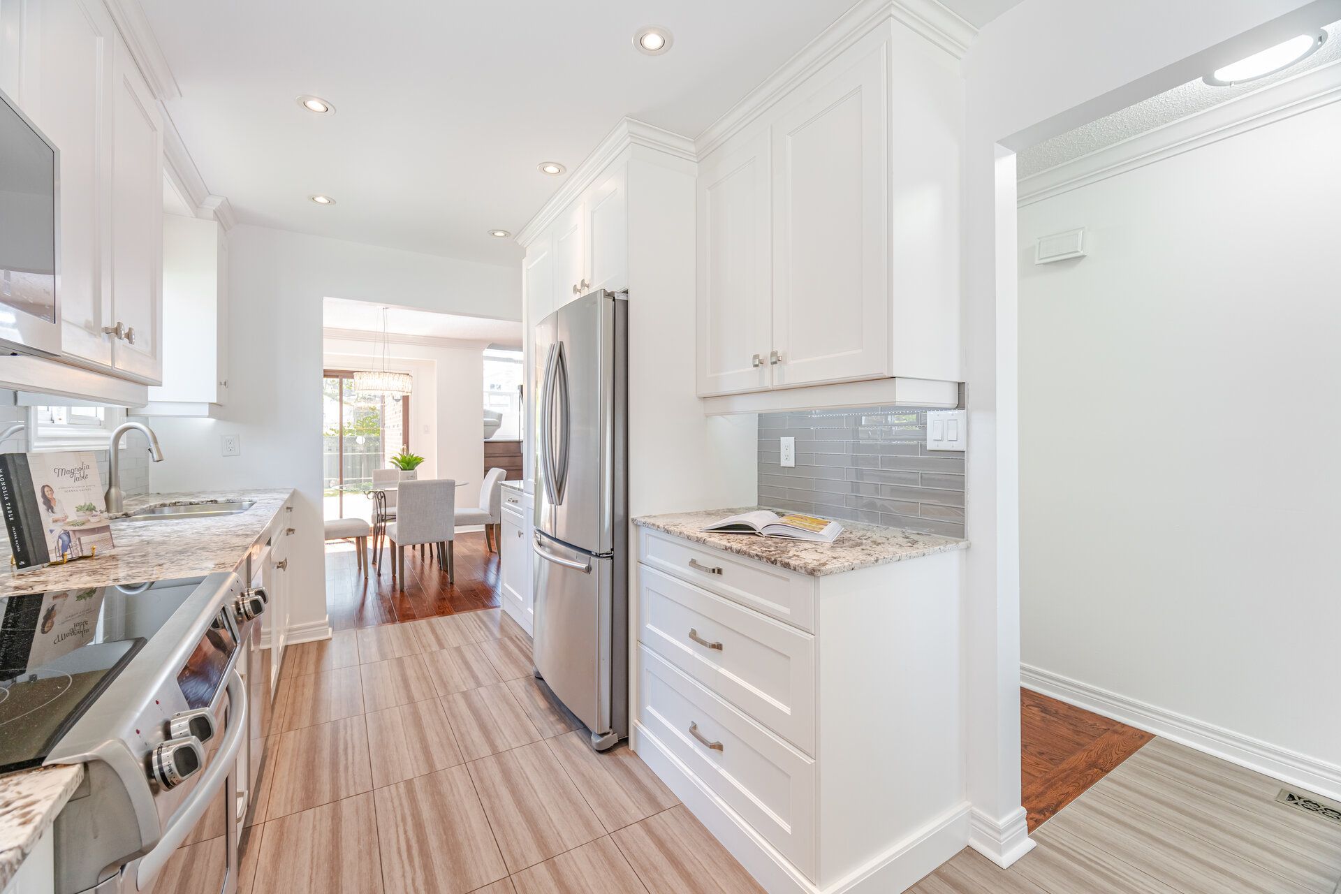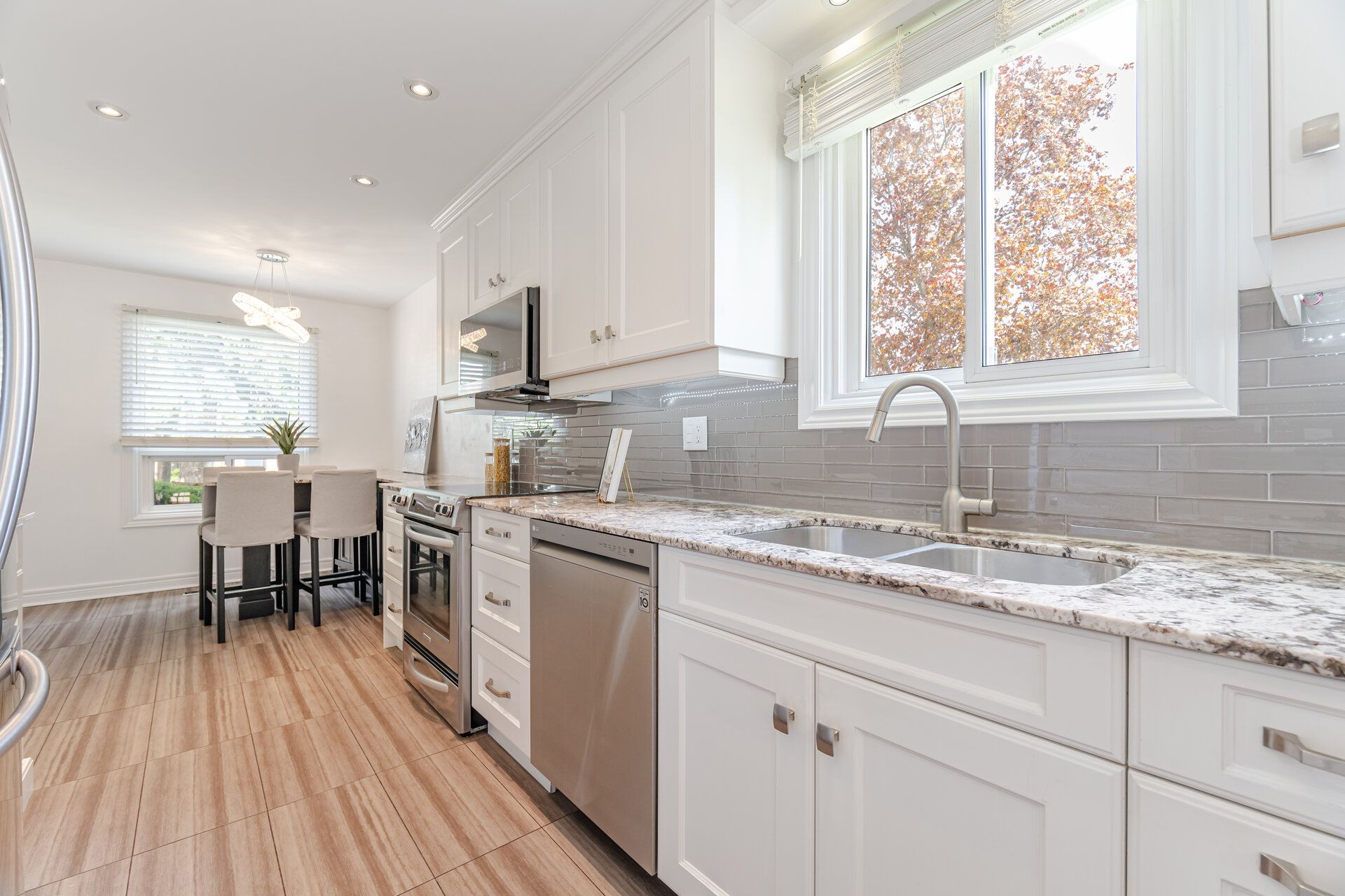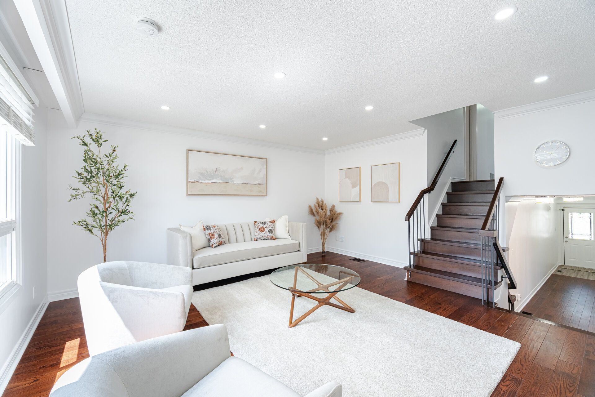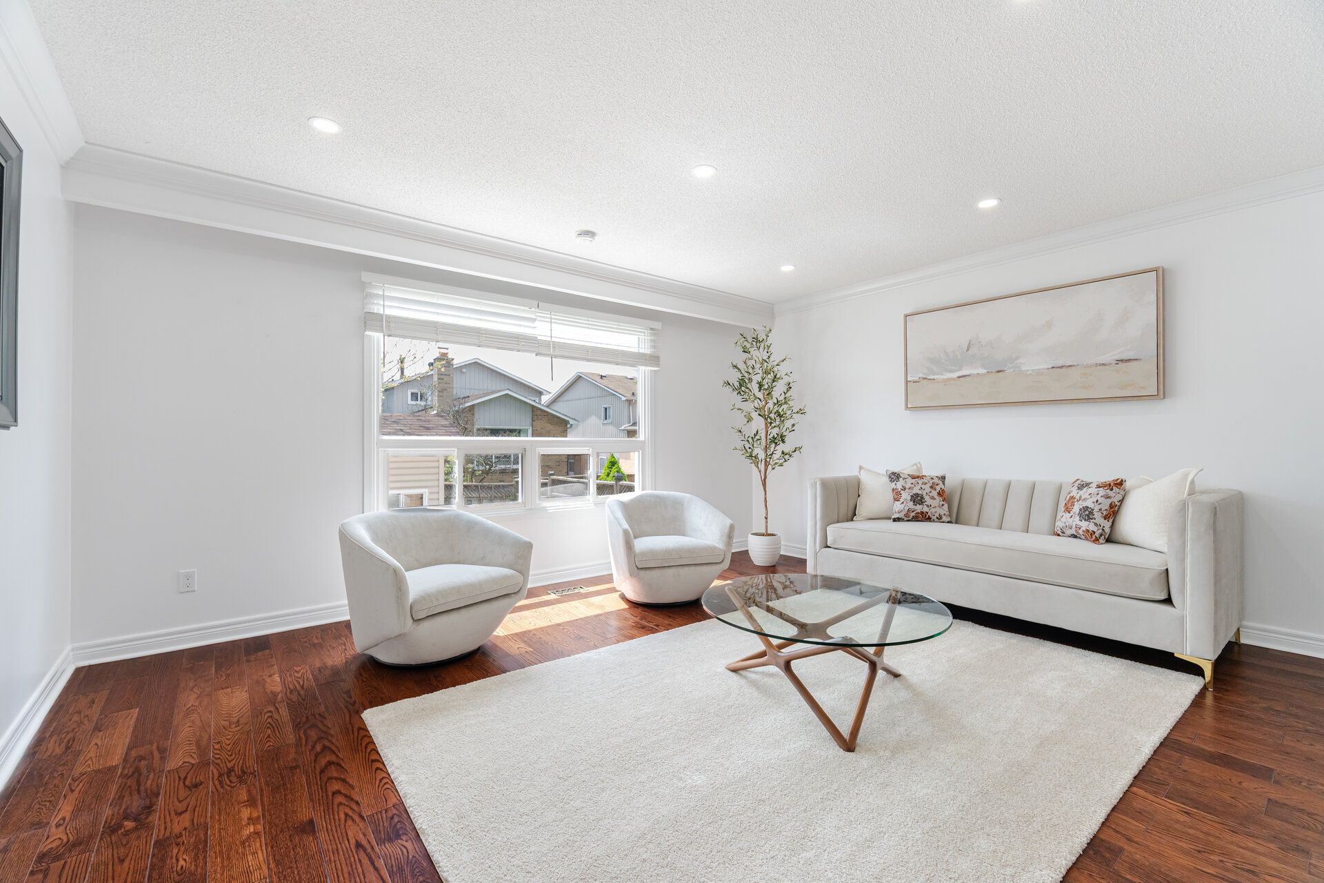 • Modern hardwood flooring and sun-filled open-concept living and dining area.