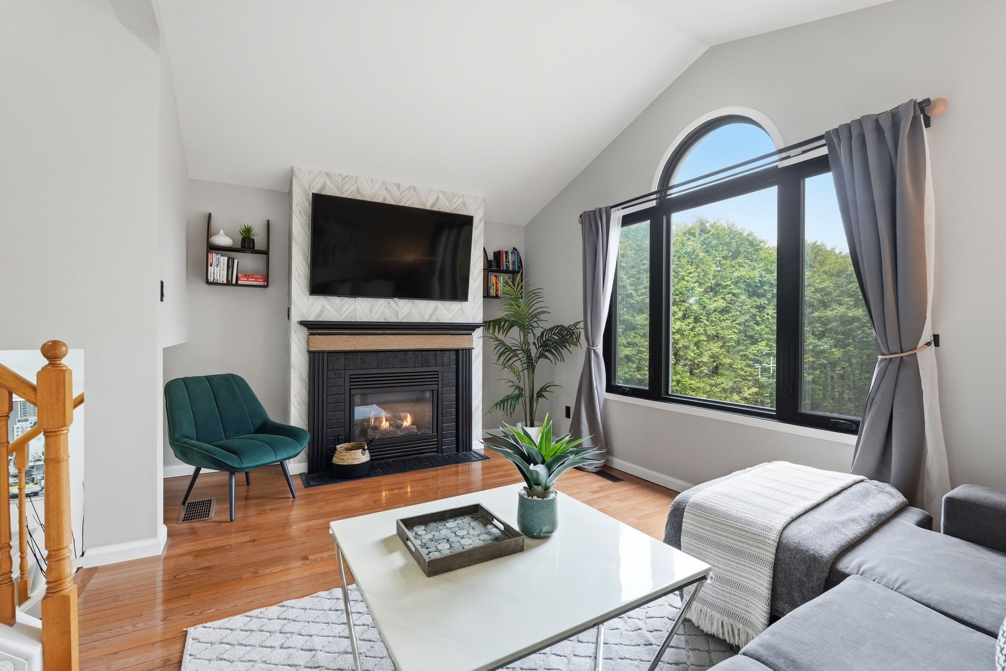 • Cozy living room with vaulted ceilings and natural gas fireplace.