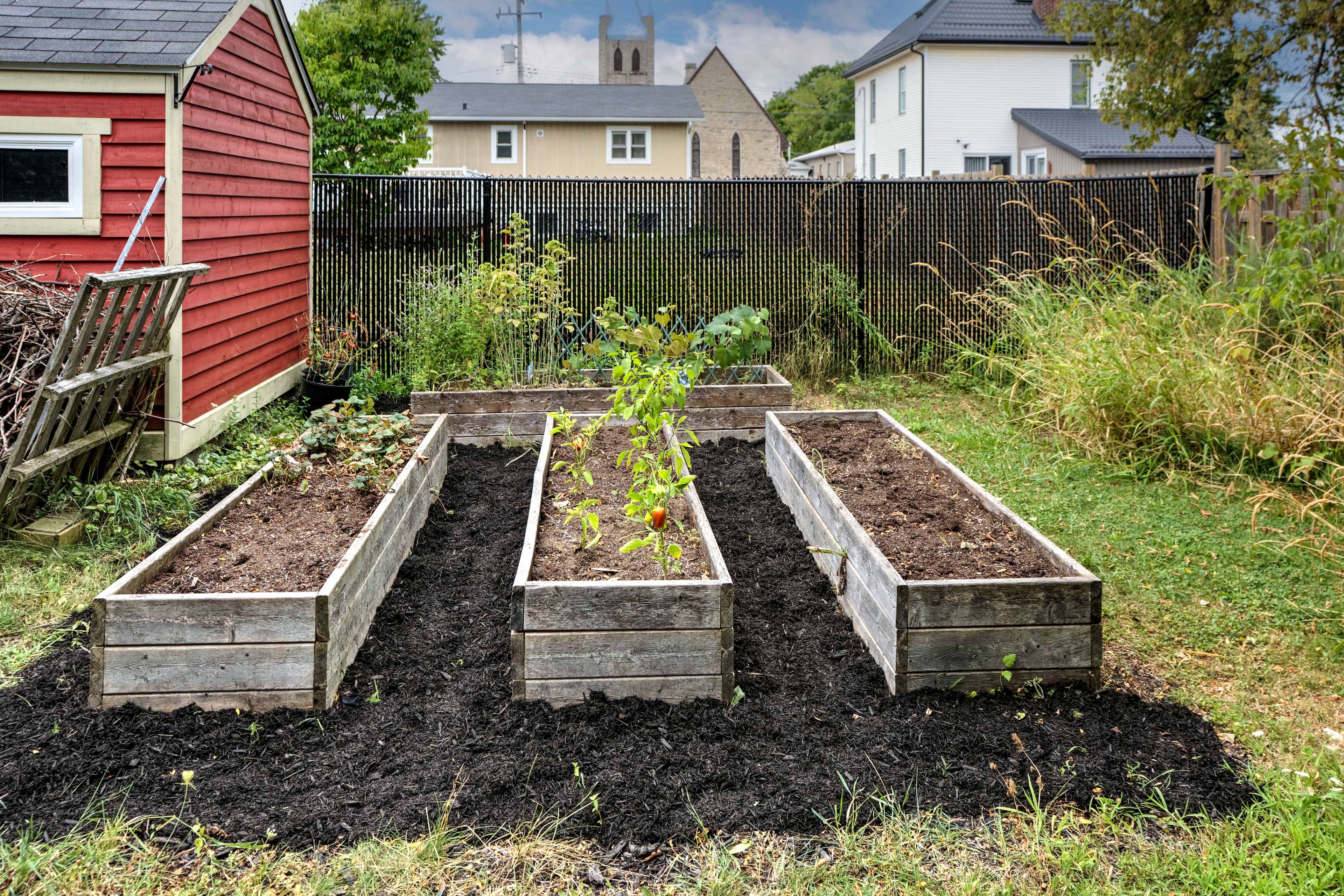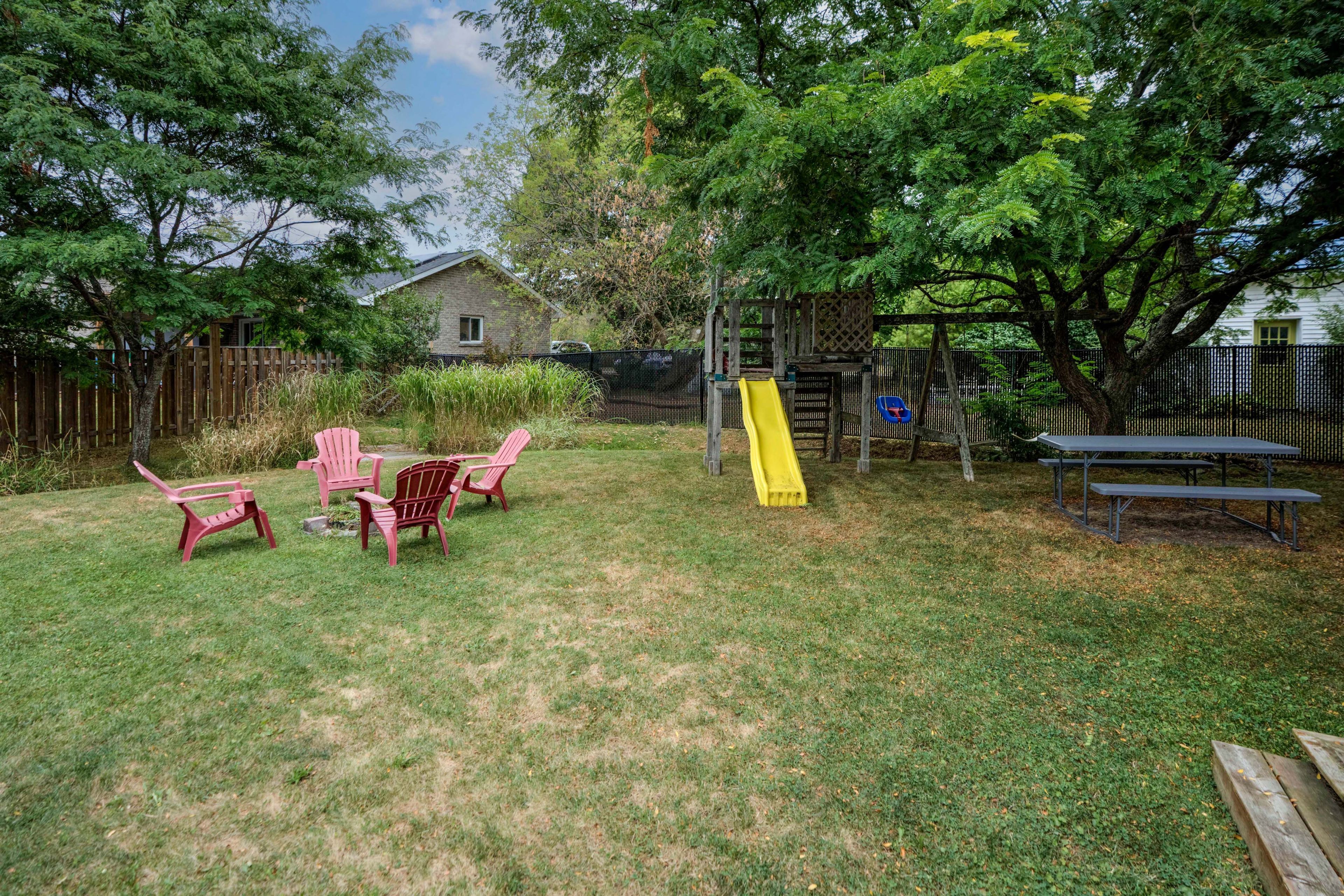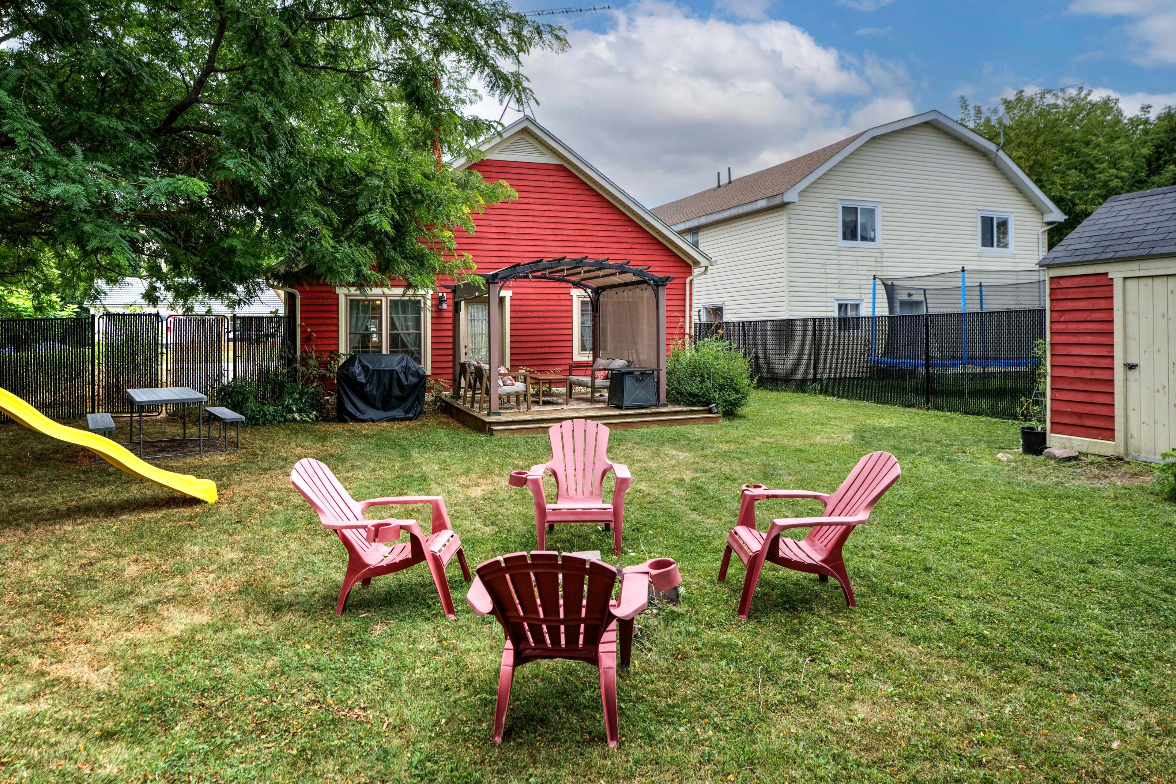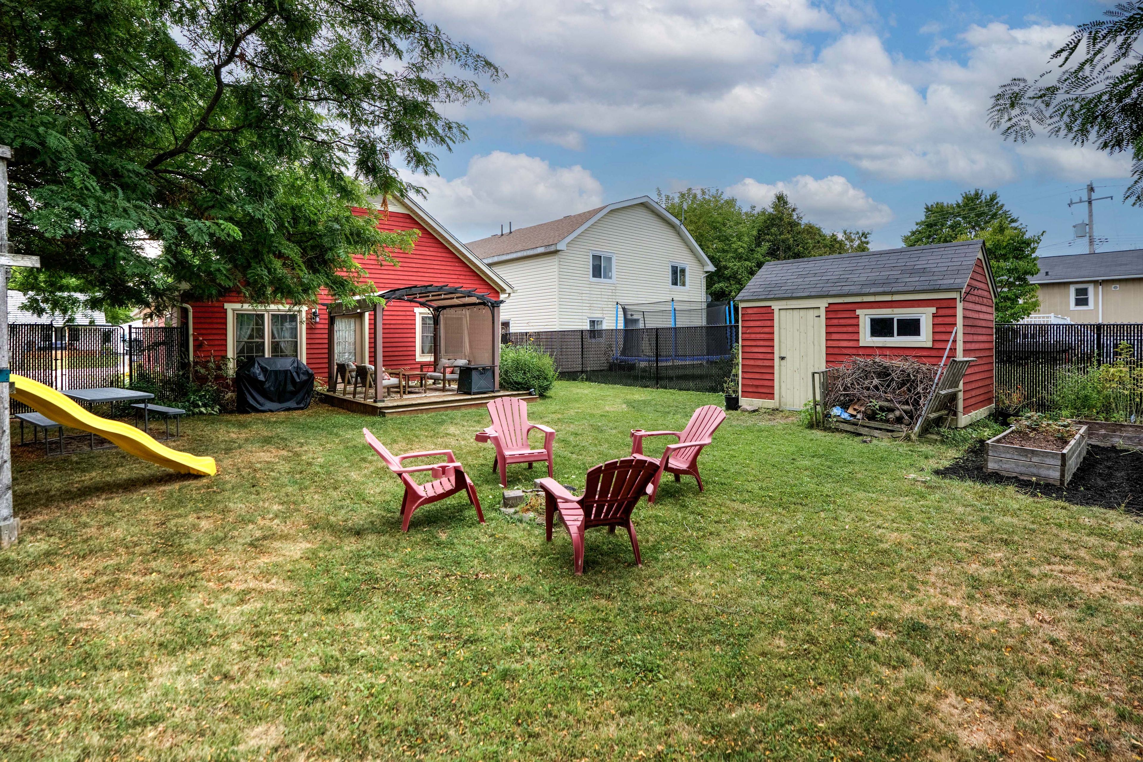• Large fenced yard with play structure and garden shed for outdoor fun.
