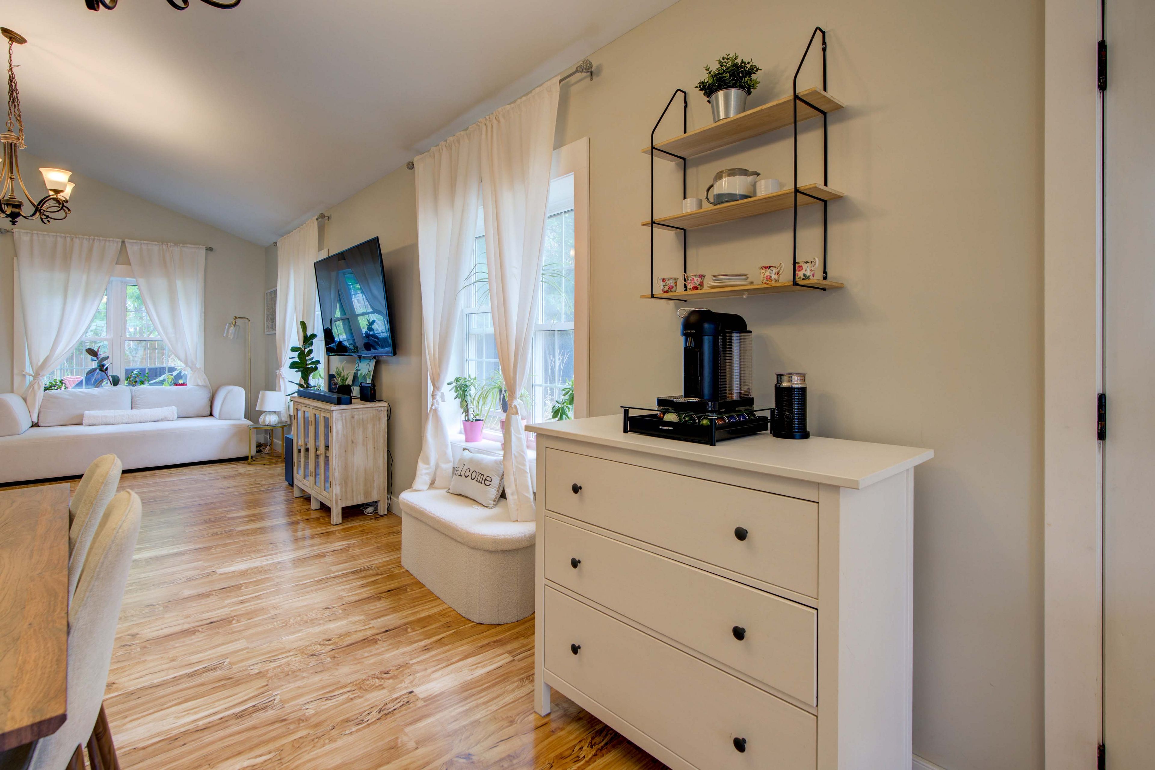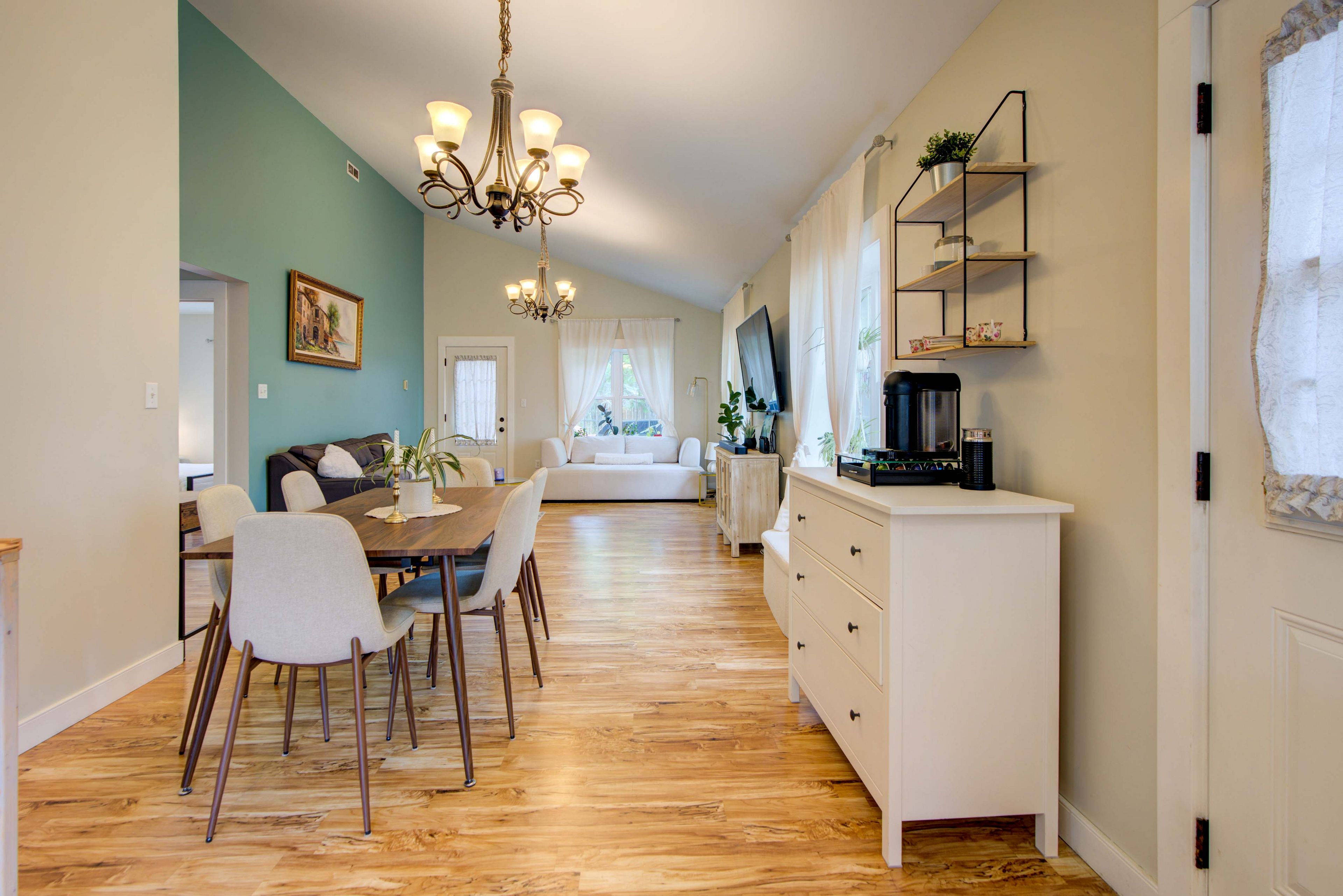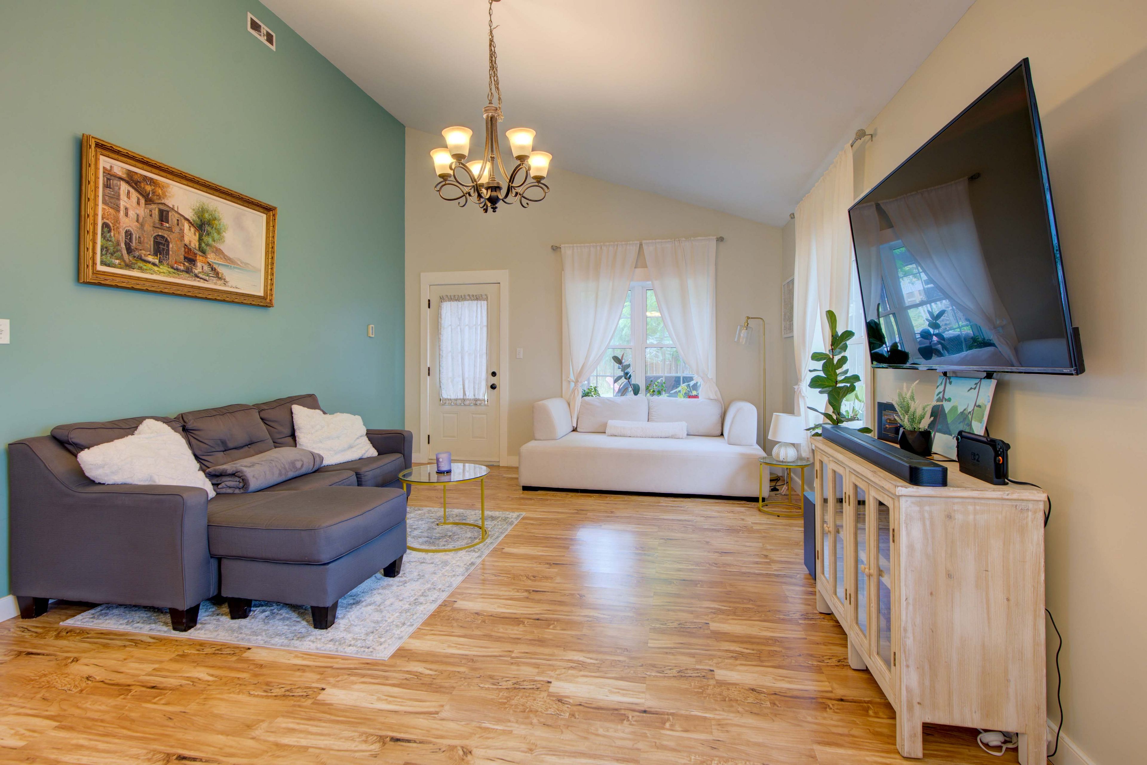 • Bright open-concept space with high vaulted ceilings for an airy atmosphere.