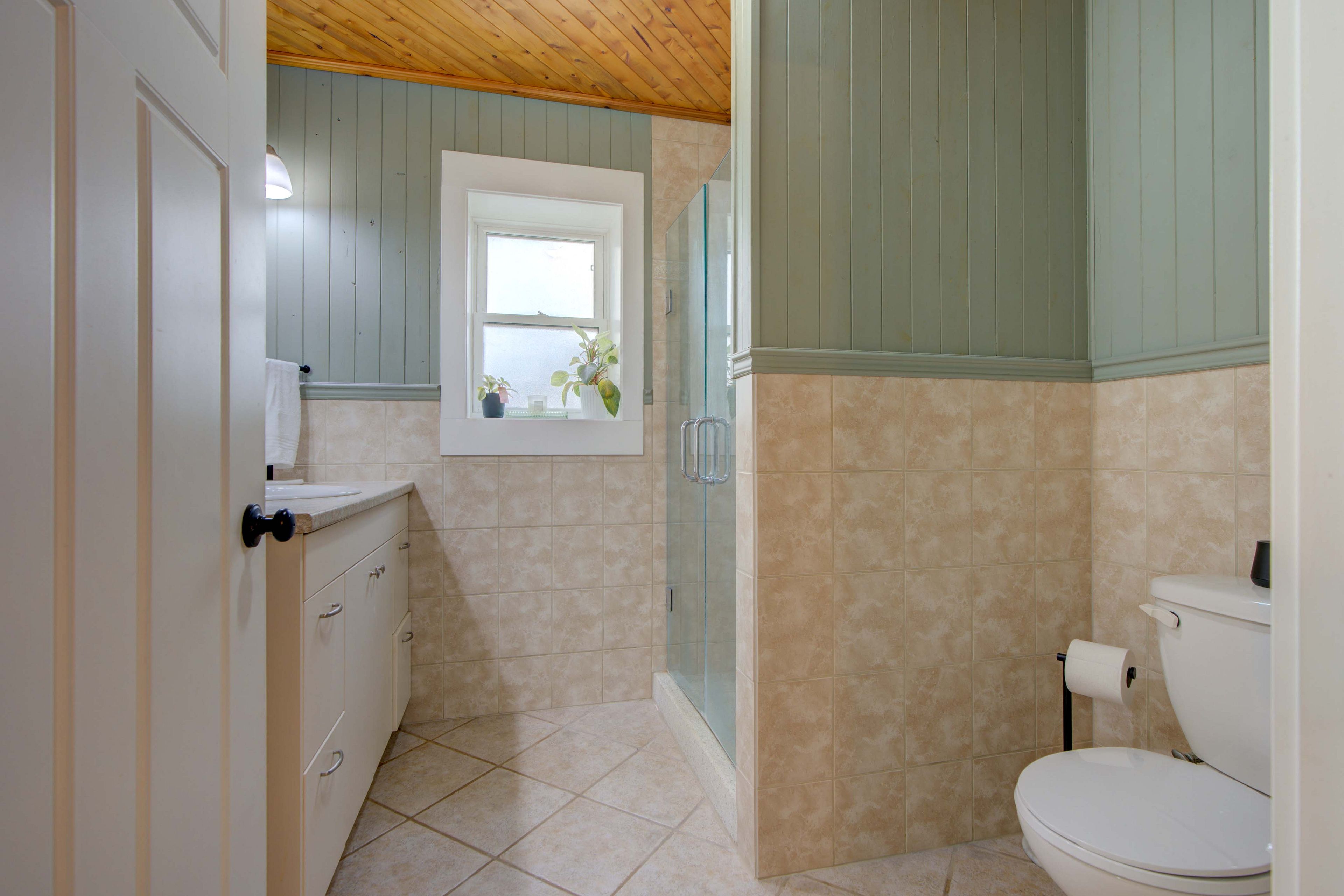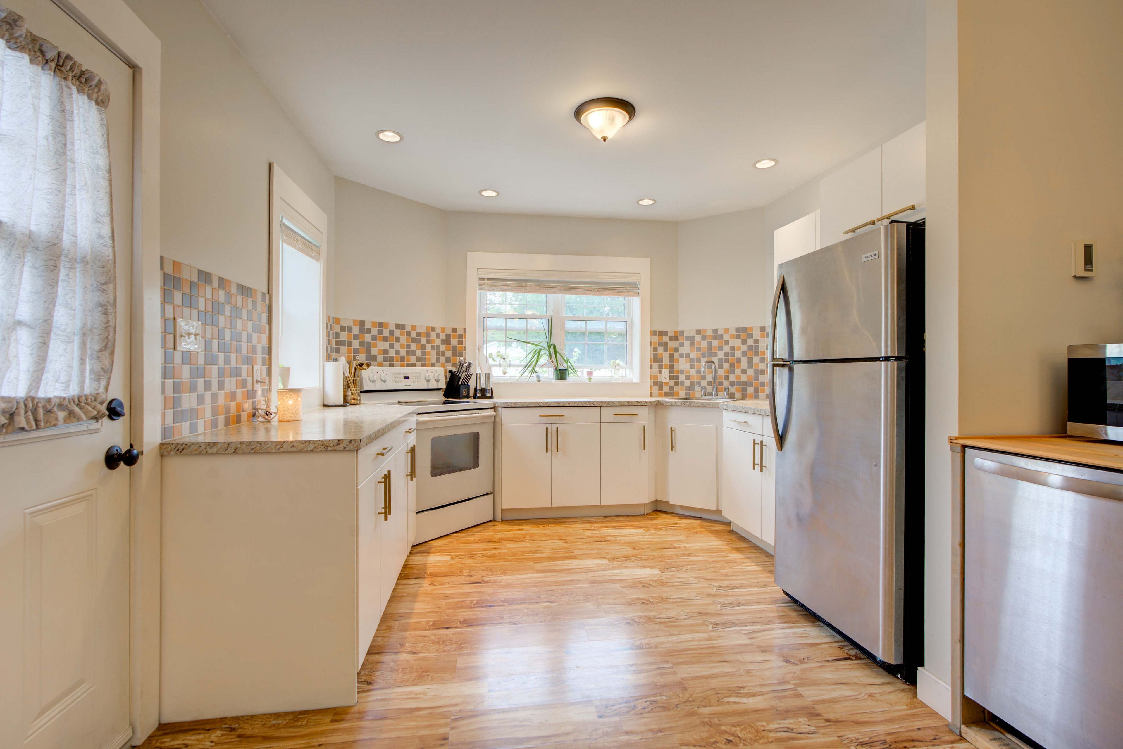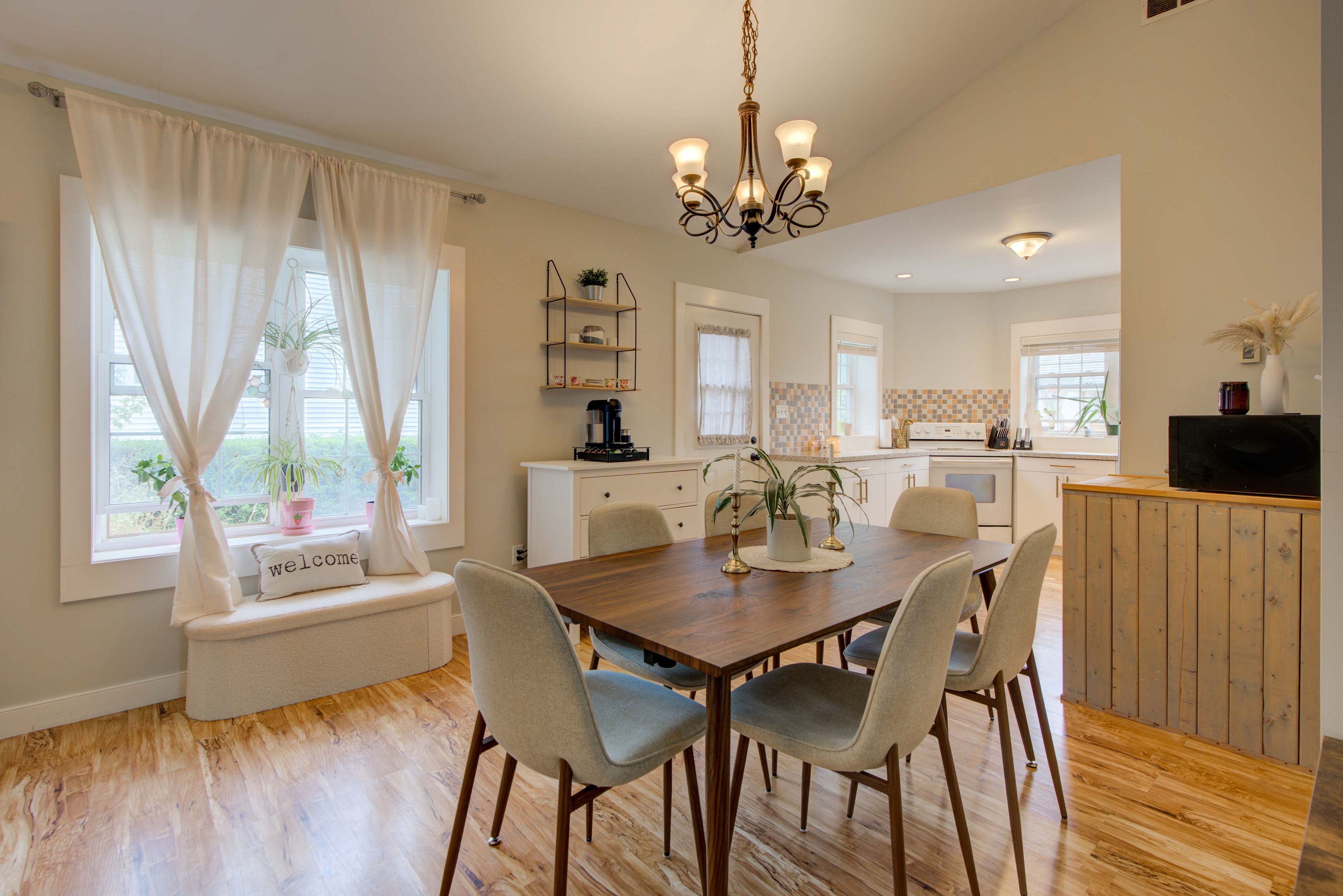 • Bright open-concept space with high vaulted ceilings for an airy atmosphere.
