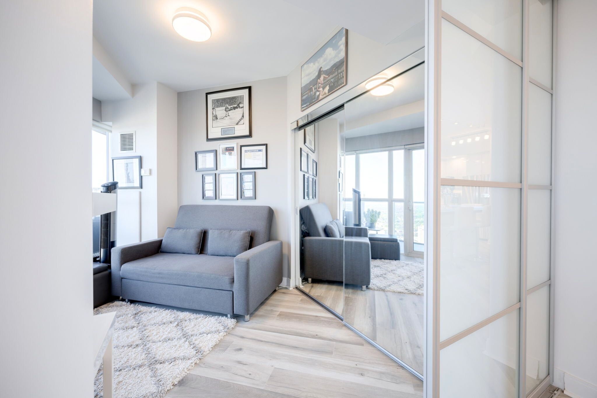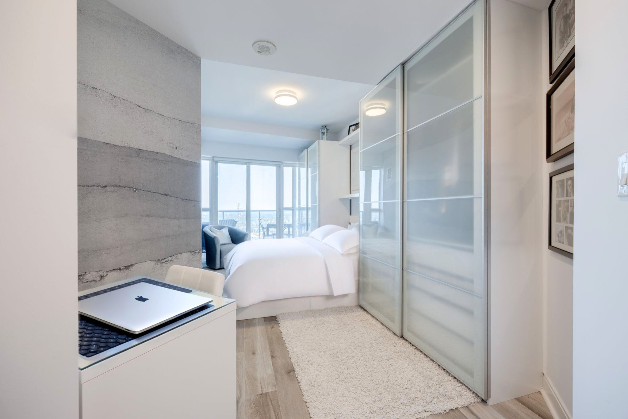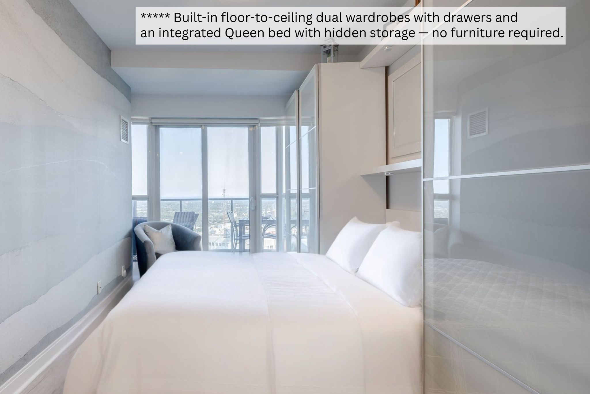 View: this fully renovated 1,105 sq. Ft. Contemporary residence offers panoramic, unobstructed views of the cn tower and lake ontario, framed by floor-to-ceiling windows and a 225 sq. Ft. Wrap-around terrace. Southeast exposure delivers stunning sunrises and exceptional natural light throughout the day. Kitchen: designed for modern living and entertaining, the custom kitchen features over 30 high-gloss cabinets, a custom tinted glass backsplash, and a striking 8-foot island with an led-lit glass countertop. Baths: both bathrooms have been fully renovated with high-end finishes for a cohesive, move-in-ready experience. Primary suite (integrated storage - no extra furniture required): the primary bedroom is intelligently designed with built-in floor-to-ceiling dual wardrobes with drawers and an integrated queen bed with hidden storage (hydraulic lift), eliminating the need for bulky dressers. The bed platform and wardrobes are included-just bring your queen mattress. Second bedroom/home office: comfortably accommodates a queen-size bed and dresser, featuring an oversized closet and direct access to the balcony. Smart tech: fully integrated smart home features with voice-controlled lighting throughout the main living areas let you set the ambiance effortlessly. Parking & storage: includes two premium parking spaces and a large storage locker, a rare offering in this location. Amenities: resort-style amenities include a fitness centre, indoor/outdoor pools, pickleball, basketball and squash courts, and 24-hour concierge. Lifestyle: located at mississauga's most iconic address, just steps to square one, dining, transit, and the upcoming lrt. Preferred closing: may 1, 2026 (negotiable) key upgrades: integrated primary suite storage, 8-foot island with led-lit glass countertop, smart lighting, two parking spaces. Don't miss out on checking the building website: https://60absolute. Ca/