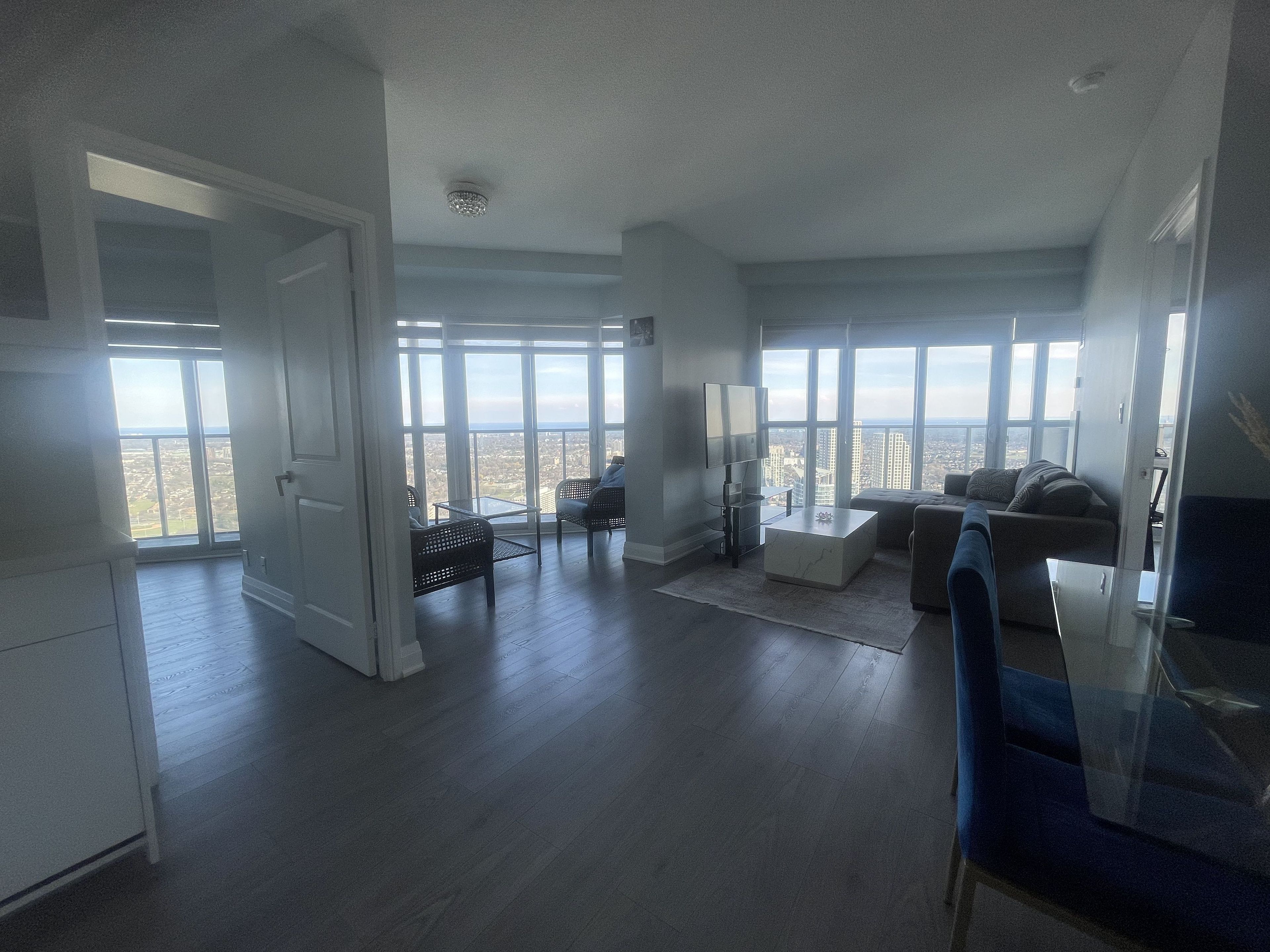 Experience upscale living in the heart of mississauga with this tastefully decorated, fully furnished 2 bedroom + den suite on the 46th floor, offering breathtaking panoramic views and abundant natural light. Featuring a practical open-concept layout with a desirable split-bedroom design, this spacious unit boasts upgraded flooring, newer bathrooms, and a modern kitchen, while the primary bedroom includes a private ensuite and his-and-hers closets. Enjoy seamless indoor-outdoor living with a walkout to a stunning wrap-around balcony. Parking's included. Residents have access to premium, state of the-art amenities including indoor and outdoor pools, a fully equipped gym, hot tub, sauna, basketball and squash courts, bbq/sundeck, media and party rooms, guest suites, and 24-hour concierge and security , making this an exceptional opportunity for luxury and convenience. Washer & dryer ( 2026)