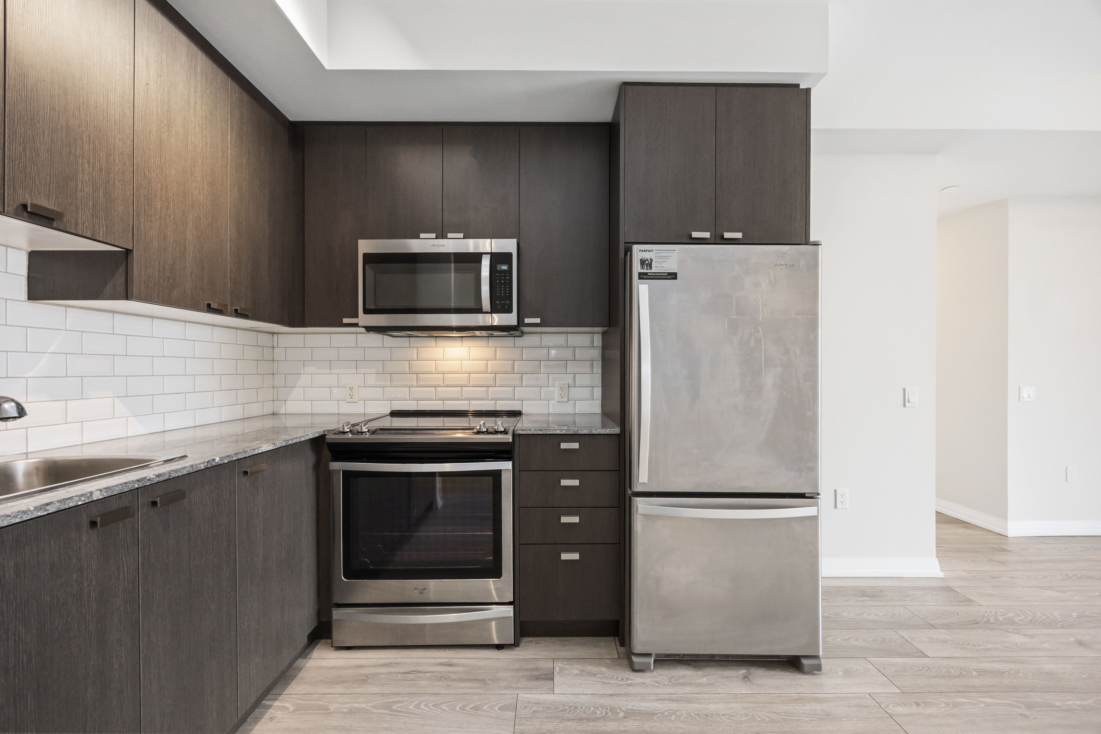 • Modern kitchen with granite countertops and stainless steel appliances.