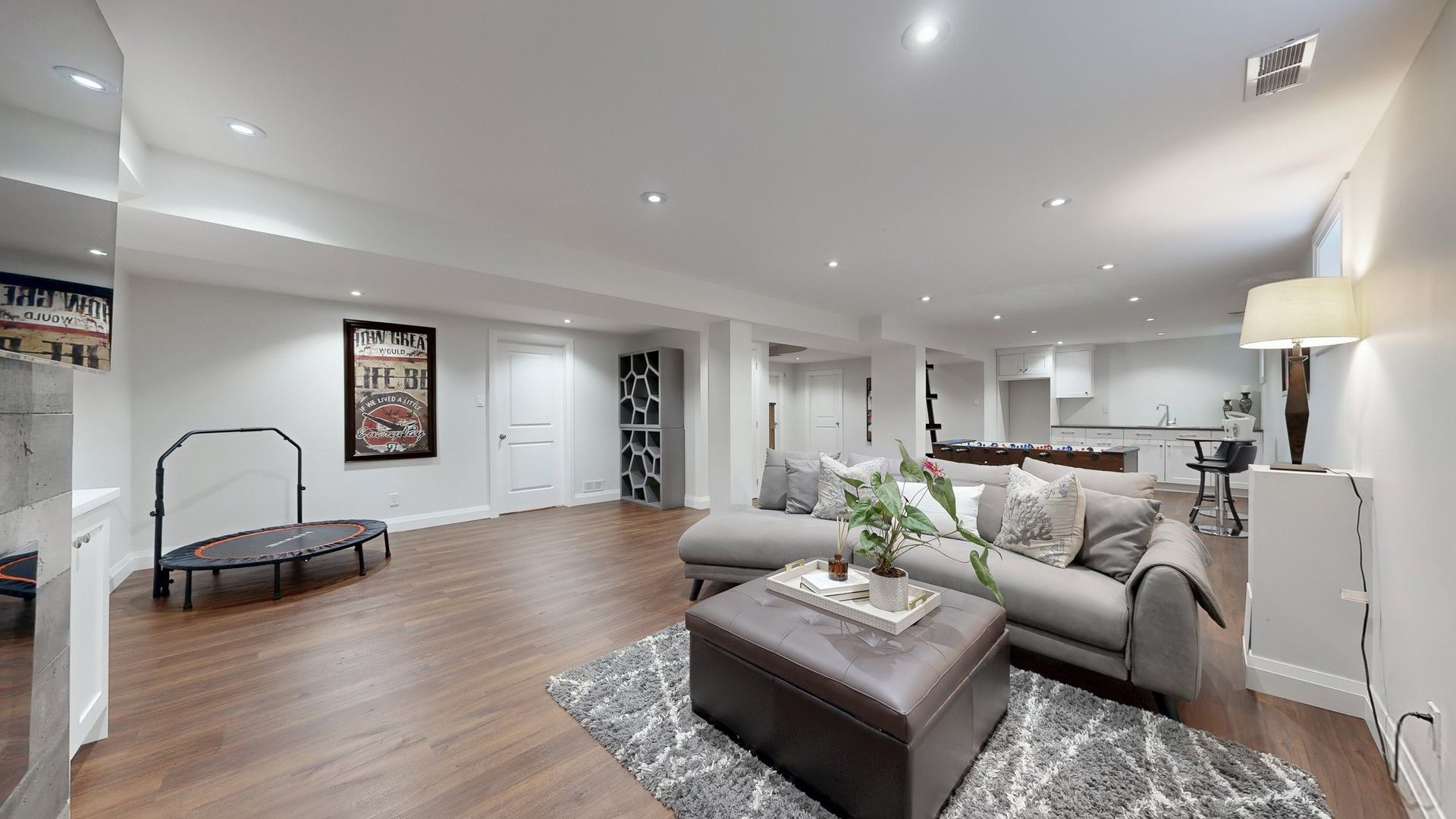 Stunning luxury 4+1 bedroom home with exceptional upgrades! This beautifully appointed residence features 10 ft ceilings on the main floor, creating a spacious and airy ambiance throughout. The gourmet kitchen is a chefs dream, complete with custom cabinetry, pull-out drawers, quartz countertops, designer backsplash, large center island, and premium stainless steel appliances including wall oven, microwave, fridge, built-in dishwasher. Enjoy seamless flow to the warm dining room and a unique, thoughtfully designed floor plan. The main level also offers a large foyer, elegant oak staircase, and a private library with built-in bookshelf and picturesque window. Upstairs, the primary suite boasts a large custom walk-in closet and a spa-like ensuite. All bedrooms are generously sized with neutral décor. The second-floor laundry room includes built-in shelving and a sink for added convenience. The professionally finished basement features a wet bar, spacious rec room, gym, storage room, and tool room. Additional highlights include upgraded light fixtures, led pot lights, custom window treatments, closet organizers, high baseboards, crown molding, and upgraded windows and patio doors (front and back). This home combines luxury, comfort, and functionality a must-see!