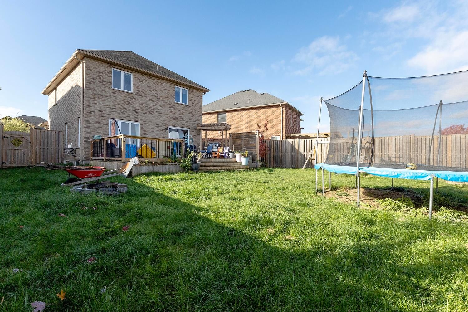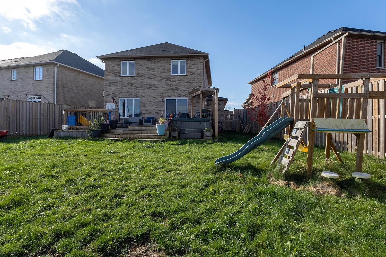 • Private fenced backyard with a large two-tier deck and hot tub.