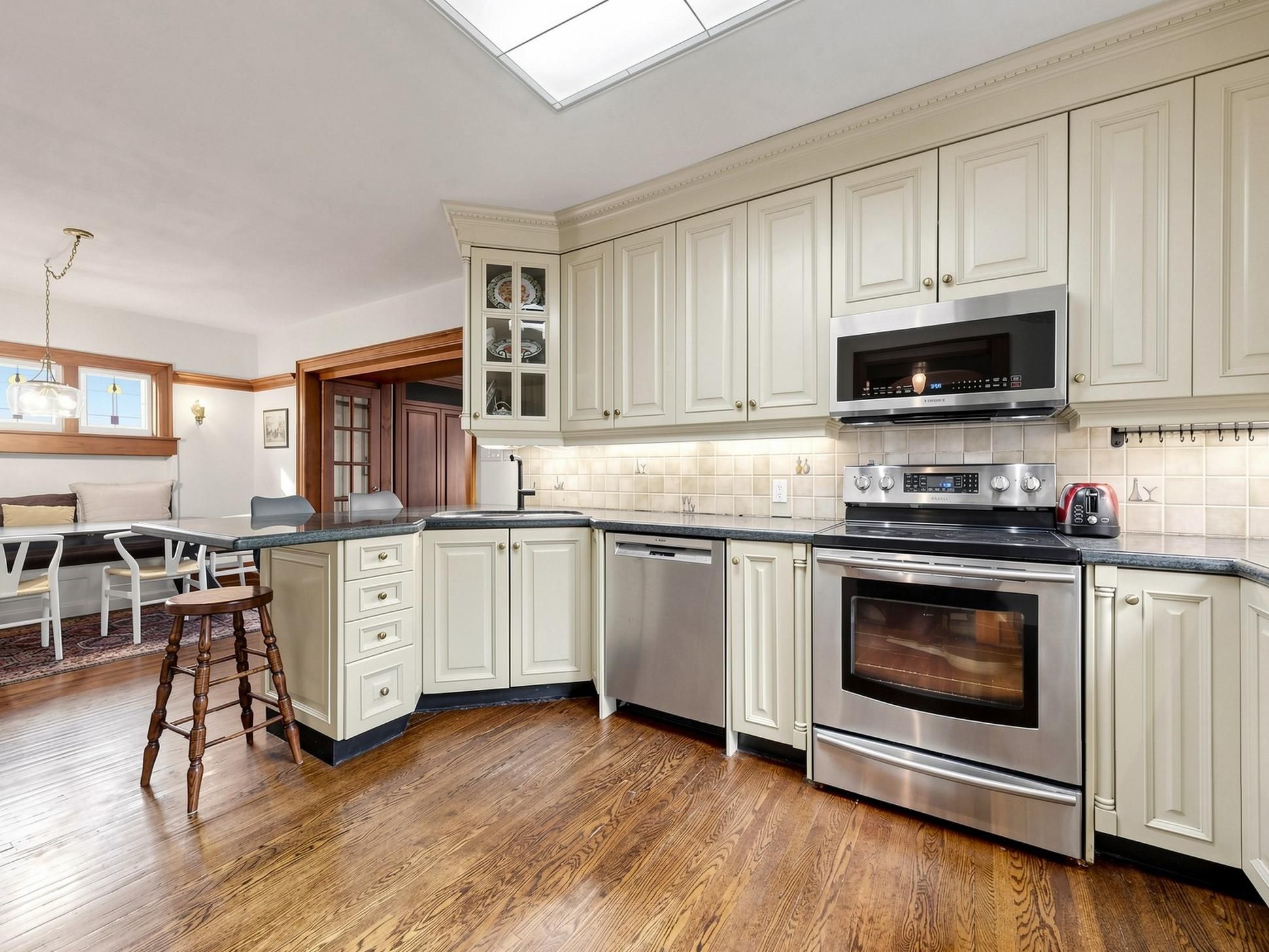 • Renovated kitchen with ample cabinetry and a sunny breakfast area.