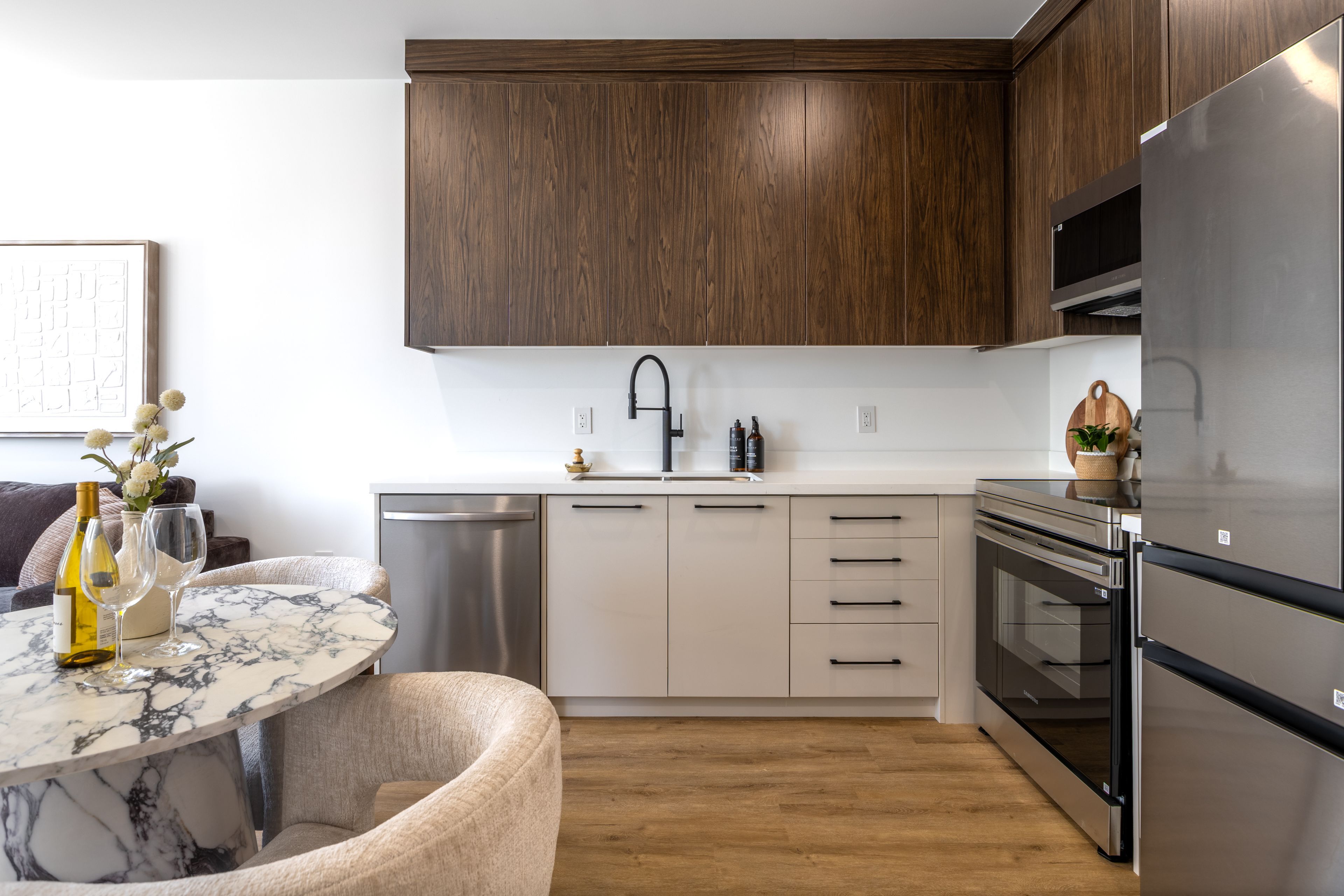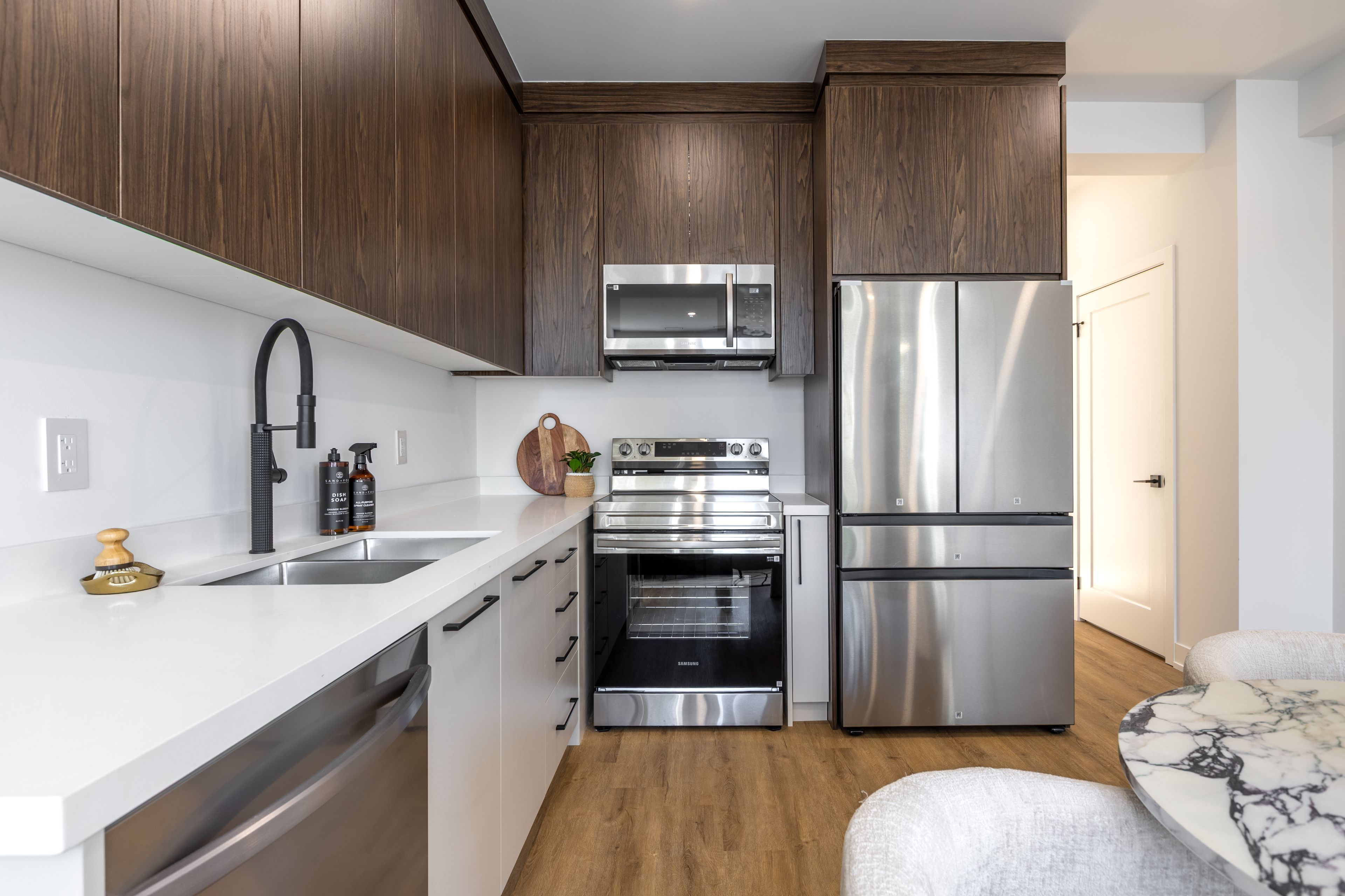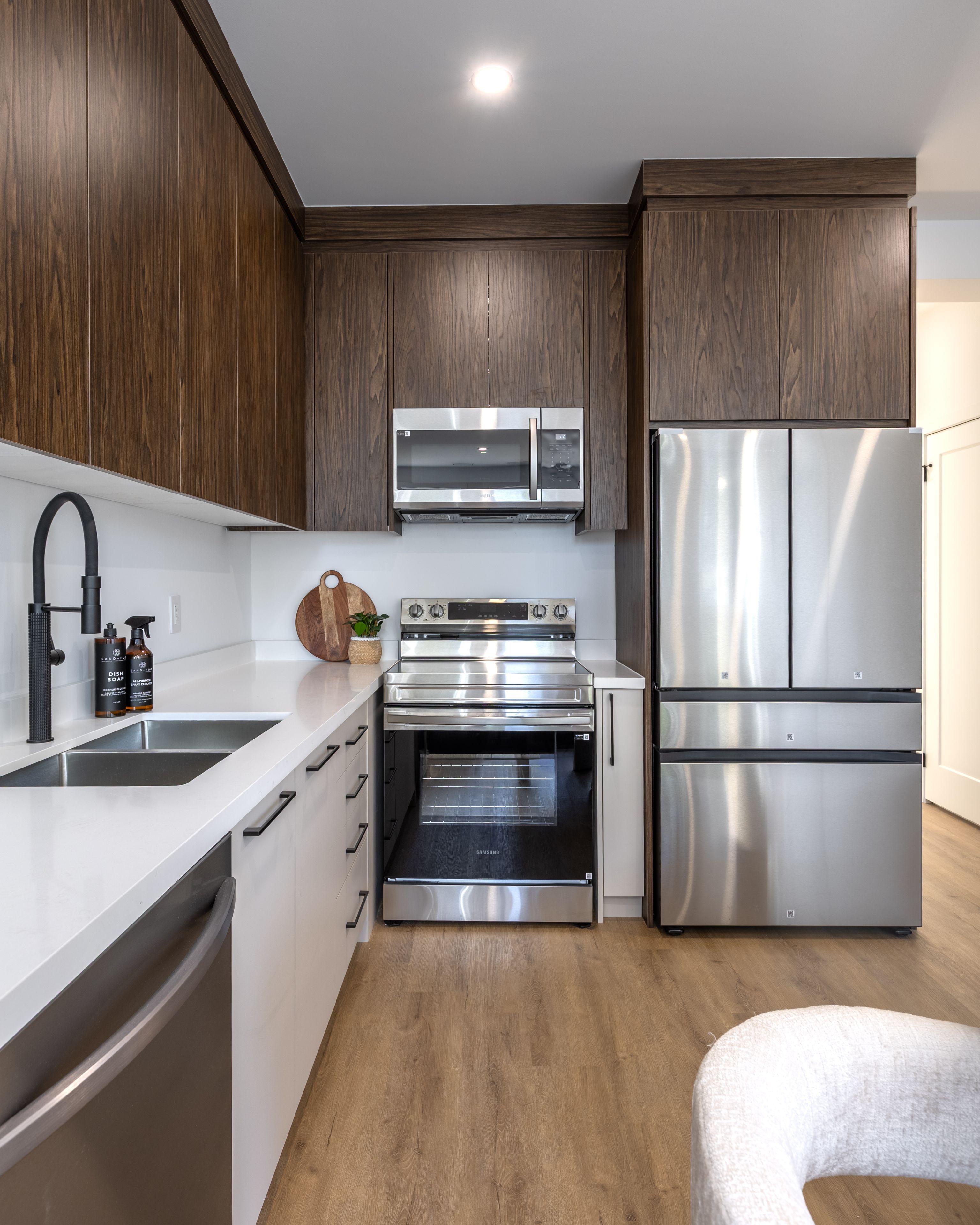 • Modern kitchen with quartz countertops and stainless steel appliances.