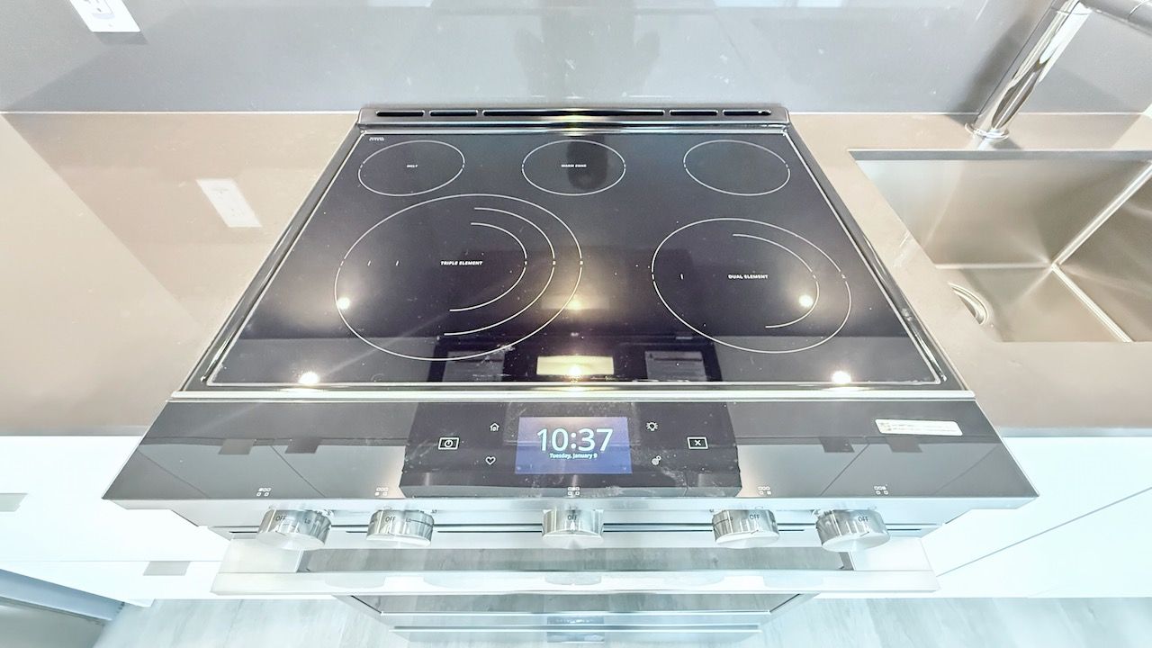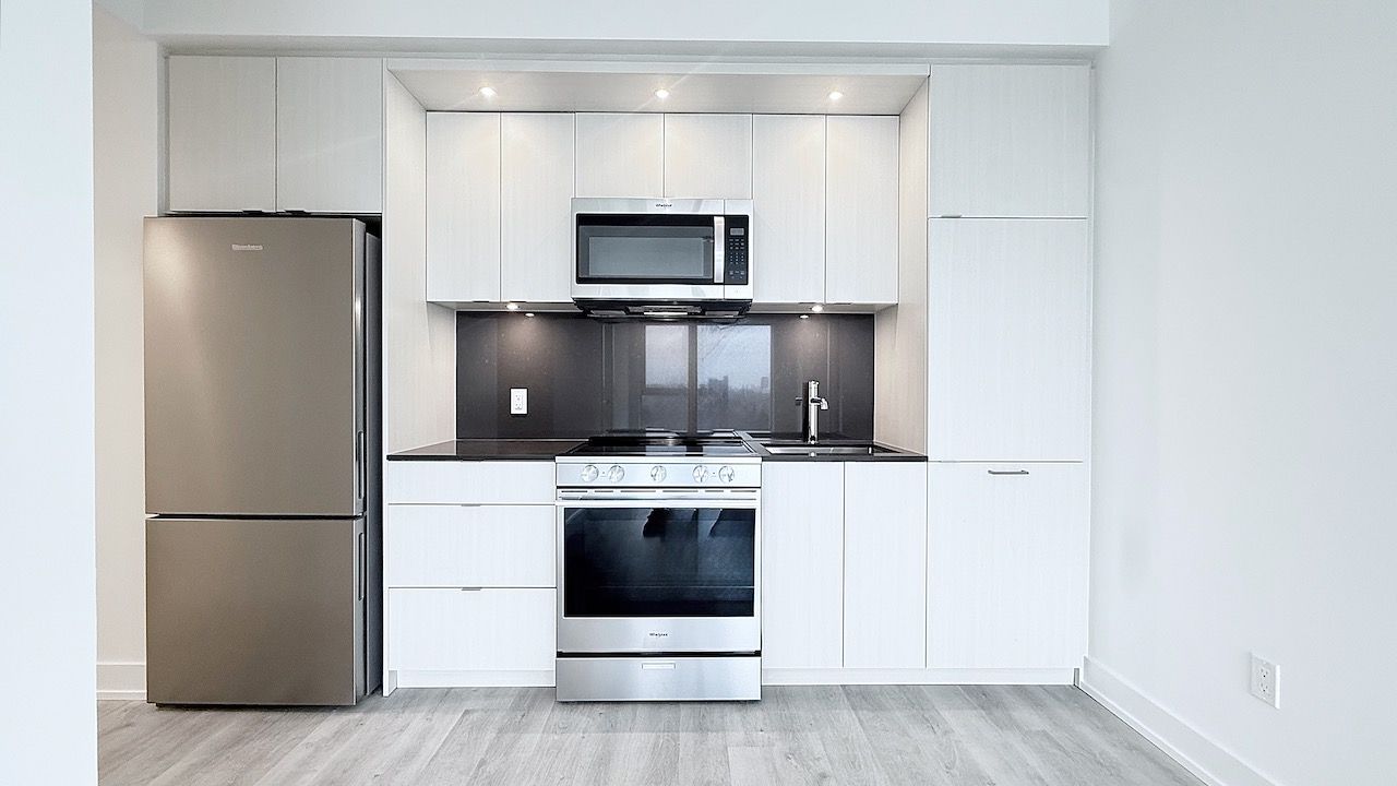 • Contemporary kitchen featuring full-size stainless steel appliances.